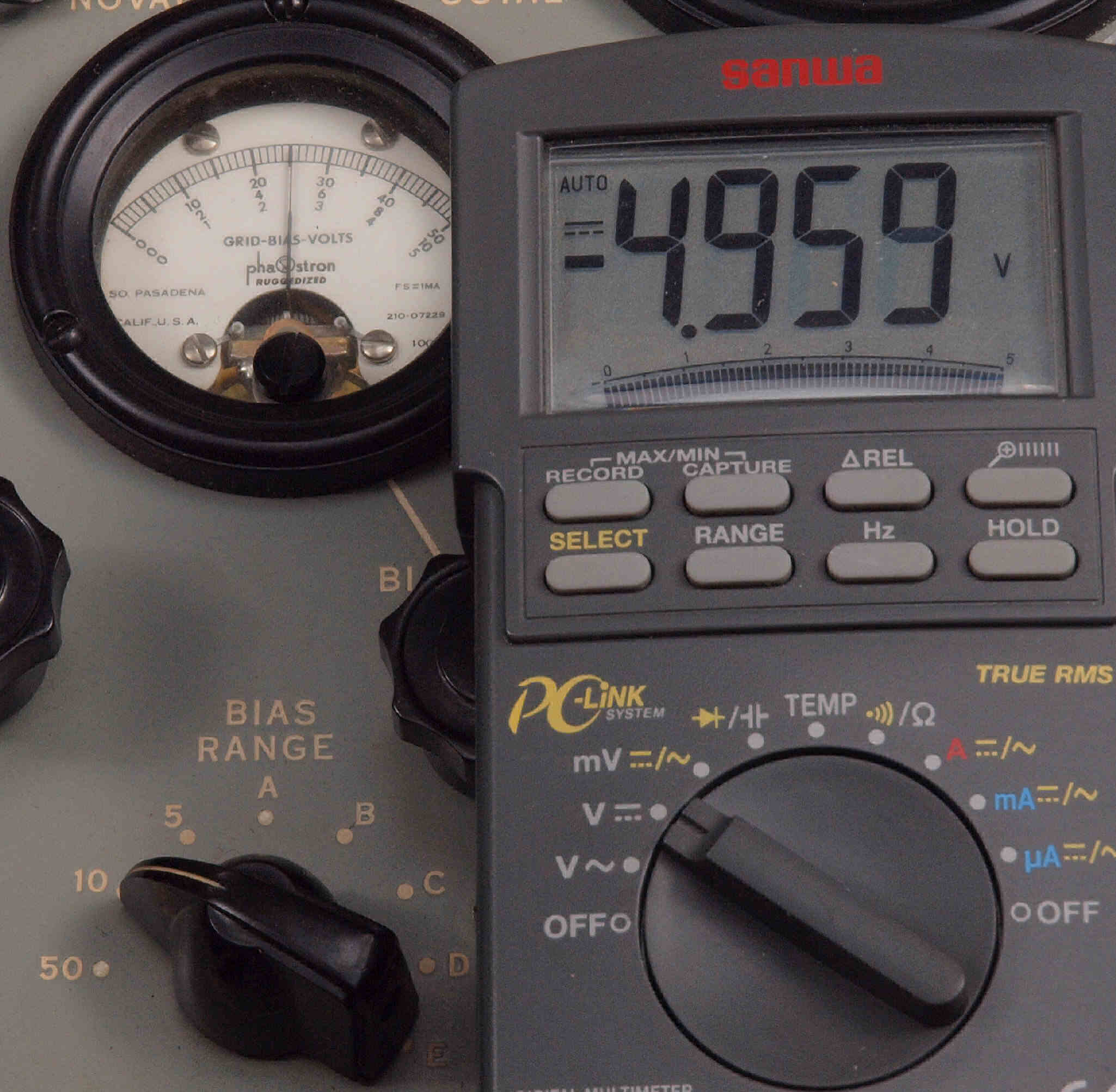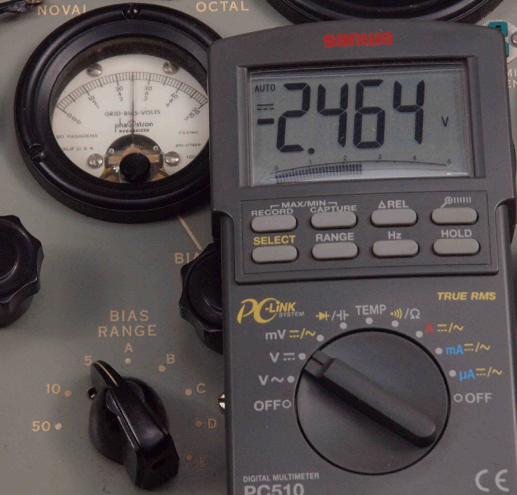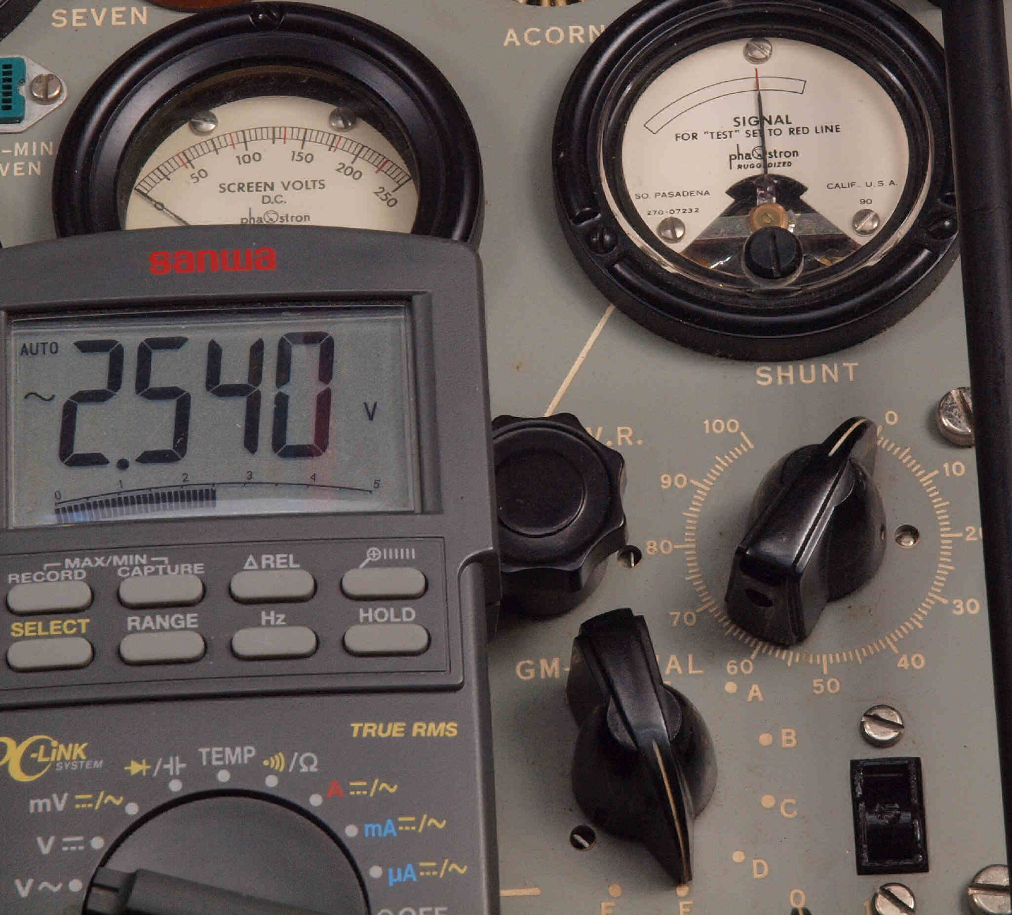 | J31. ブリッジを測定する、Gm−Calibration−Test。 Gm−SignalRangeSW=C、 Gm−CalibrationShuntVR=87.5=3,000μmho−FullScale(20倍読)。 上のテスター=ブリッジ電圧=37.5mV、下のテスター=Ip=76.9/50=1.54mA |
