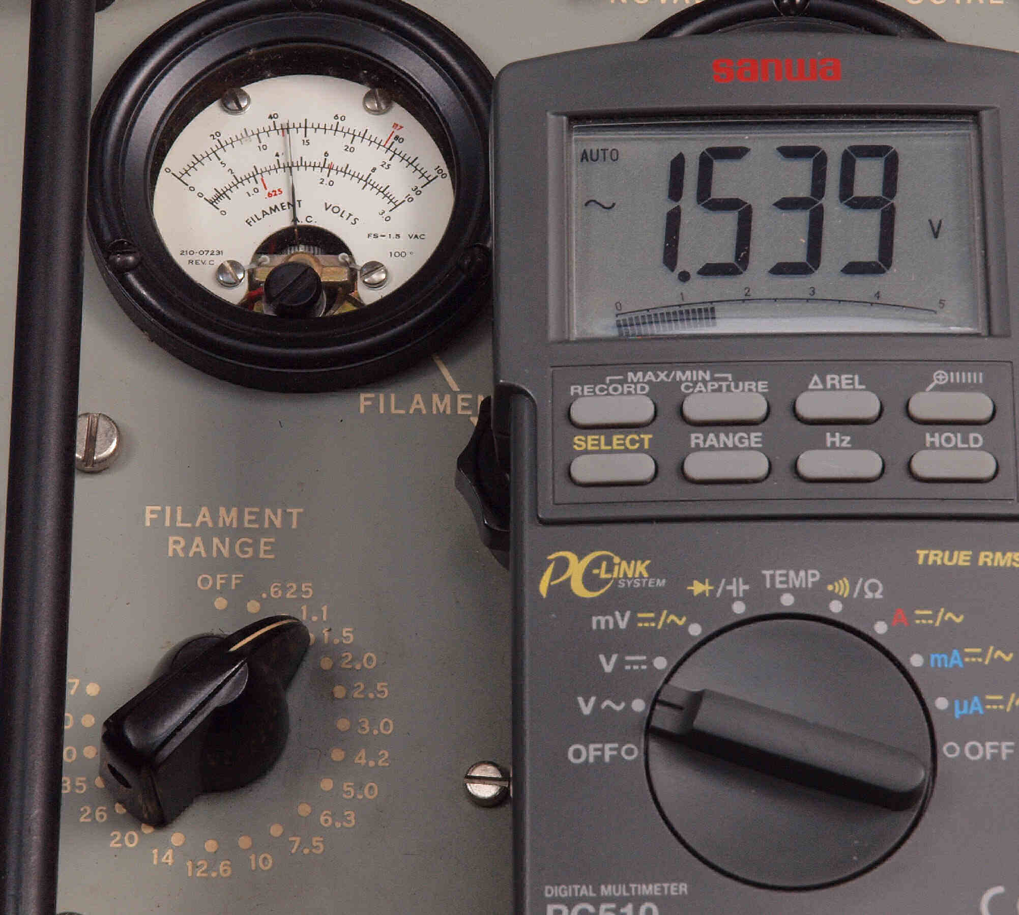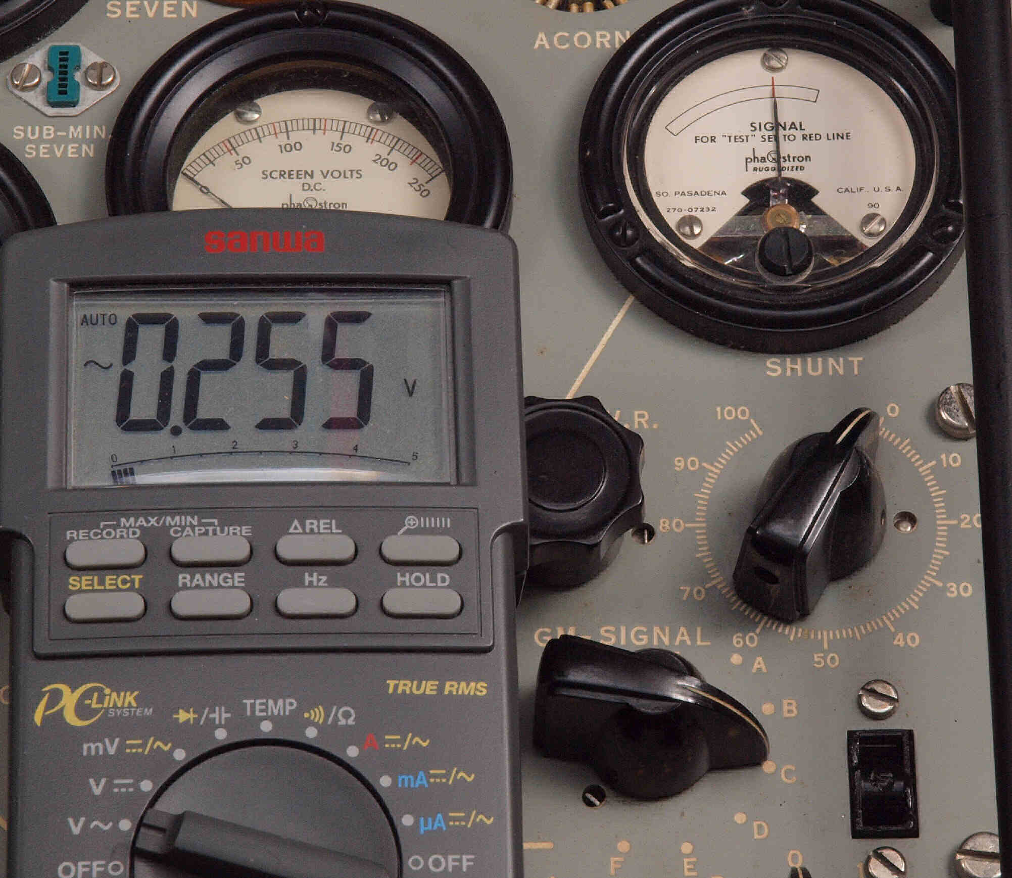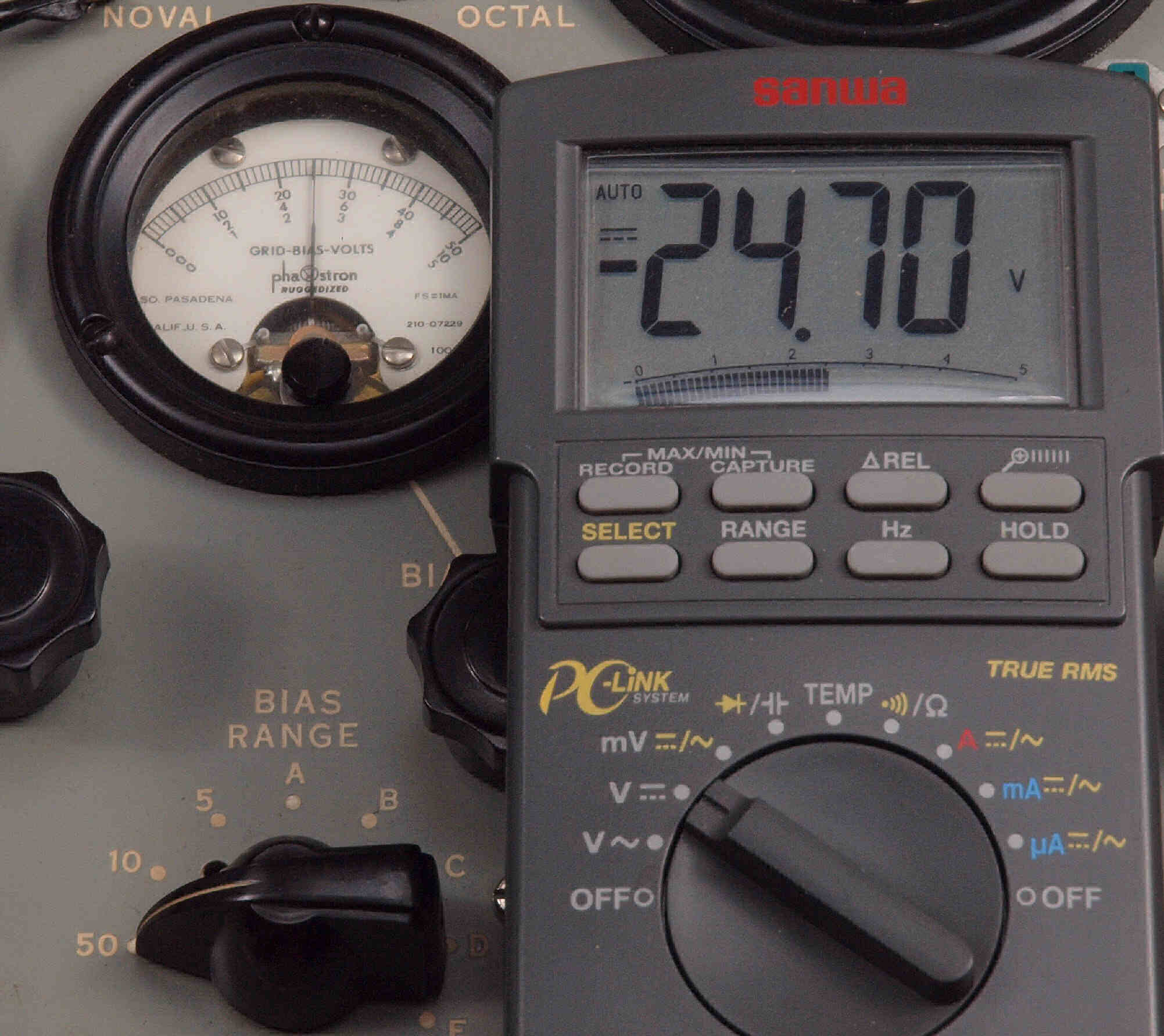 | J31. ブリッジを測定する、Gm−Calibration−Test。 Gm−SignalRangeSW=C、 Gm−CalibrationShuntVR=87.5=3,000μmho−FullScale(20倍読)。 上のテスター=ブリッジ電圧=37.5mV、下のテスター=Ip=76.9/50=1.54mA |