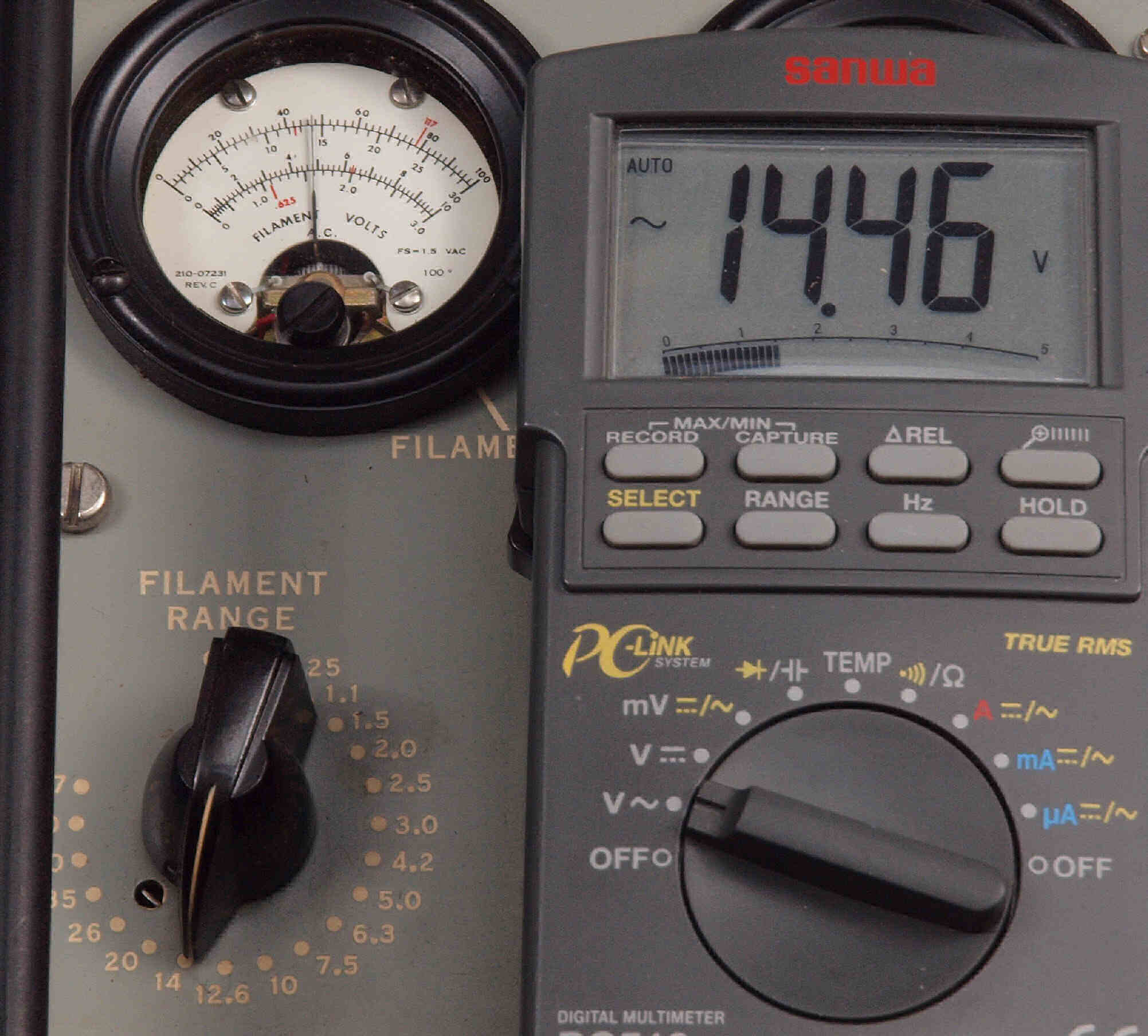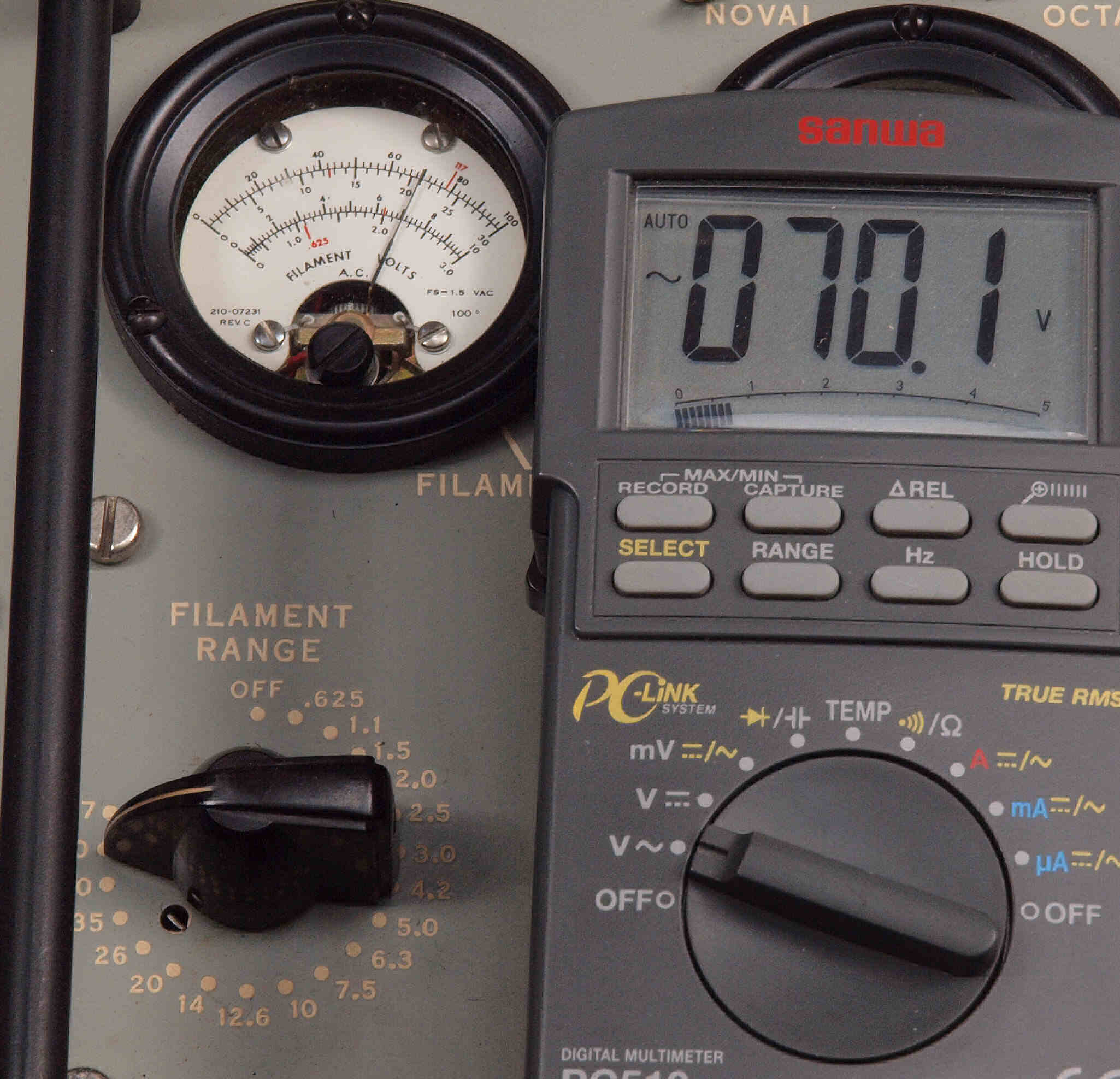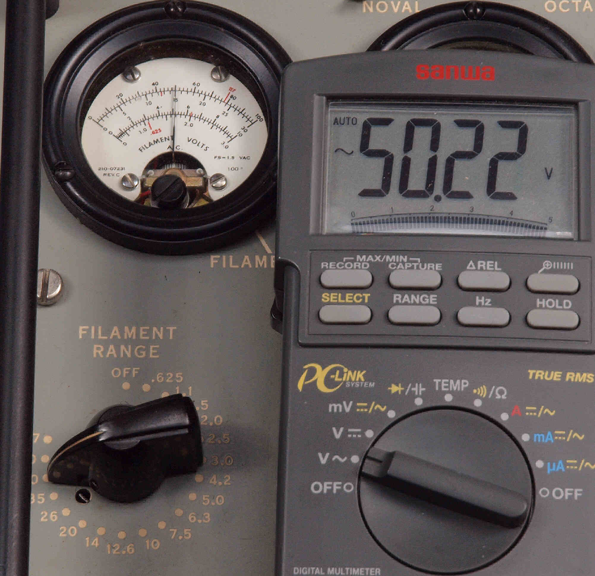 | 「整流管83」、「整流管5Y3GT」をダイオードに単純に交換すると、電源が強化する事になり、相互コンダクタンスの測定には信頼性(精度)が増すことになります。 しかし、チャートのAver.Mut.Cond.とは誤差がでます。又、他の試験方法にも誤差がでます。よって、回路の変更、全体的な調整・校正が必要となります。 | |||||||||||||||||||||||||||||||||