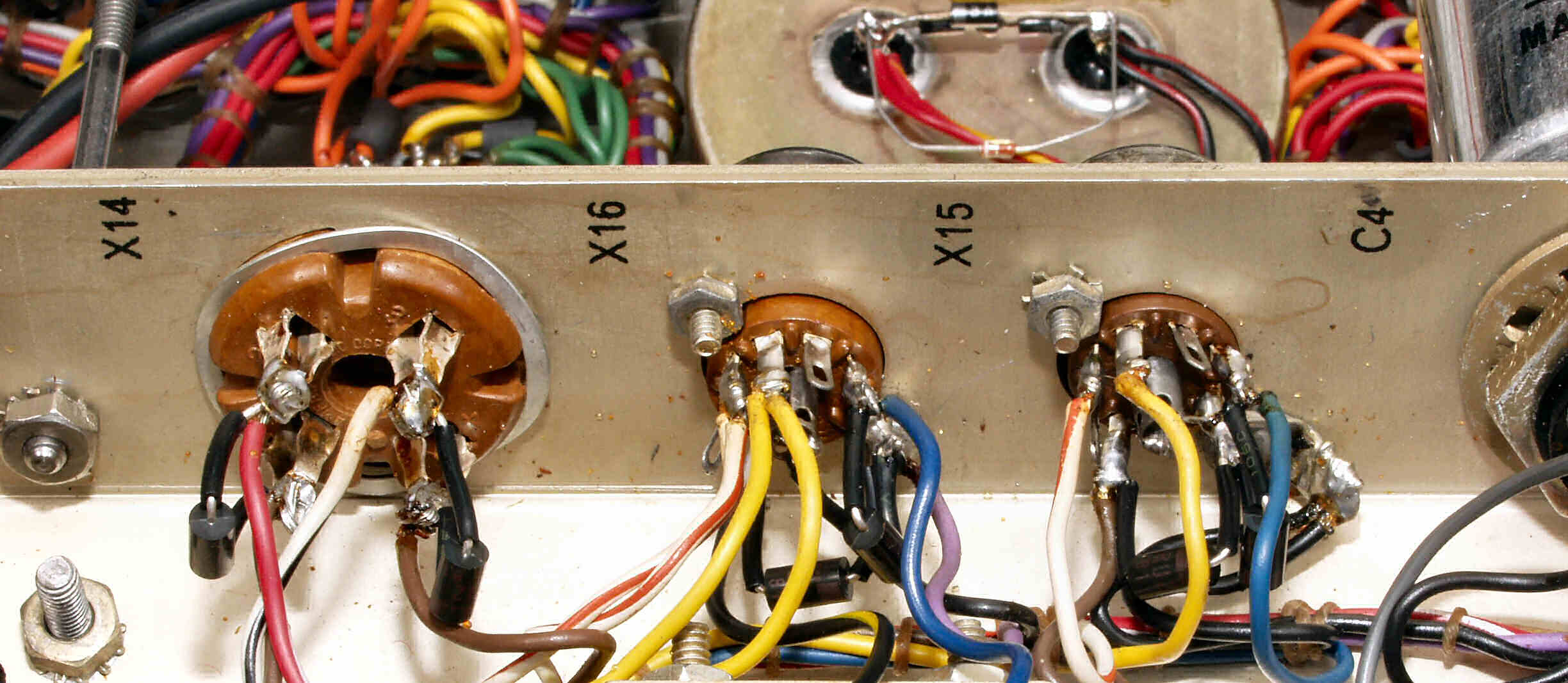 | C16. 修理中 2液性プラスチック接着材で補修する、さらにラッカーペイントを軽く吹き付ける。 このソケットを利用してプレート電流を測定する。 |