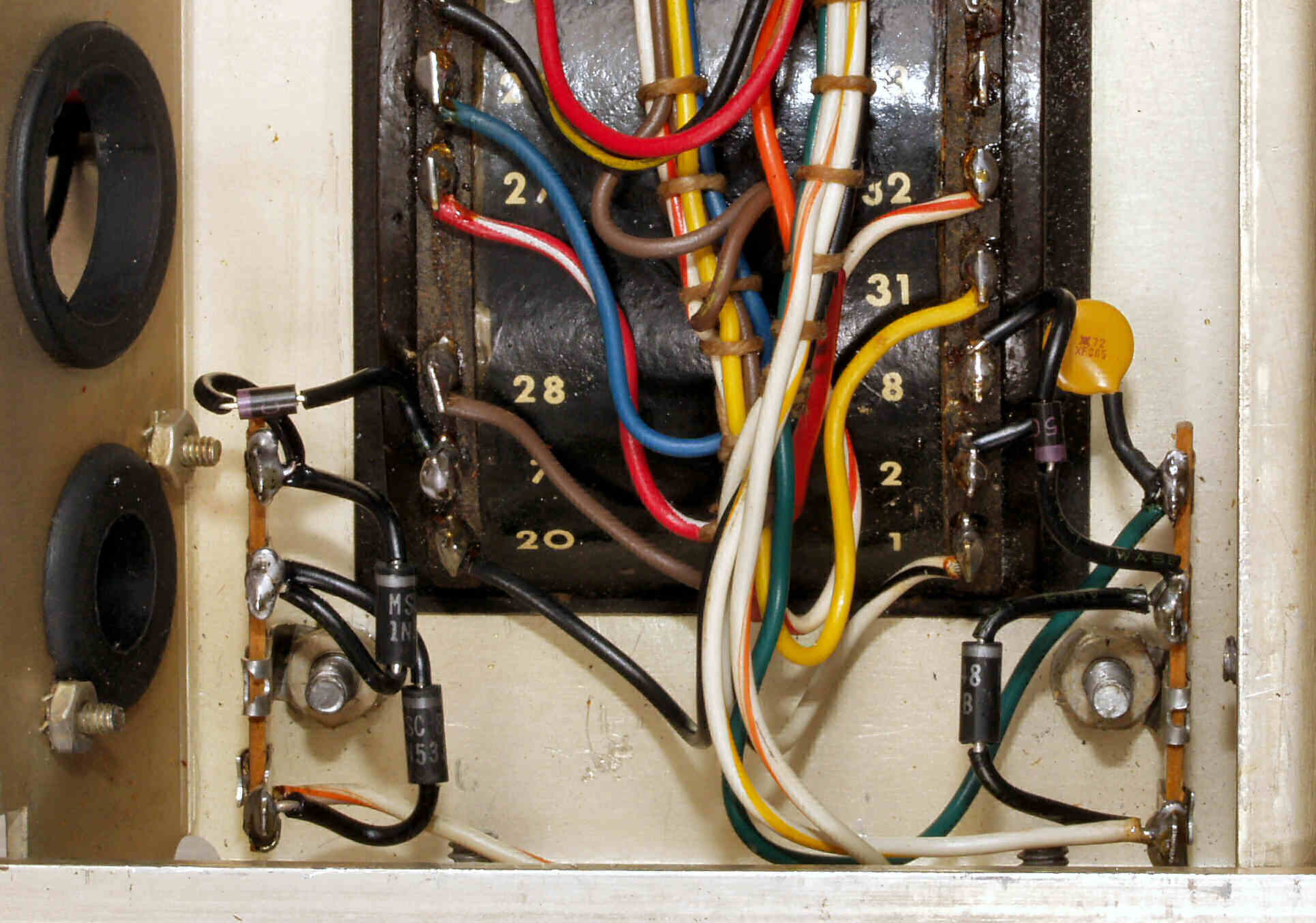 | C81. 「整流管83」、「整流管6X4」をダイオードに交換しましたので以下の確認・調整が必要です。 1. Filament Voltage=電圧の確認する。 2. Plate Voltage= G・H・J=250V、K・L・M=125V、N=O=90V,Q=62.5V。 AC電圧は下記。 3. Screen Voltage G=DC250V〜225V、H・K=180V、J・L=135V,M・N=90V、P=45V。 4. Grid Bias Voltage 50Vレンジ=−50Vmax、10Vレンジ=−10Vmax、5Vレンジ=−5Vmax 。 5. Grid Signal Voltage A・B・C=AC0.25V、D=AC0.5V、E=AC2.5V。 6a. Rectifirt Test Voltage AC20V=以下の様にゼナーダイオード+ダイオード挿入(下写真右下2個)。 6b. Rectifirt Test Voltage AC35V=以下の様にゼナーダイオード+ダイオード挿入(下写真左上1個)。 左下端の丸い黄色いのはポリSWで1.5Aで遮断する。 7. Short Test Voltage=ShortTest SW Sect4Rear No11と抵抗「R35」の間に抵抗を挿入して調整する。 8. その他改造場所。 a. 節電の為、Filamentトランス1次に挿入してある1KΩをはずす。 但し、調整は真空管挿入後行う事。 b. 電圧調整範囲の拡大の為、Screen調整VR(R54)と10KΩ(R55)を直列に接続する。 |