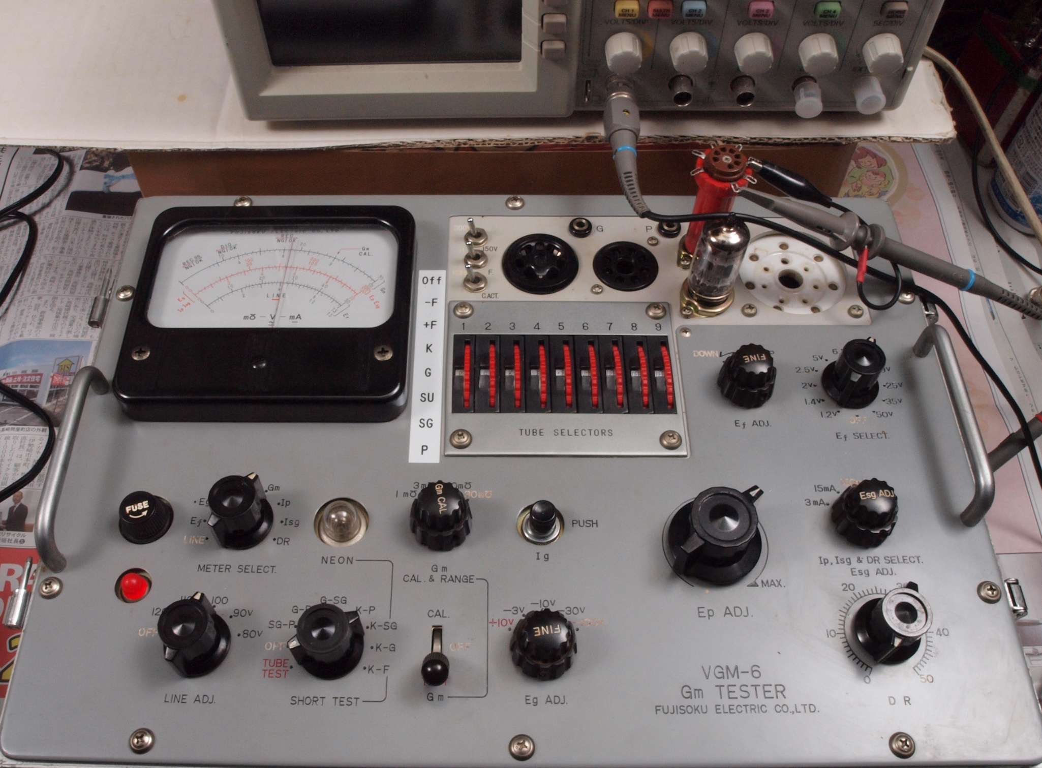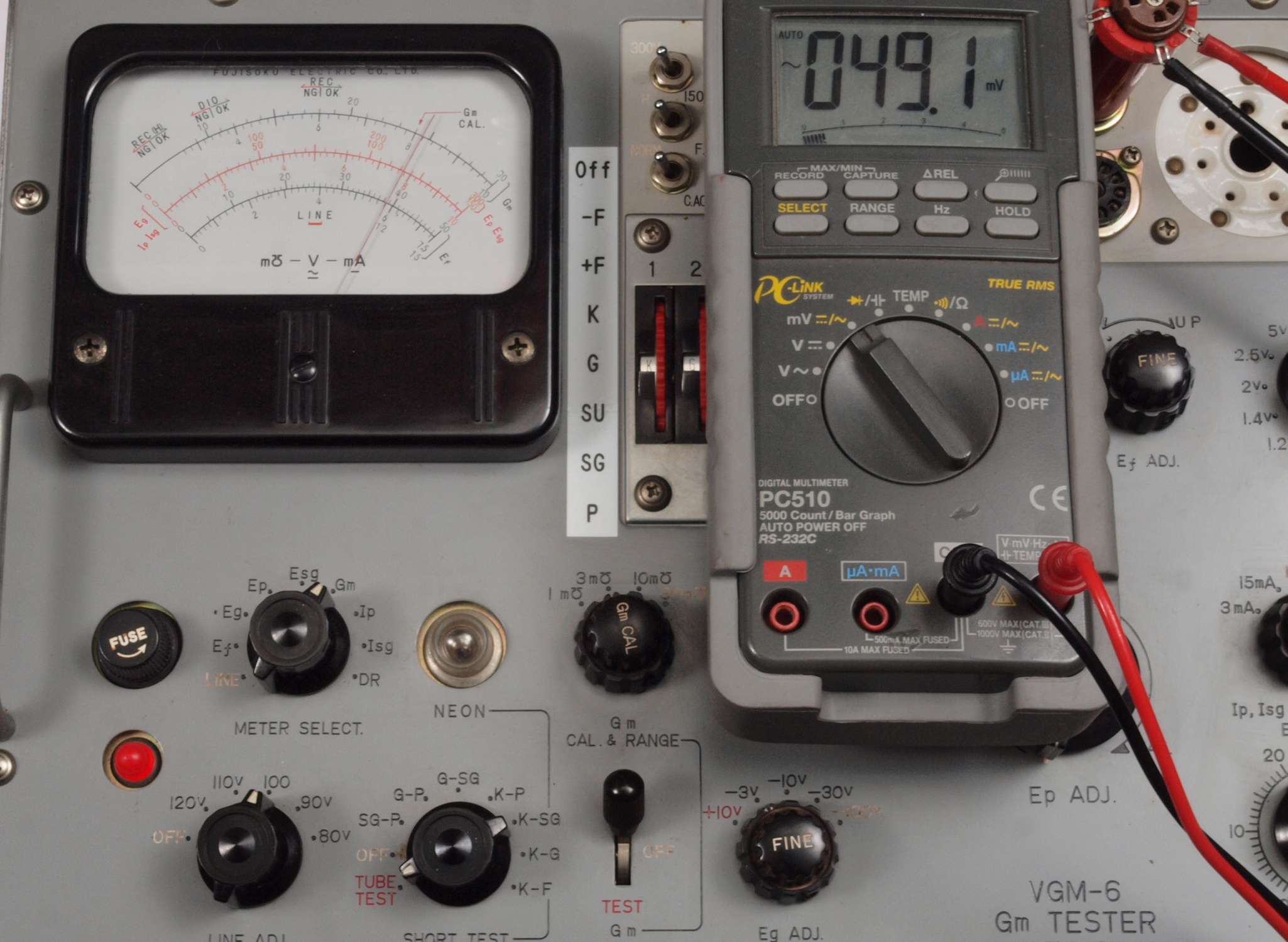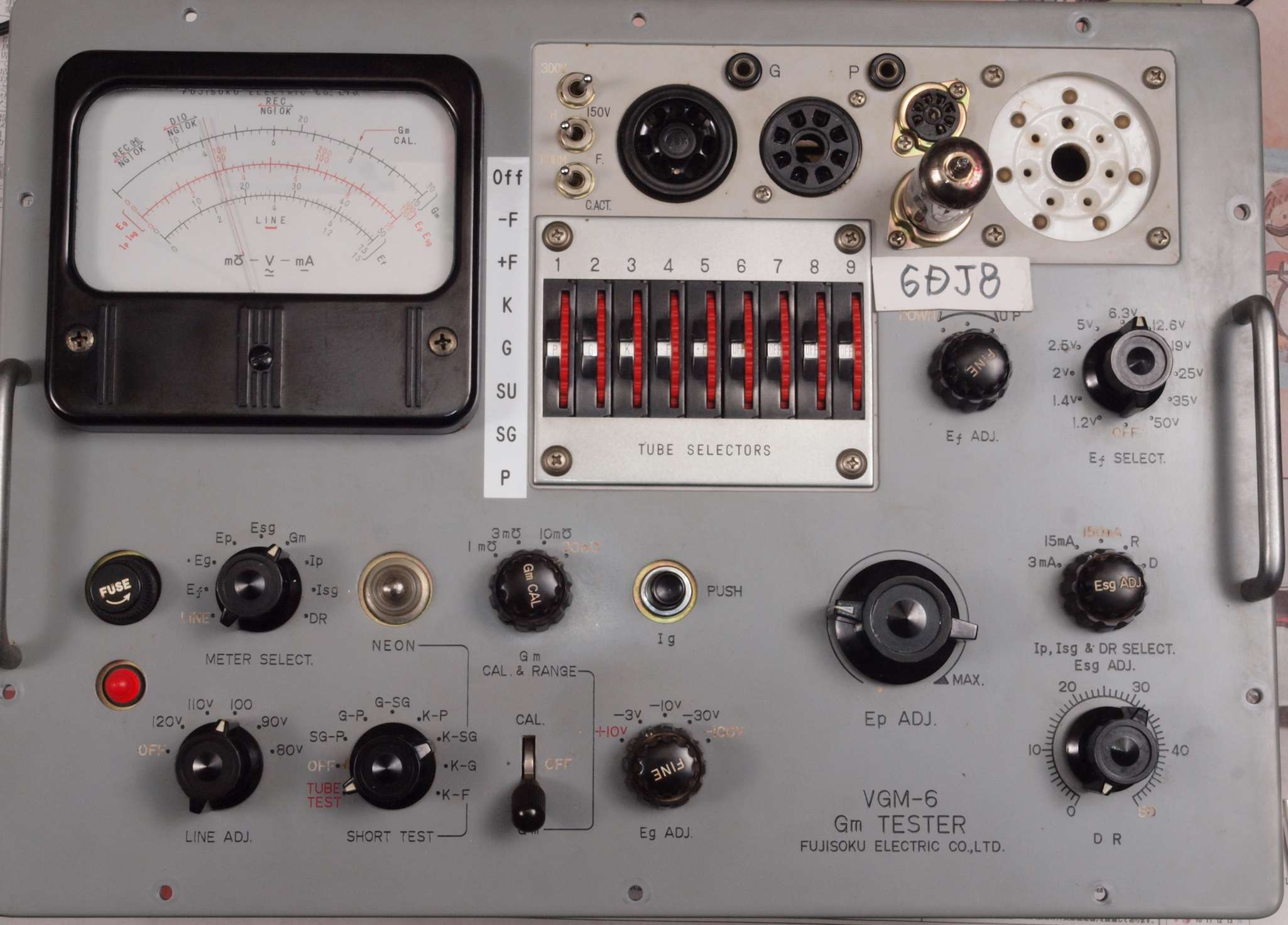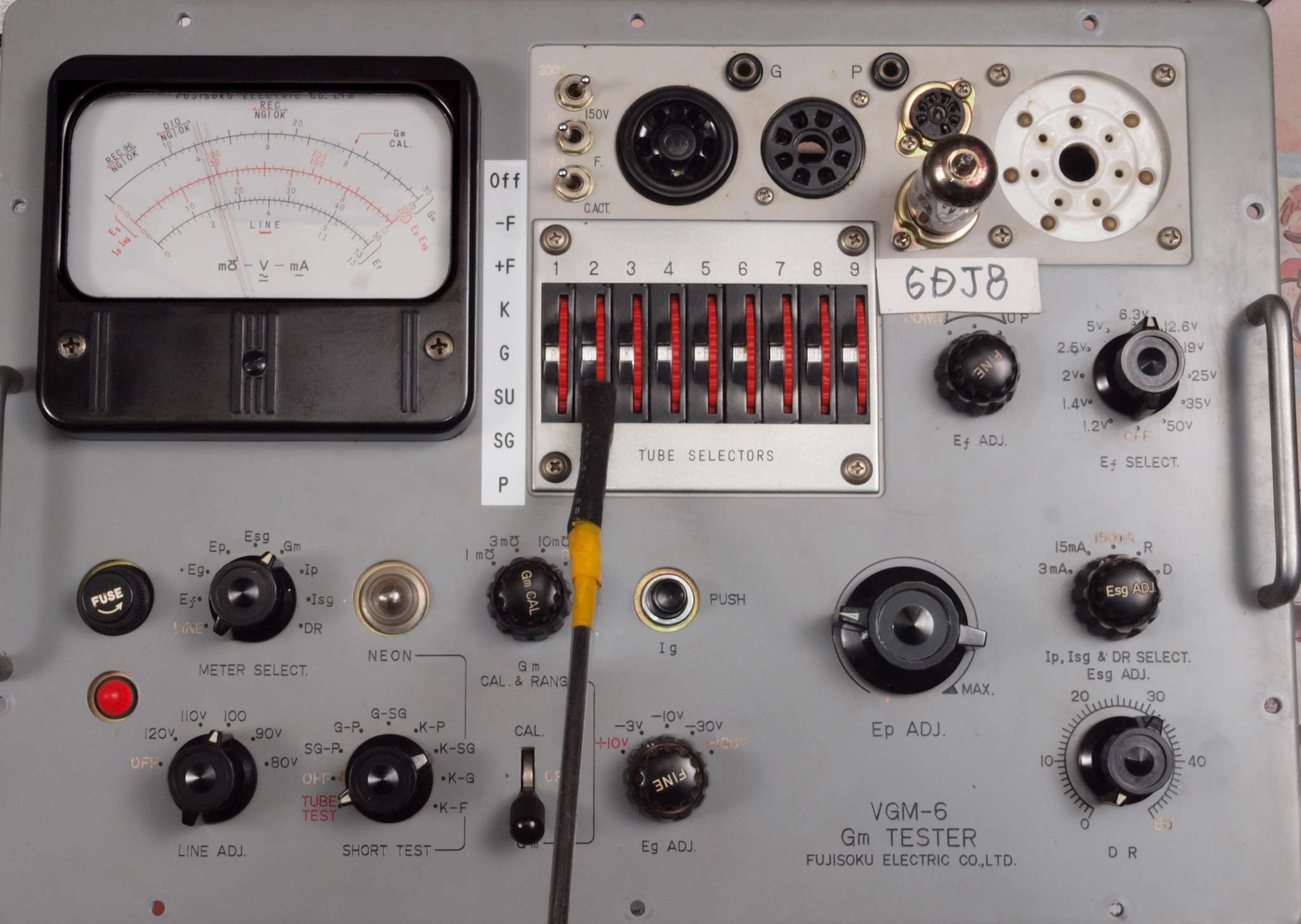 | F1. 6DJ8」ユニット1測定。 Gm測定=9500μmho。 測定条件、Ep=90V、Eg1=−1.3V、レンジ=30000μmhoでの測定。 真空管規格表の相互コンダクタンス=12250μmho「Ep=90V、Ip=15mA、Eg1=−1.3V」 1960/1962ナショナル真空管ハンドブック、全日本真空管マニュアル、オーディオ用真空管マニアル、69'東芝電子管ハンドブック、RC-30 Receiving Tube Manualより。