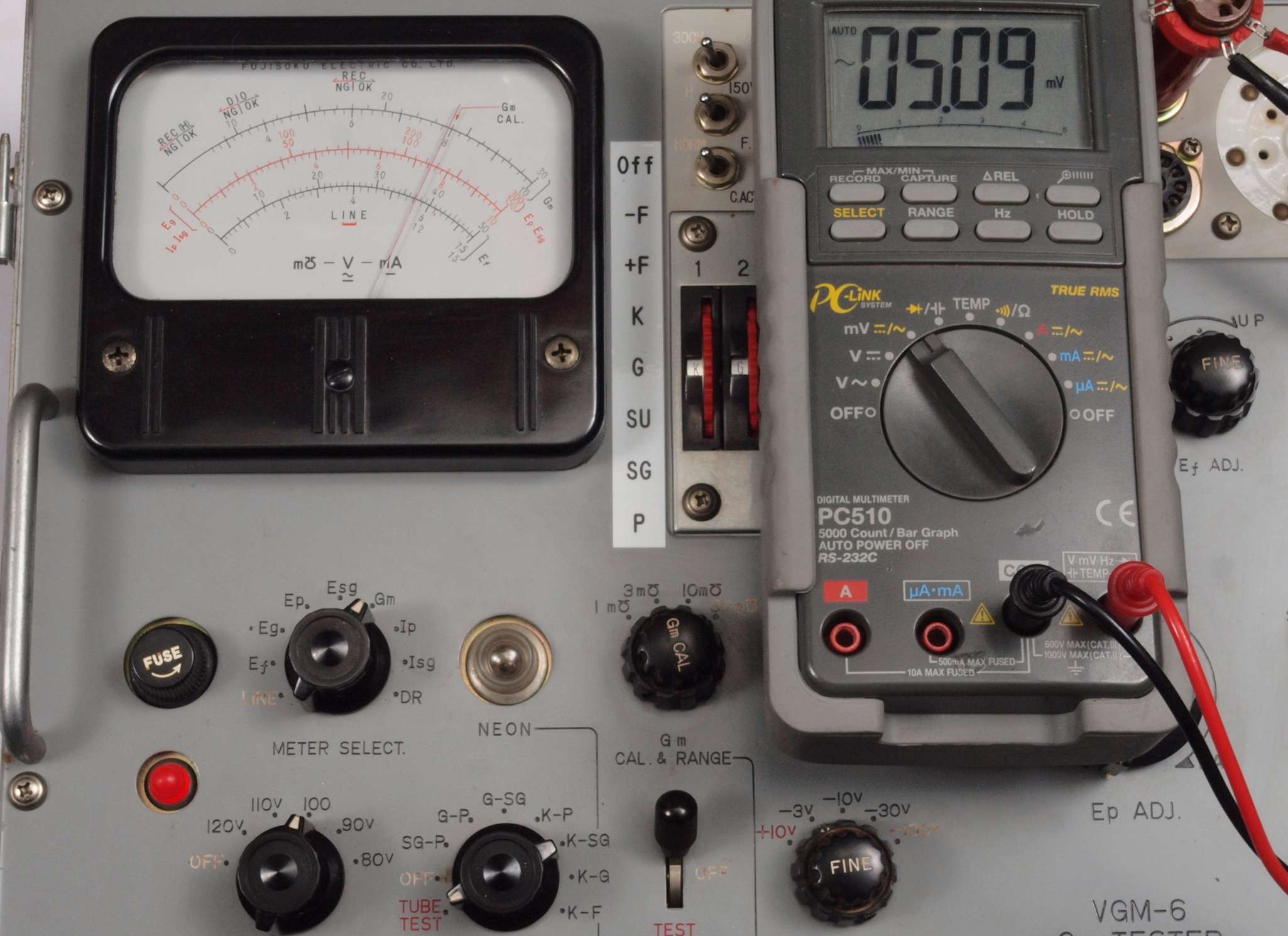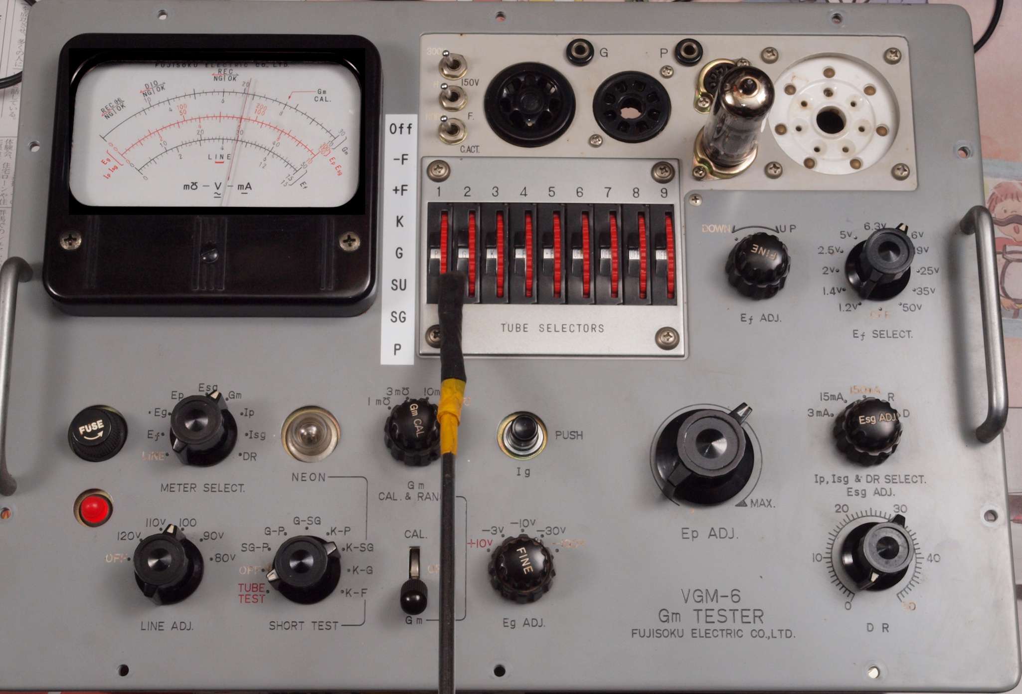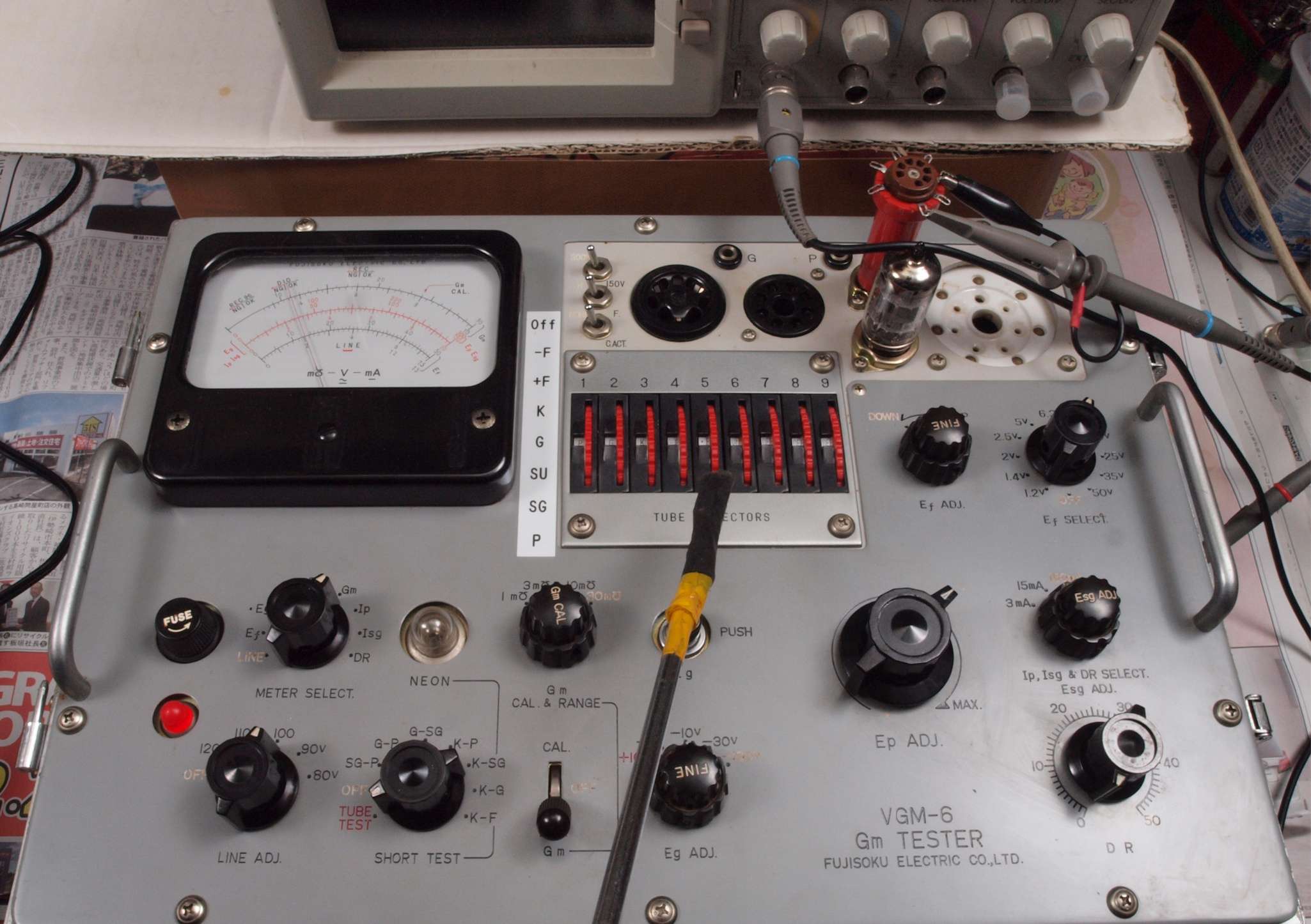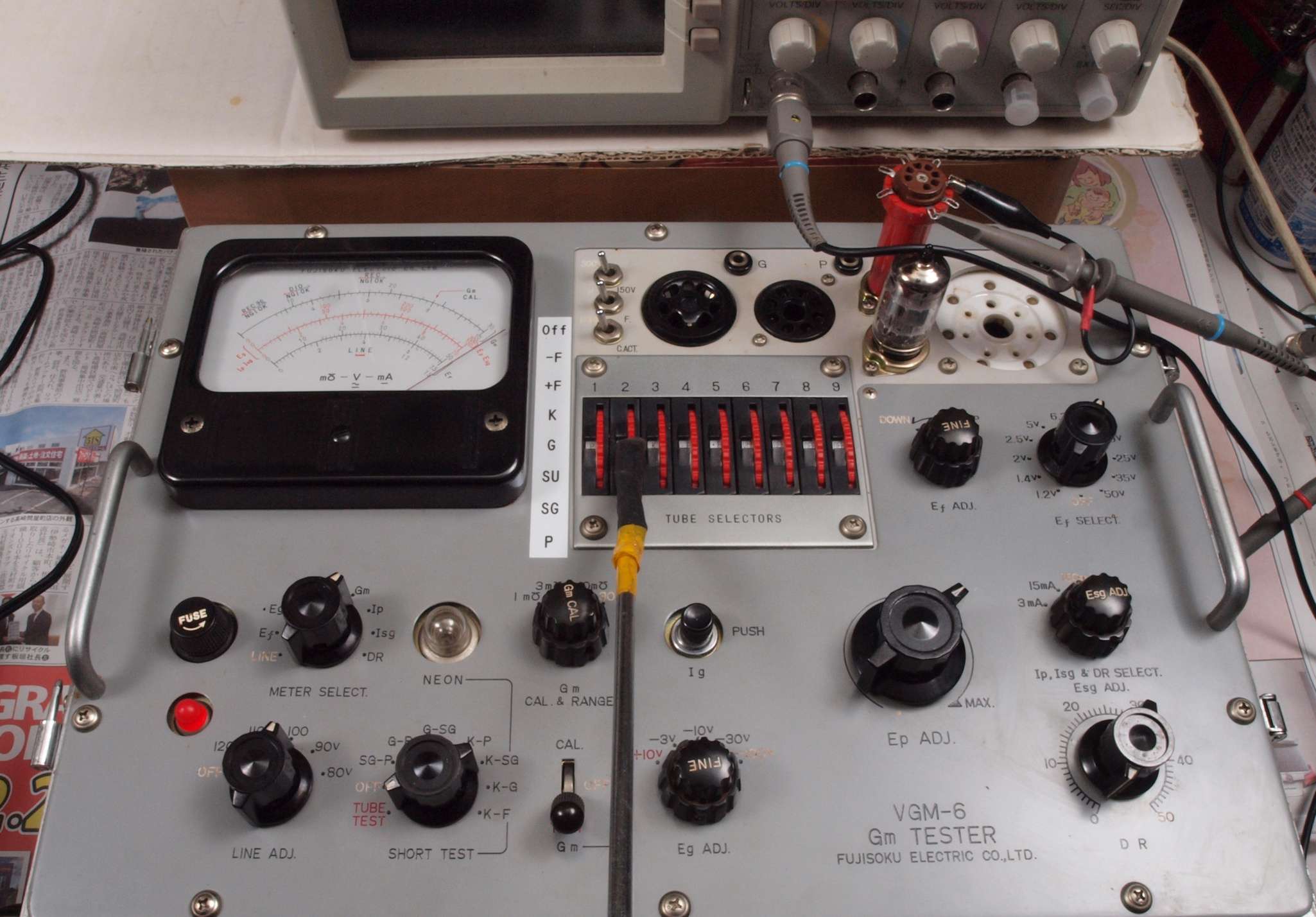 | F1. 6DJ8」ユニット1測定。 Gm測定=9500μmho。 測定条件、Ep=90V、Eg1=−1.3V、レンジ=30000μmhoでの測定。 真空管規格表の相互コンダクタンス=12250μmho「Ep=90V、Ip=15mA、Eg1=−1.3V」 1960/1962ナショナル真空管ハンドブック、全日本真空管マニュアル、オーディオ用真空管マニアル、69'東芝電子管ハンドブック、RC-30 Receiving Tube Manualより。