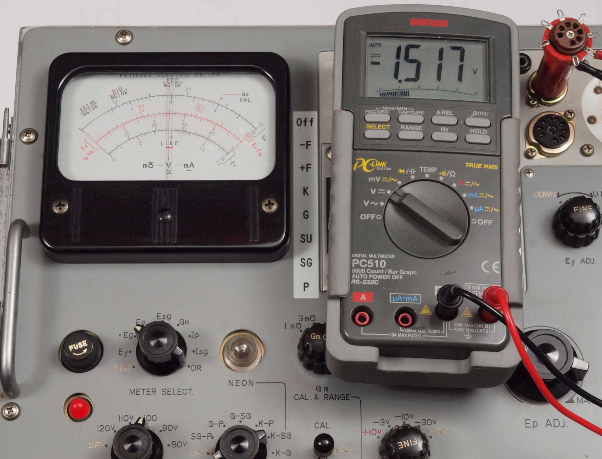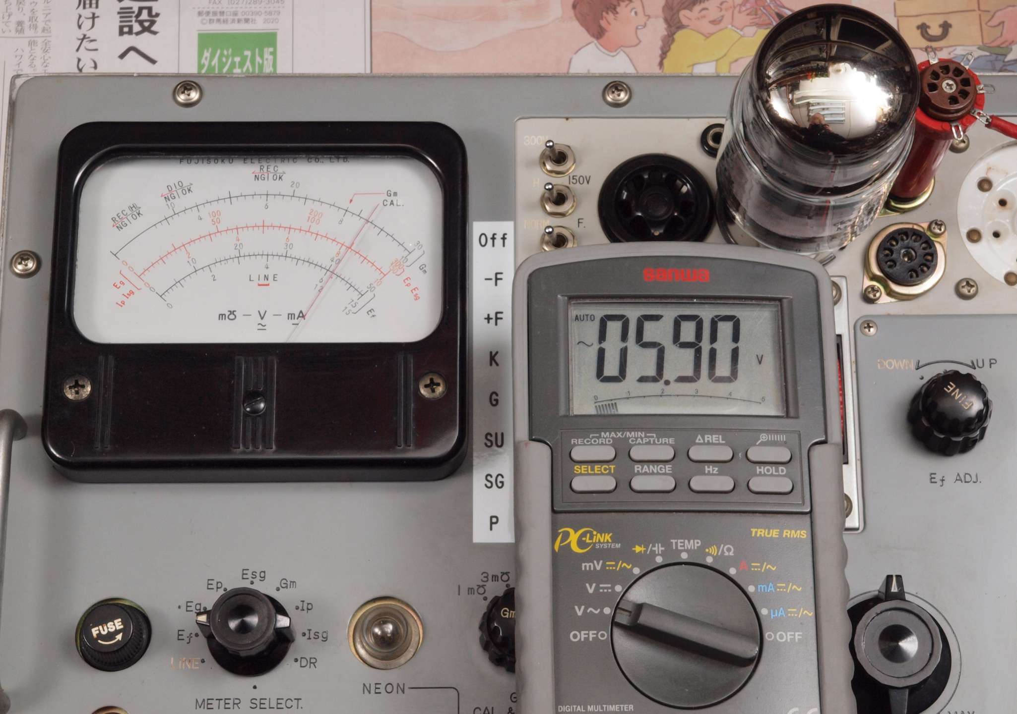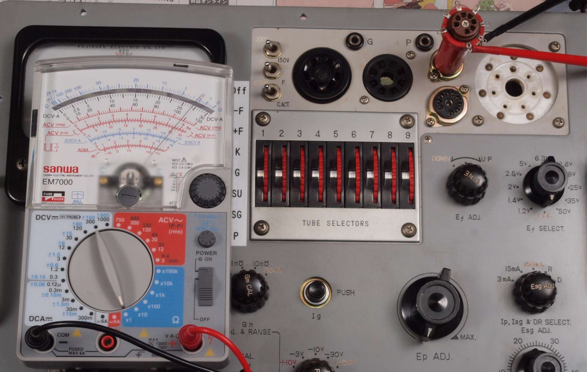 E2. 真空管ピン選択ホイール2番のGの所をドライバーで叩くと、接触不良でフルスケール。