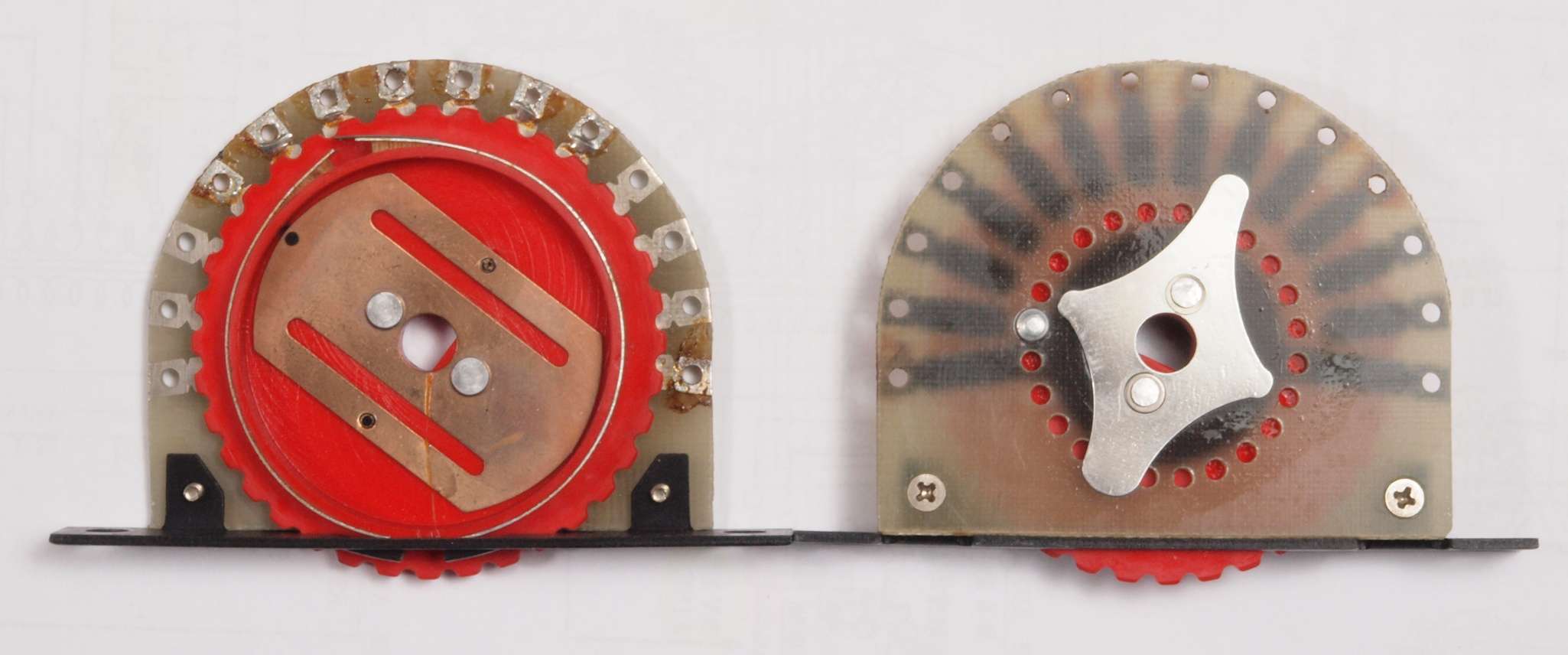 | E5. 真空管ピン選択ホイール、横から見る、特殊な構造。カシメのアルミピン2本が見える。 | |||||||||||||||||||||||||||||||||||