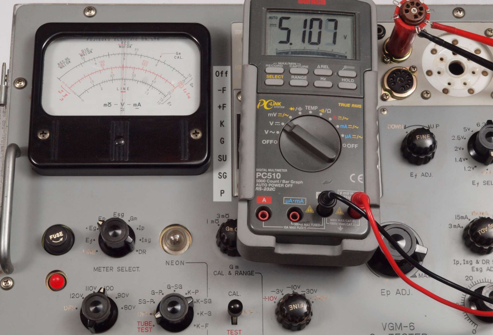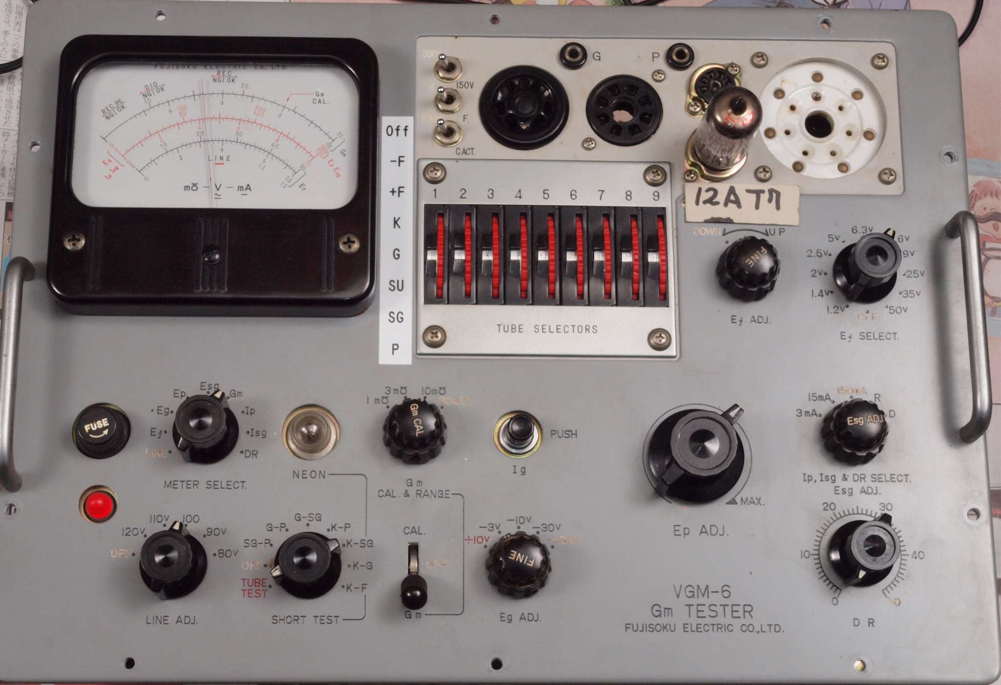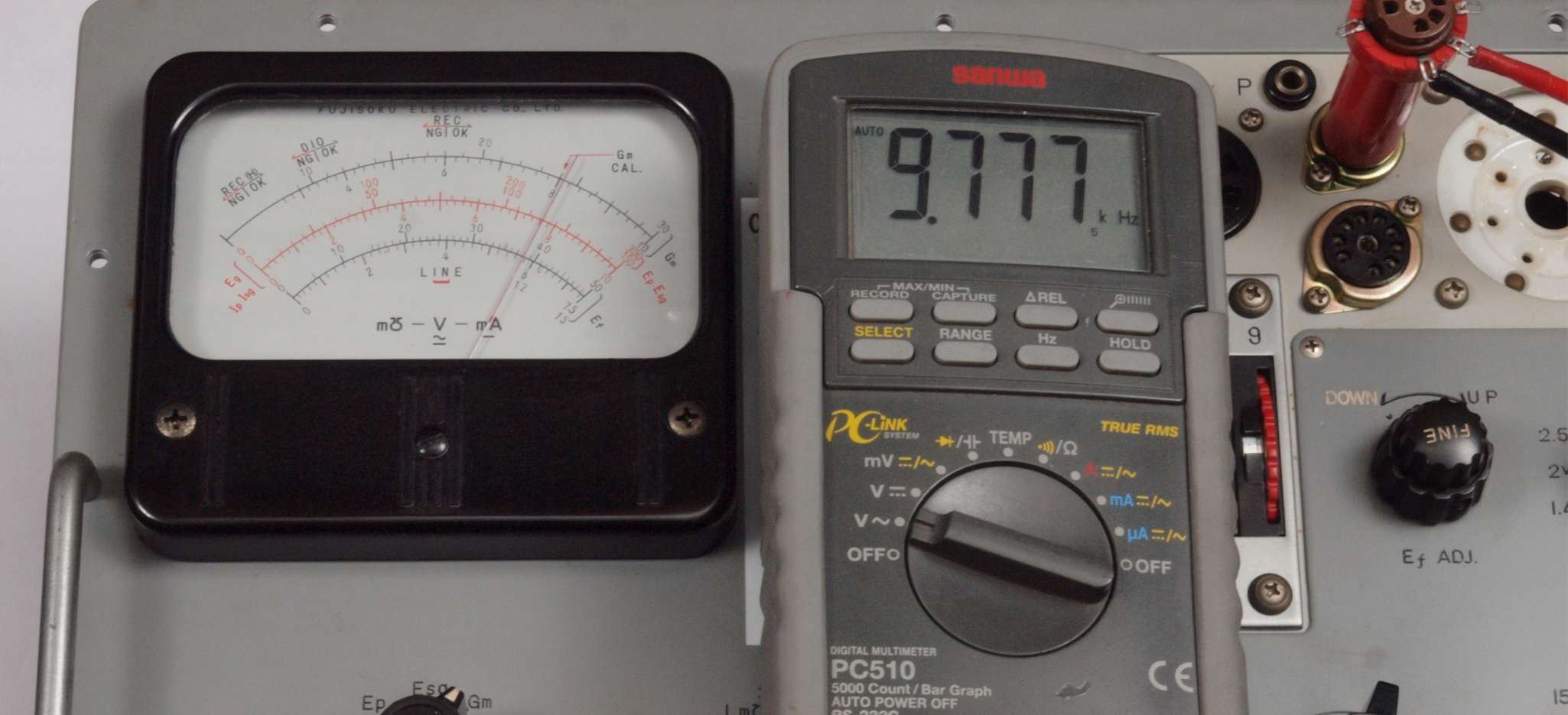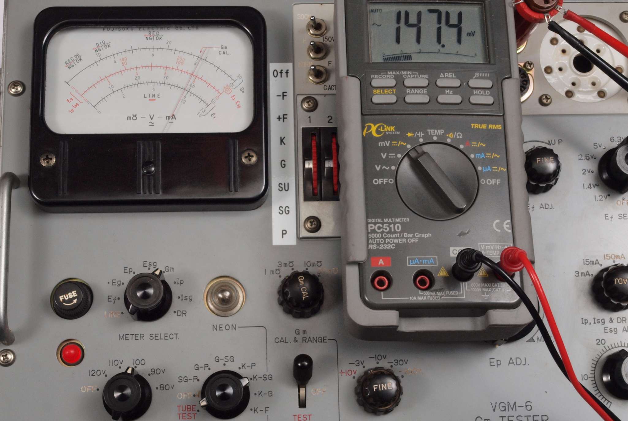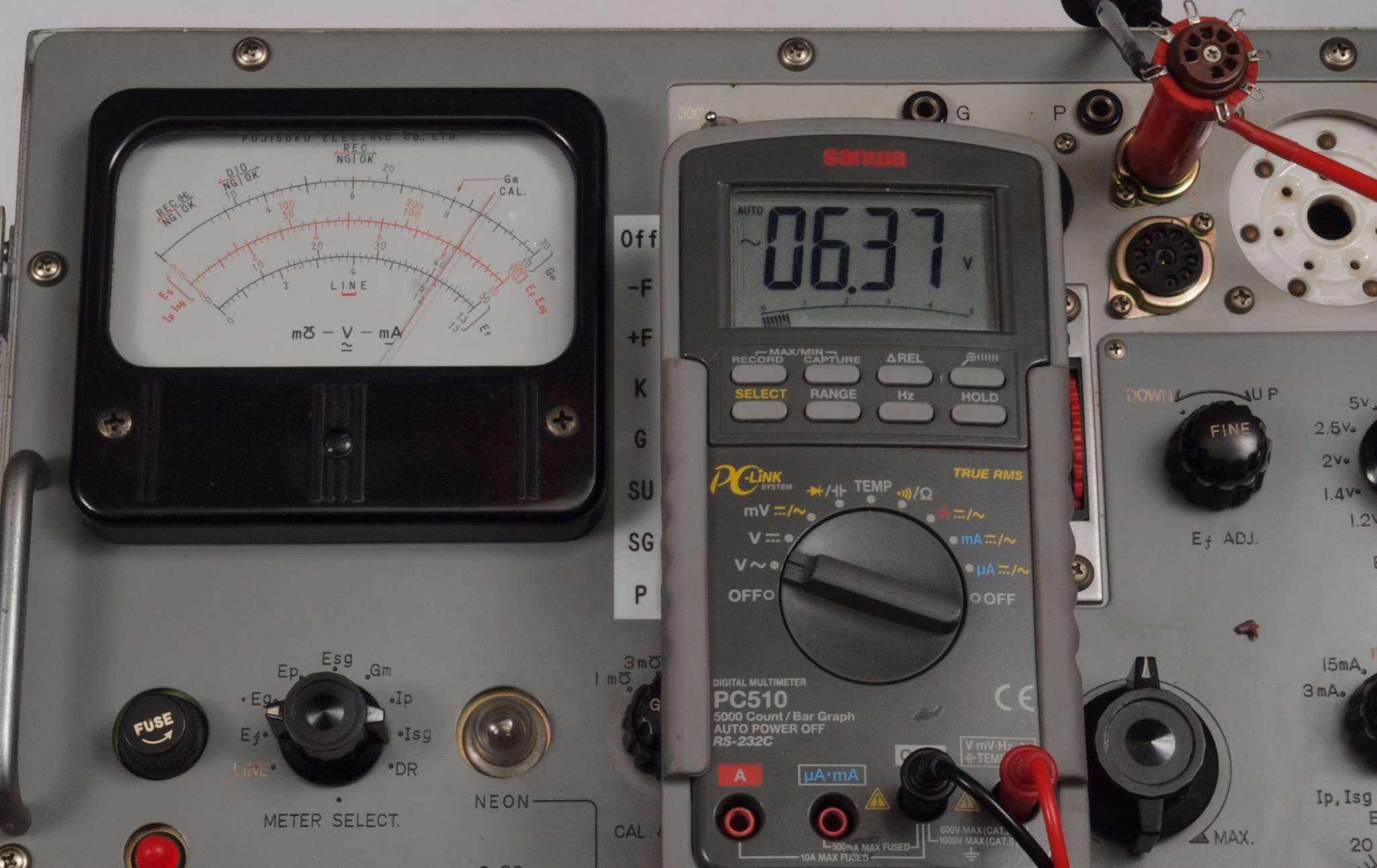 | F2. 12AT7ユニット1測定中、Gm測定=5350μmho。 真空管ハンドブック(規格表)の相互コンダクタンス=6000μmho「Ep=250V、Eg1=−12V、Ip=10mA」 1960/1962/1964/1966ナショナル真空管ハンドブック、1995オーディオ用真空管マニアル、60/62/69東芝電子管ハンドブック、1962日立電子管ハンドブック、1965/1971全日本真空管マニュアル、RC15/19/26/27/28/29/30 Receiving Tube Manual、1966/実用真空管ハンドブック、1995世界の真空管カタログより。