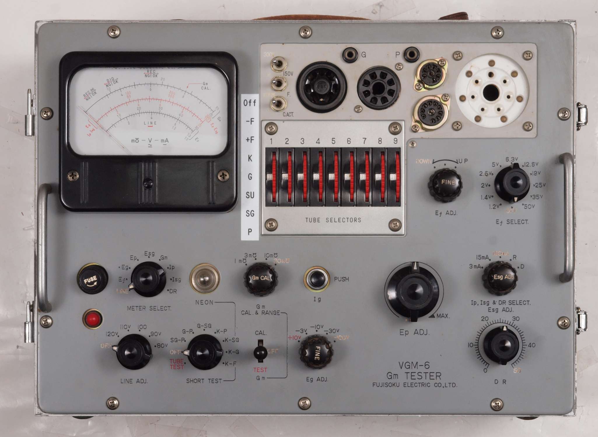 | F2. 12BH7ユニット1測定中、Gm測定=2040μmho。 真空管ハンドブック(規格表)の、12BH7相互コンダクタンス=3100μmho「Ep=250V、Ip=11.5mA、Eg1=−10.5V」 1960/1962/1964/1966ナショナル真空管ハンドブック、1995オーディオ用真空管マニアル、60/62/69東芝電子管ハンドブック、1962日立電子管ハンドブック、1965/1971全日本真空管マニュアル、RC15/19/26/27/28/29/30 Receiving Tube Manual、1966実用真空管ハンドブック、1995世界の真空管カタログより。 真空管ピン選択ホイールのG(1番ホイール)の所をドライバーで叩いても表示は不動。