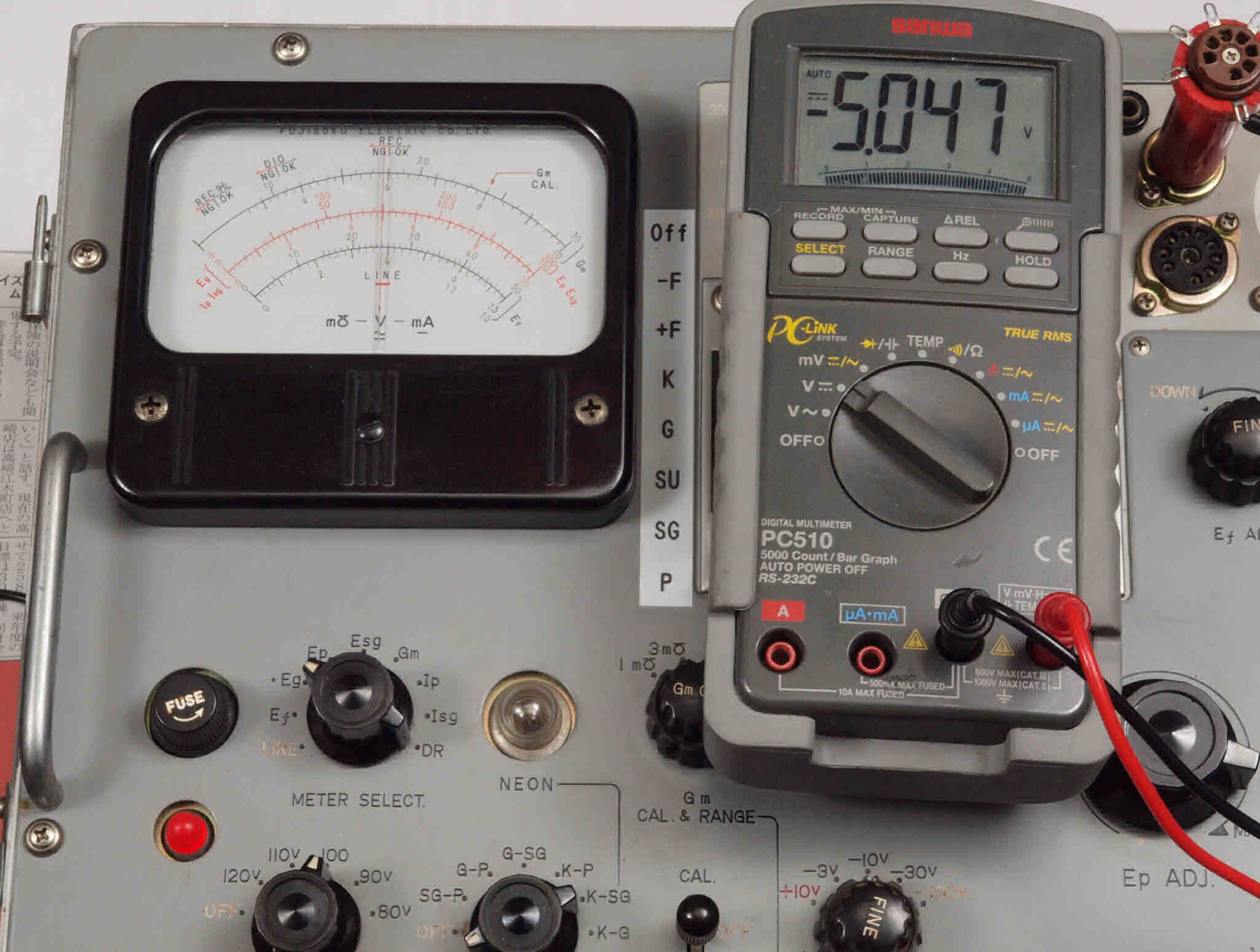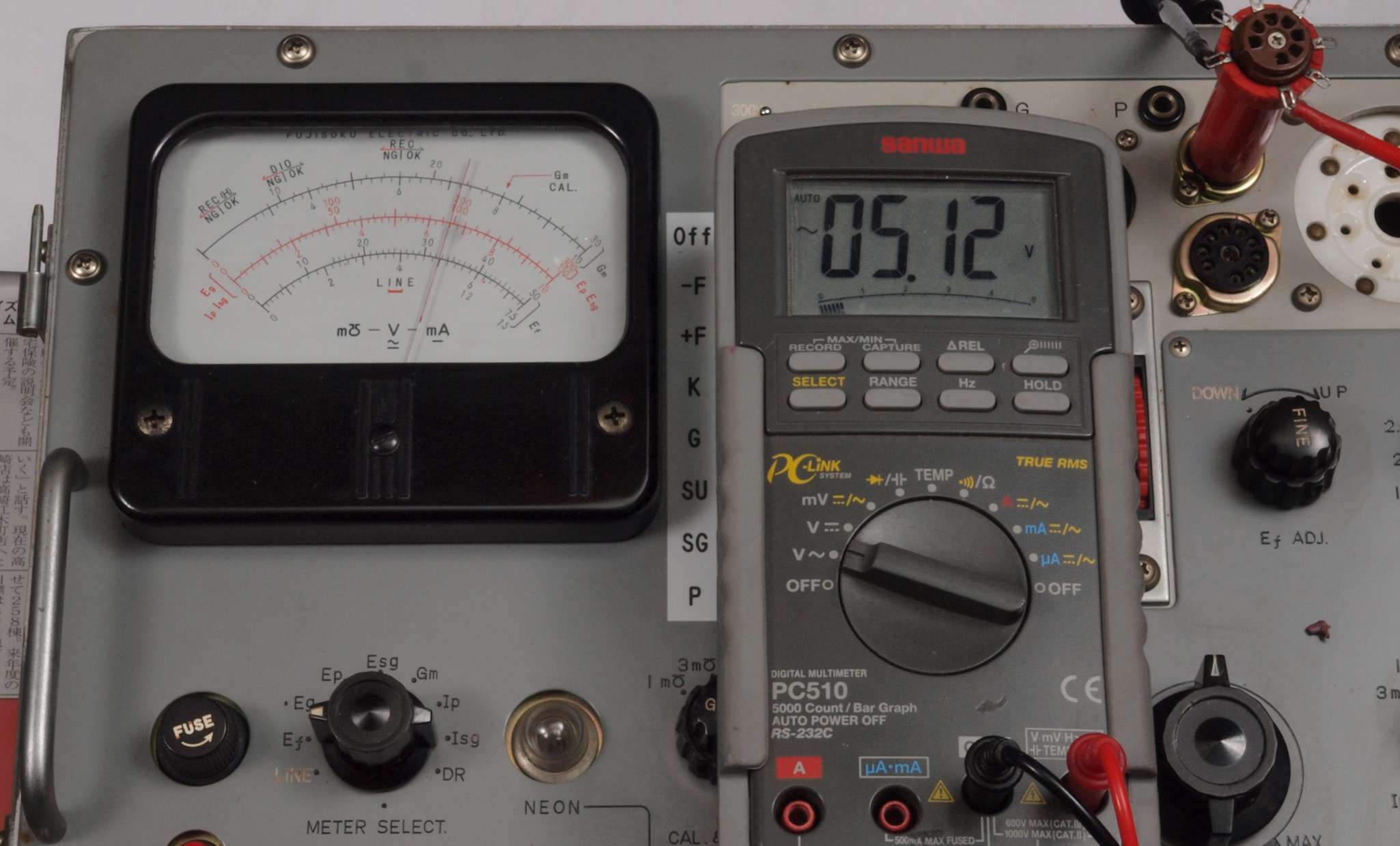 | B. 点検・調整・清掃状況。 画像をクリックすると、大きく(横幅2050ドット)表示されます。 B11. ヒータ電圧5V、実測=5.12V。 |