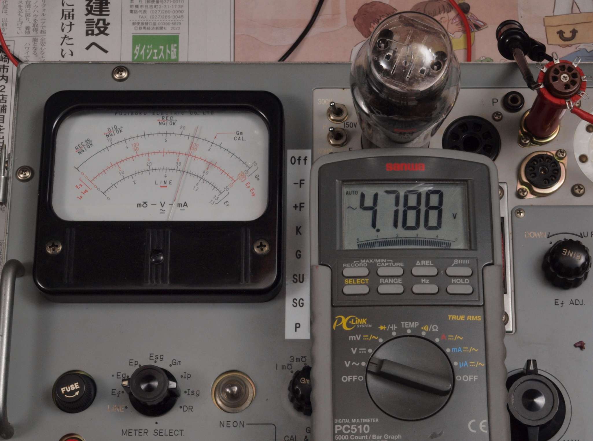 | H. ヒーター電圧の安定度(レギュレーション)測定。 H1. 整流管83。 ヒーター電圧=5V、ヒーター電流=3A。 本体電圧計=5V供給。 MT7ピンソケット位置電圧計(テスター)=4.788Vで−10%以内。 |