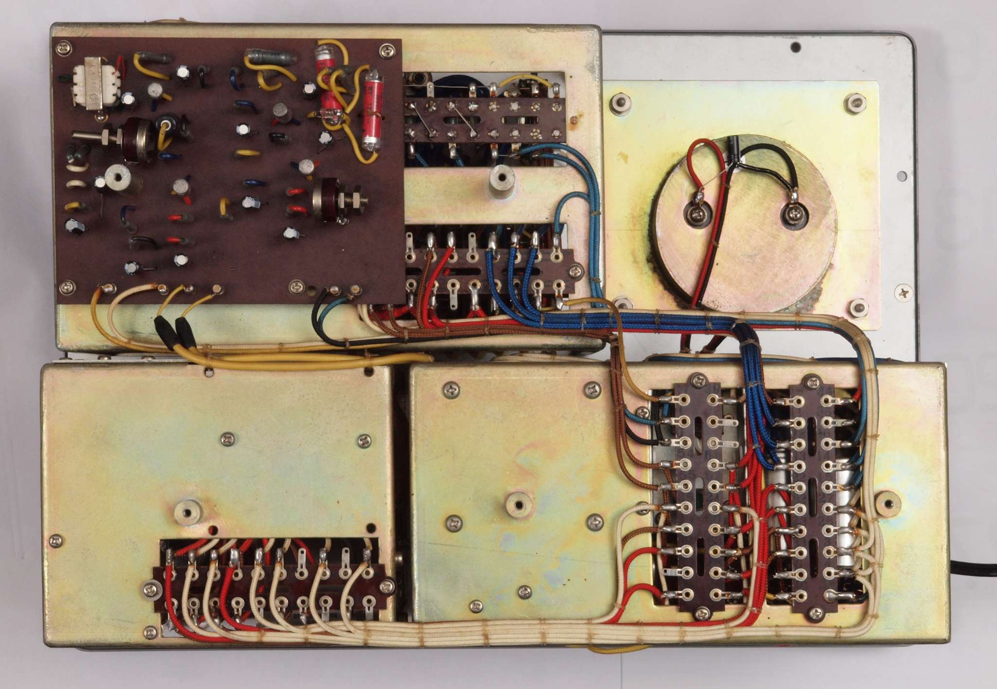 | F. ピン選択ホイールをバラック修理後6DJ8、12AT7、12BH7測定。 画像をクリックすると、大きく(横幅2050ドット)表示されます。 F0. 修理中 ユーザーが修理依頼するので、「ピン選択ホイール1番+ピン選択ホイール2番」2個を取り出した。 他7個 は解体しないと不可。 銘板固定のテープも全て破断しています。 |