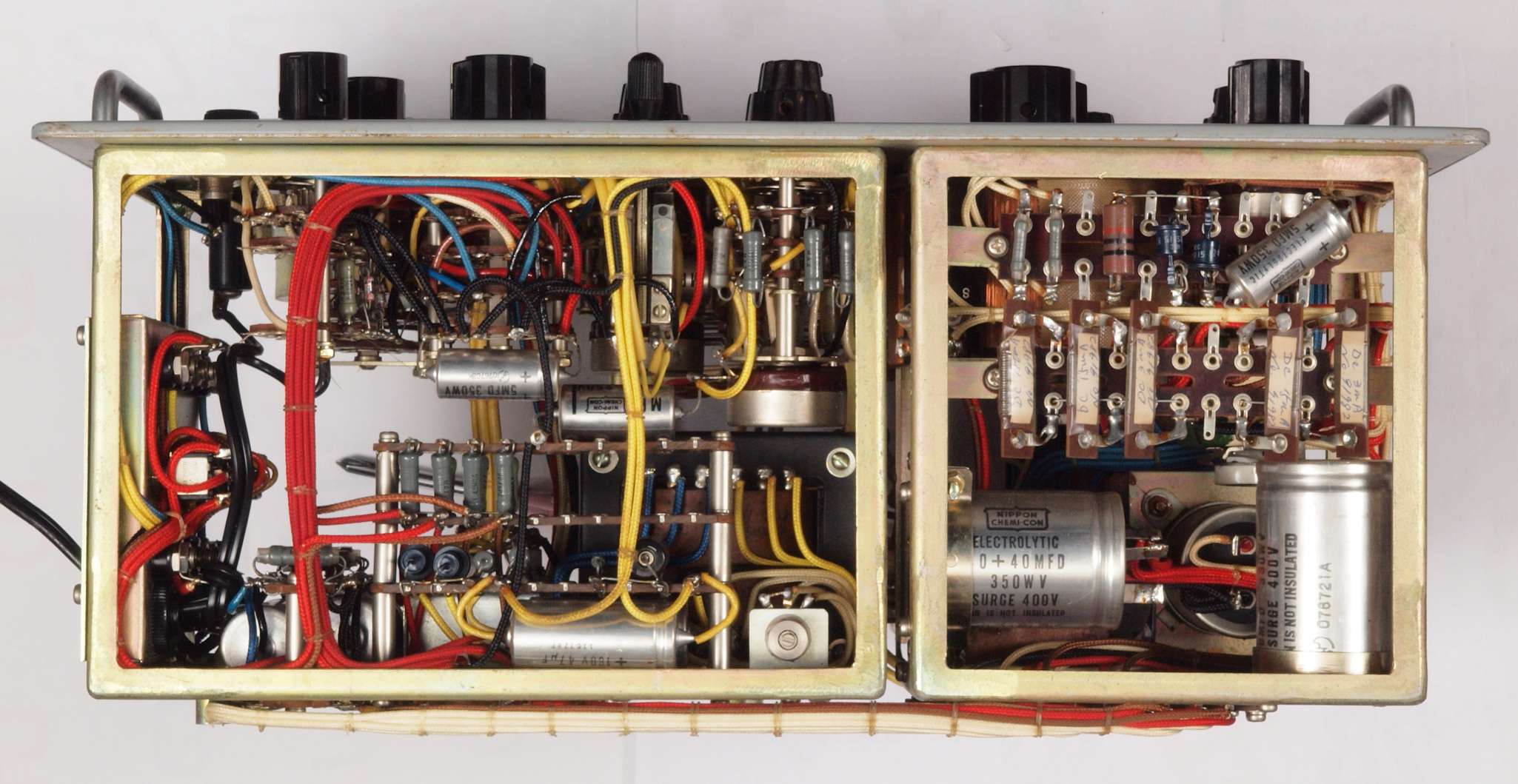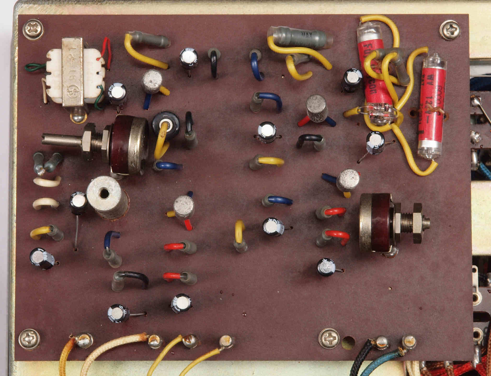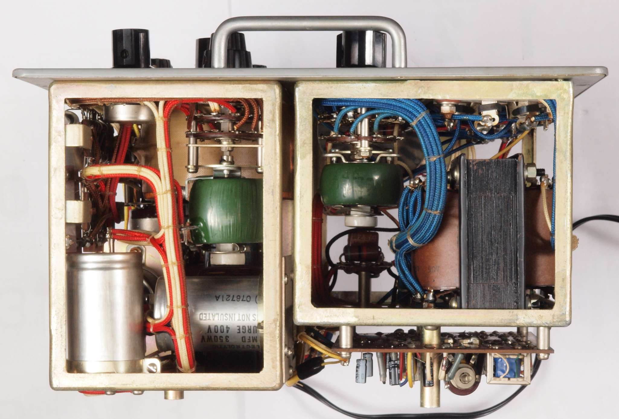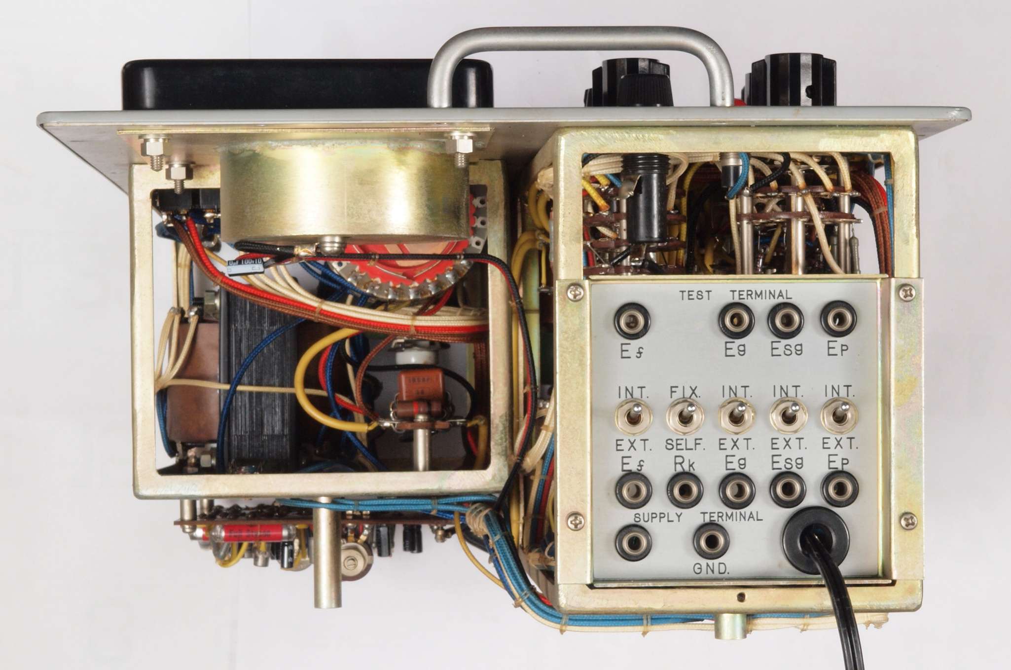 | A12. 点検中 ケースから出し、後から見る。Gm測定用発振器と測定部。電解コンデンサ−が交換されている。 ここで修理したのでしょう? 製造番号が同じです。 |