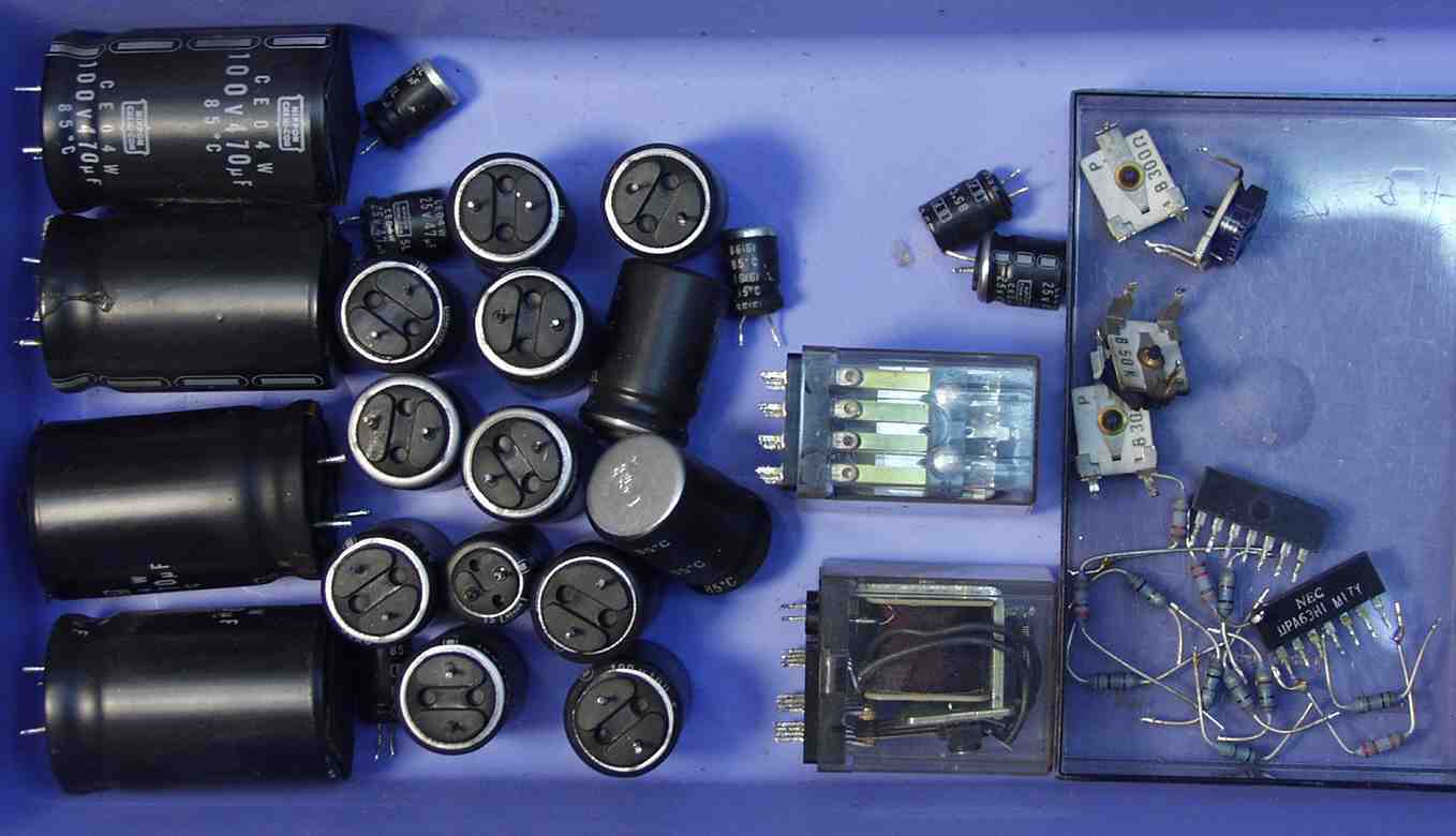 | E3.劣化した電解コンデンサー、熱の為、下のビニールが剥けたのは解りにくい。 修理の様子 HMA−9500. 9台目 |