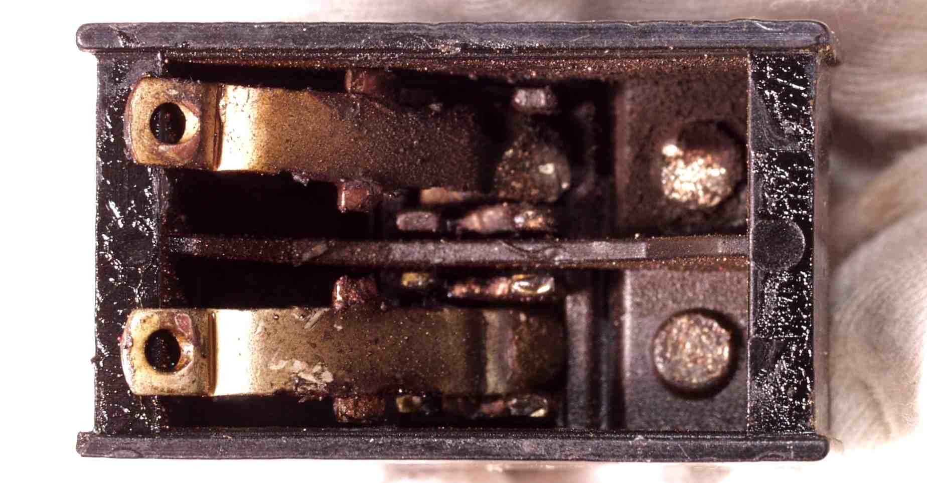 | E2.焼けたSP接続リレーの可動接点、ご覧の様に接点を支えている、隣青銅が焼けてへたっている、特に左側 接点だけを磨いても、ダメな理由です修理の様子 SAE(Scientific Audio Electronics) A1001 |