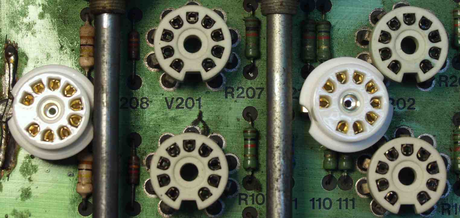 | A4.此方は消費電力の多いい、整流管と出力管のソケット、自分の熱も加わりボロボロ。 真空管の熱は伝熱、輻射、対流で伝わりますが、(ソケット)足から、かなりのウエイトを持ちます。 モ−ルドより磁器の方が熱伝導率が優れています。 |