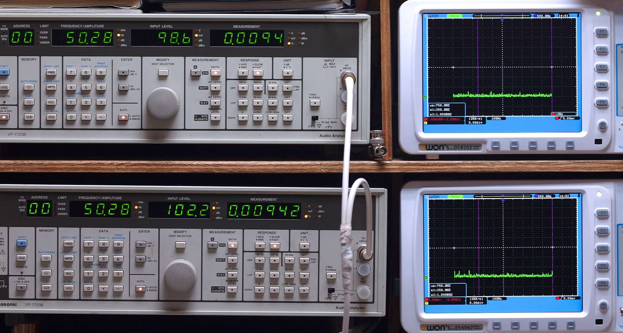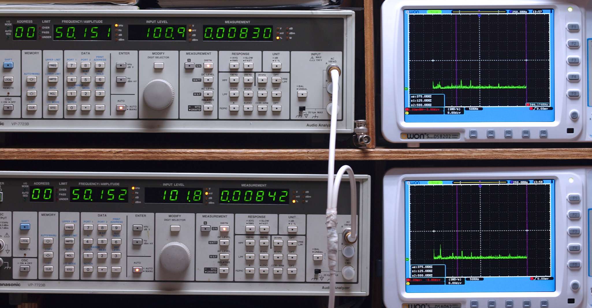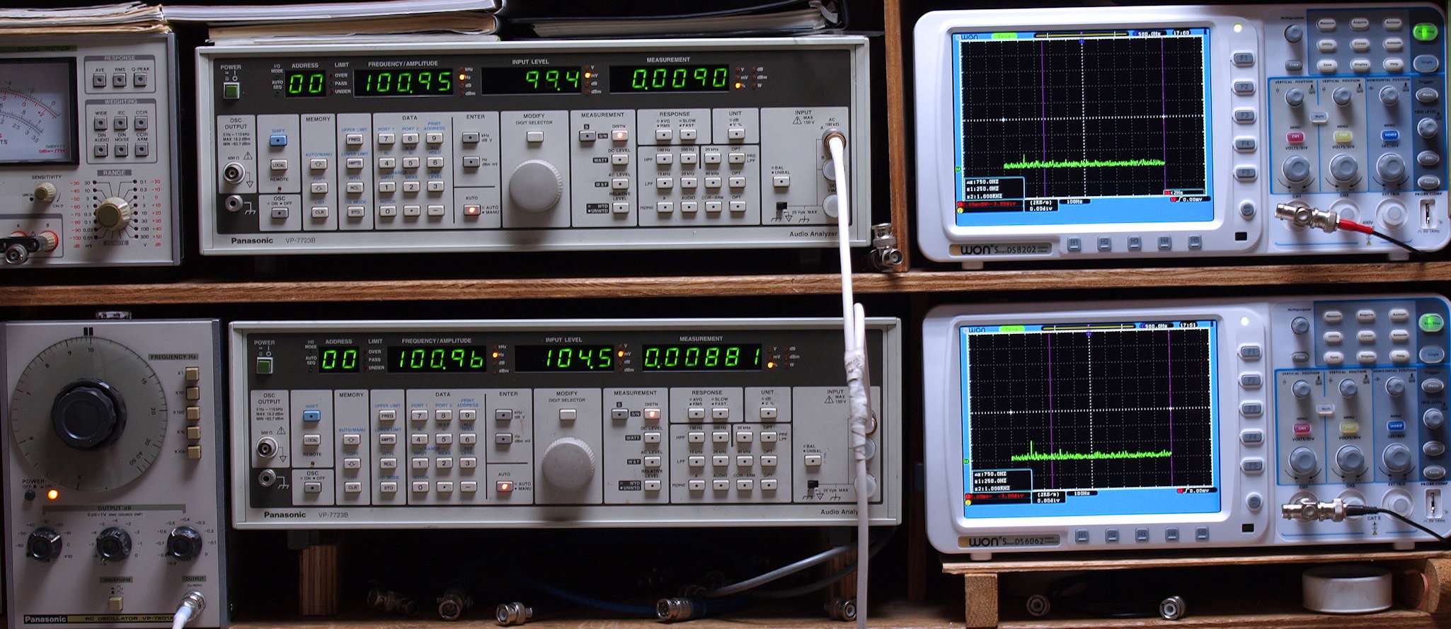 50Hz〜100kHzの信号を上段中及び下段中「Audio Analyzer Panasonic VP−7723B」により測定。