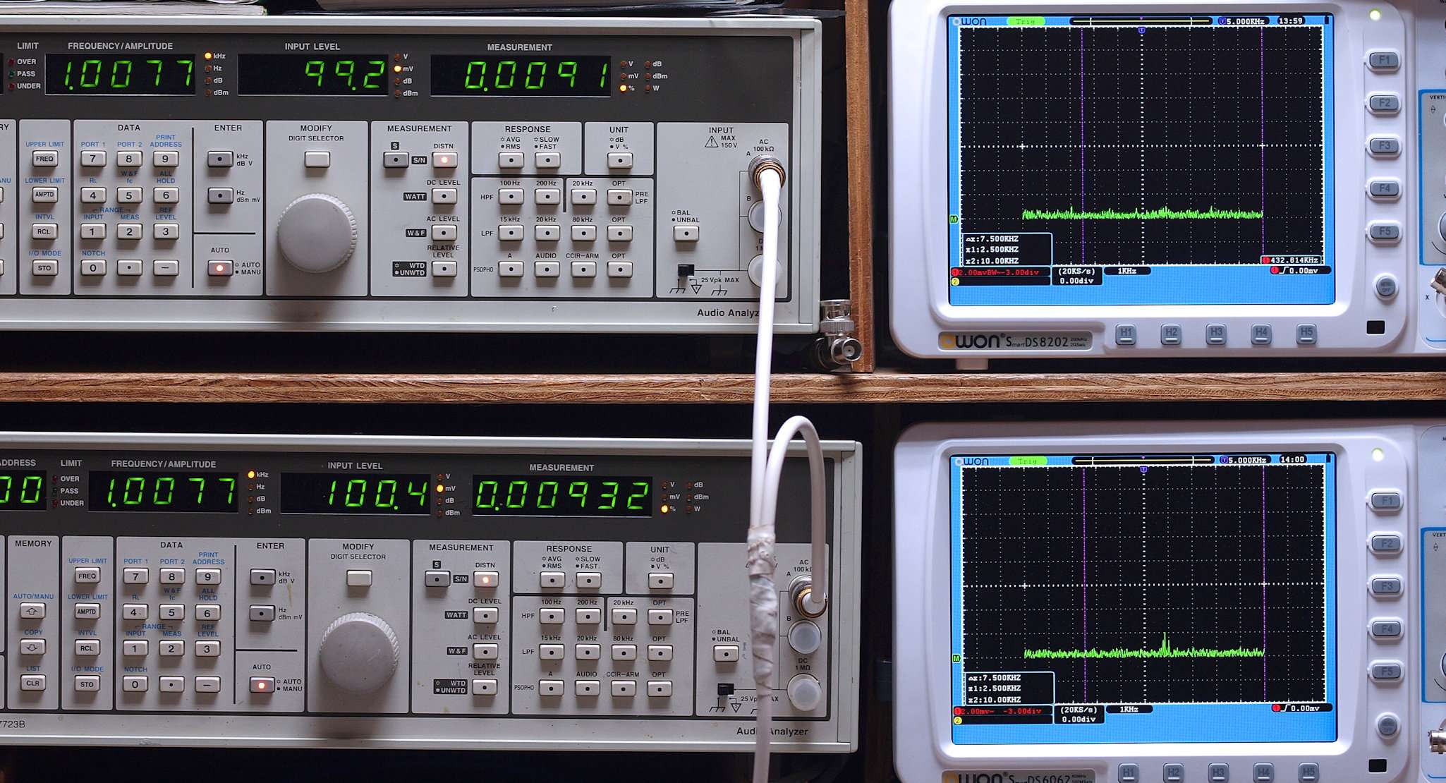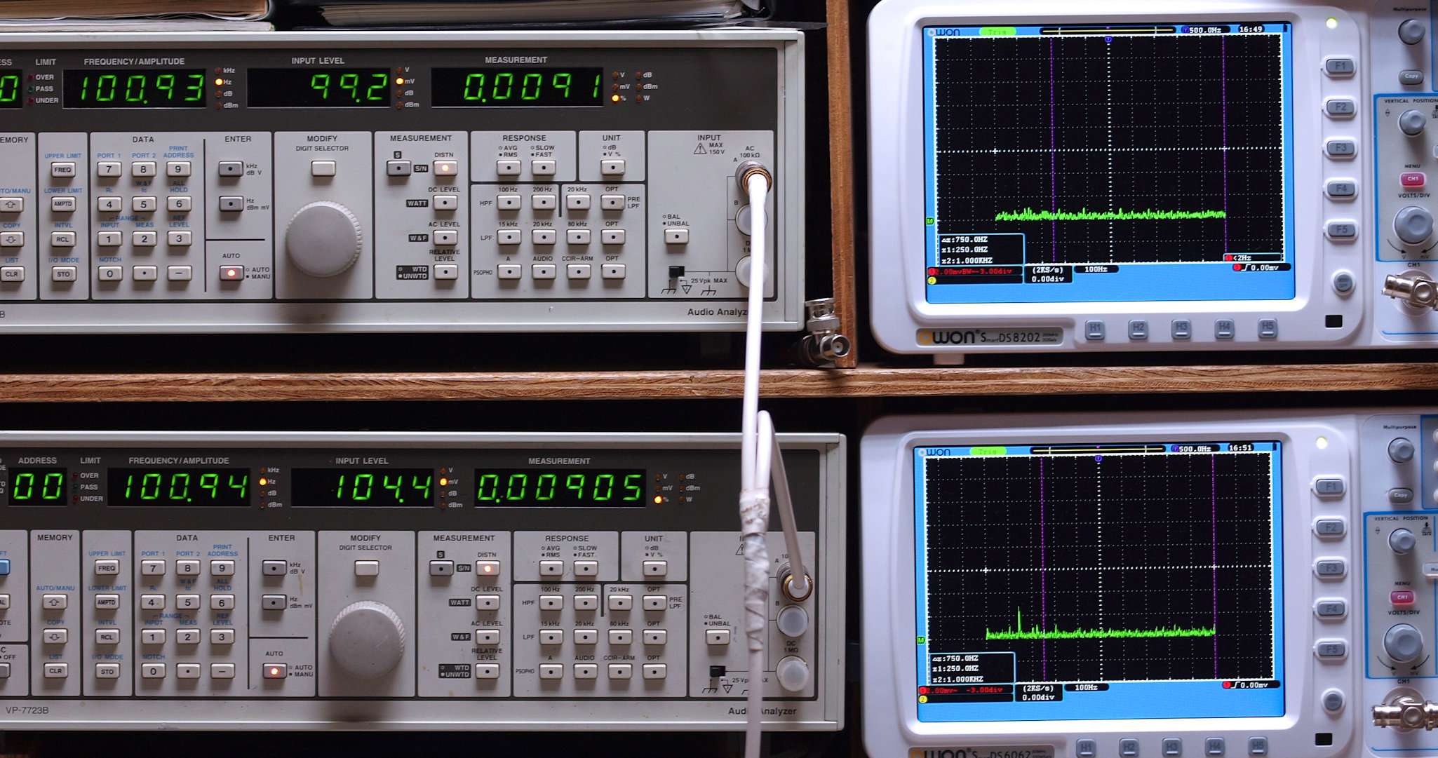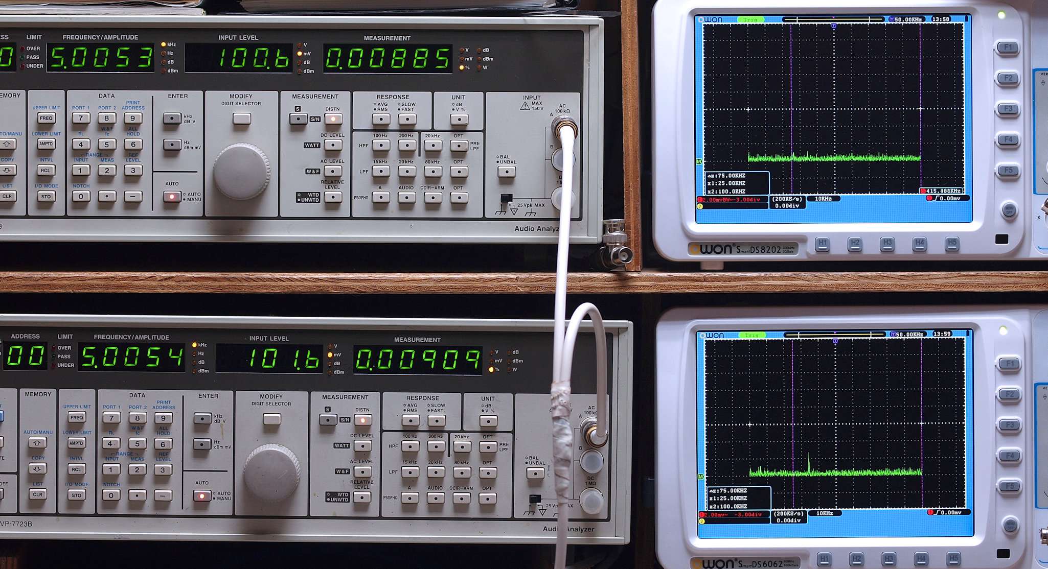 50Hz〜100kHzの信号を上段中及び下段中「Audio Analyzer Panasonic VP−7723B」により測定。