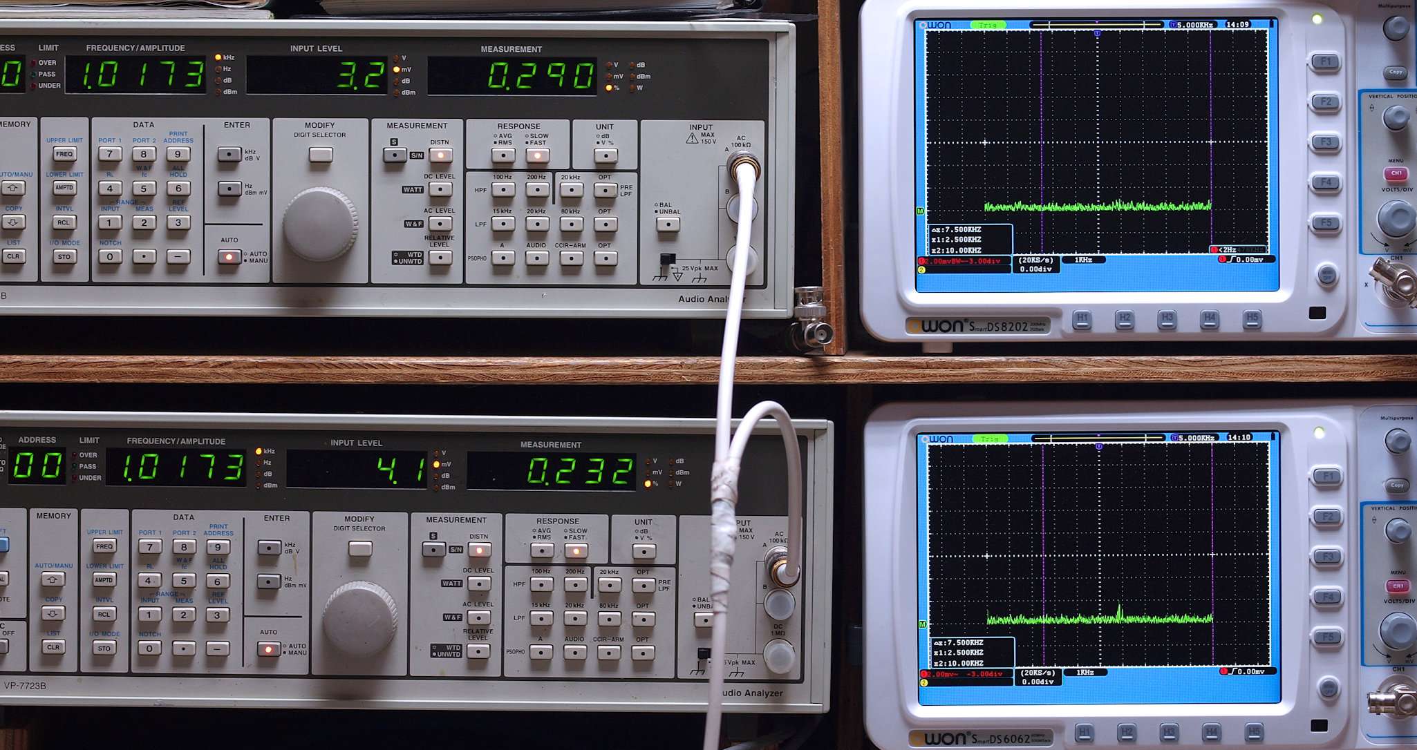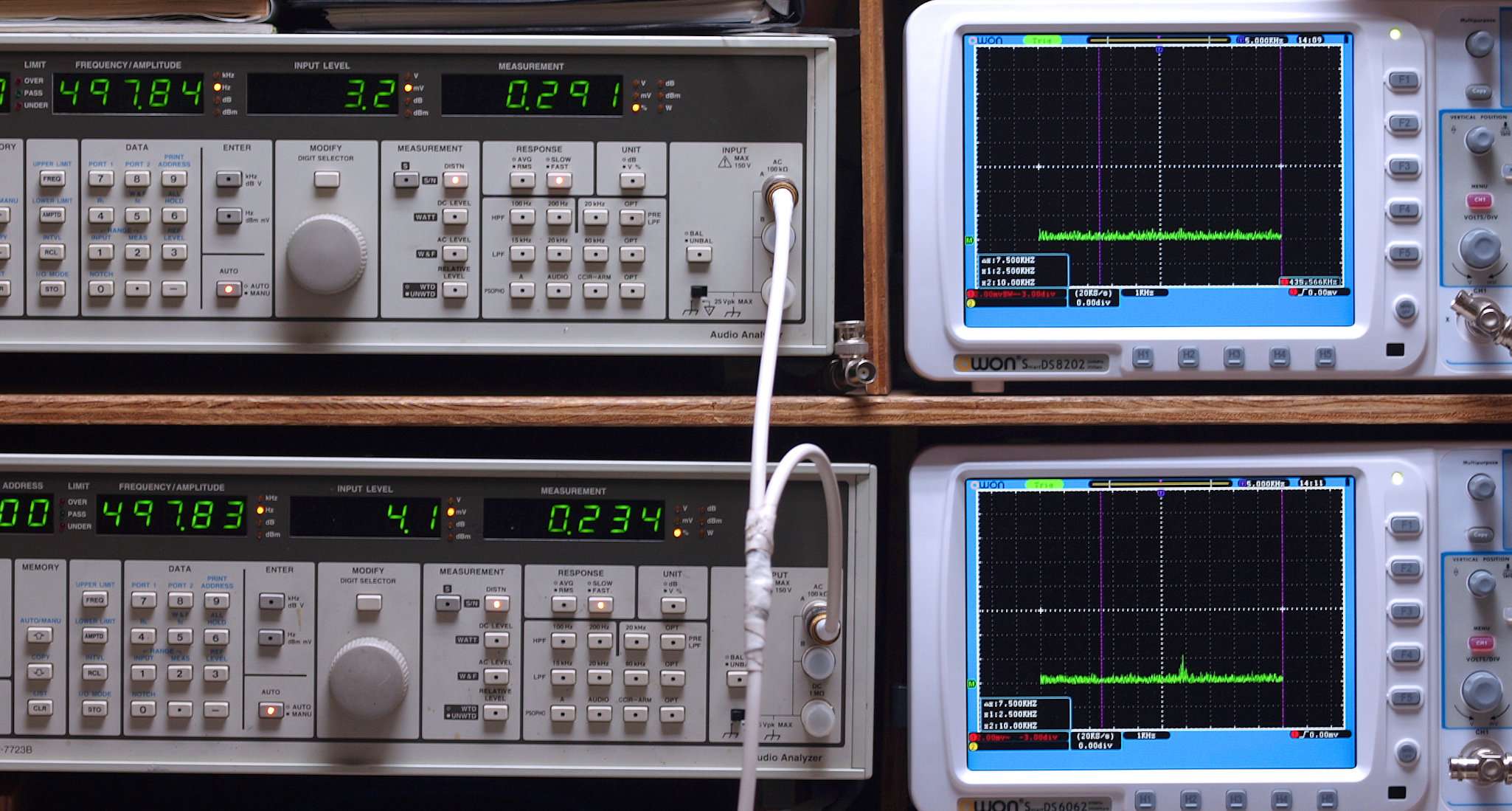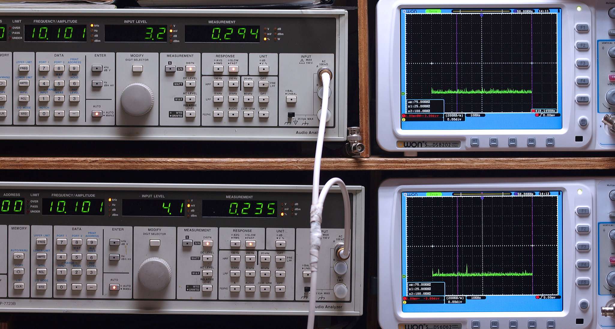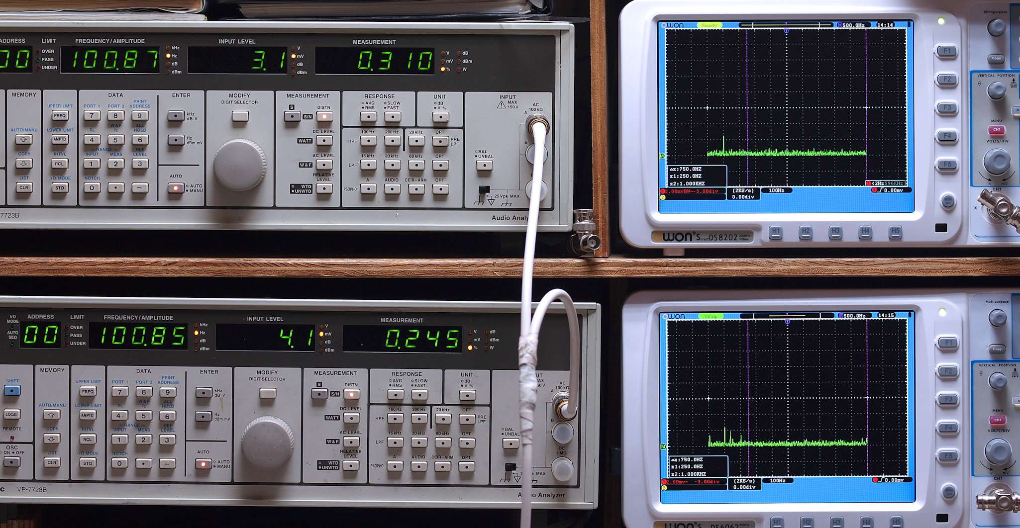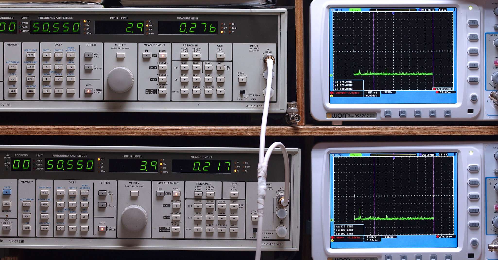 上段右端及び下段右端 VP−7723Bの基本波除去出力を「owon SDS8202(200MHZ)」で「FFT分析」表示。