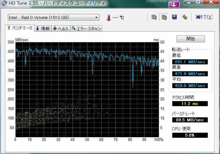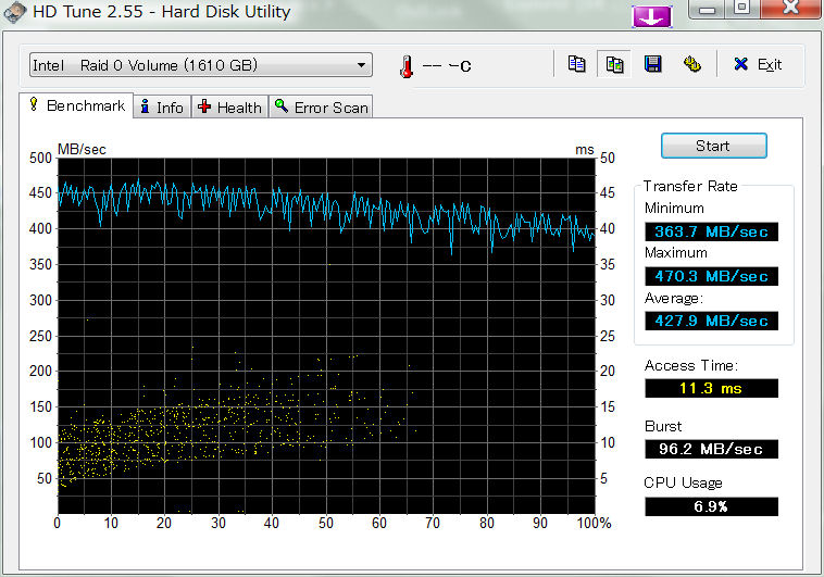 A5. HDD(Seagate ST31000333AS)4台のRAID_0 のHD Tuneの結果、ファームウェアのアップデート後。