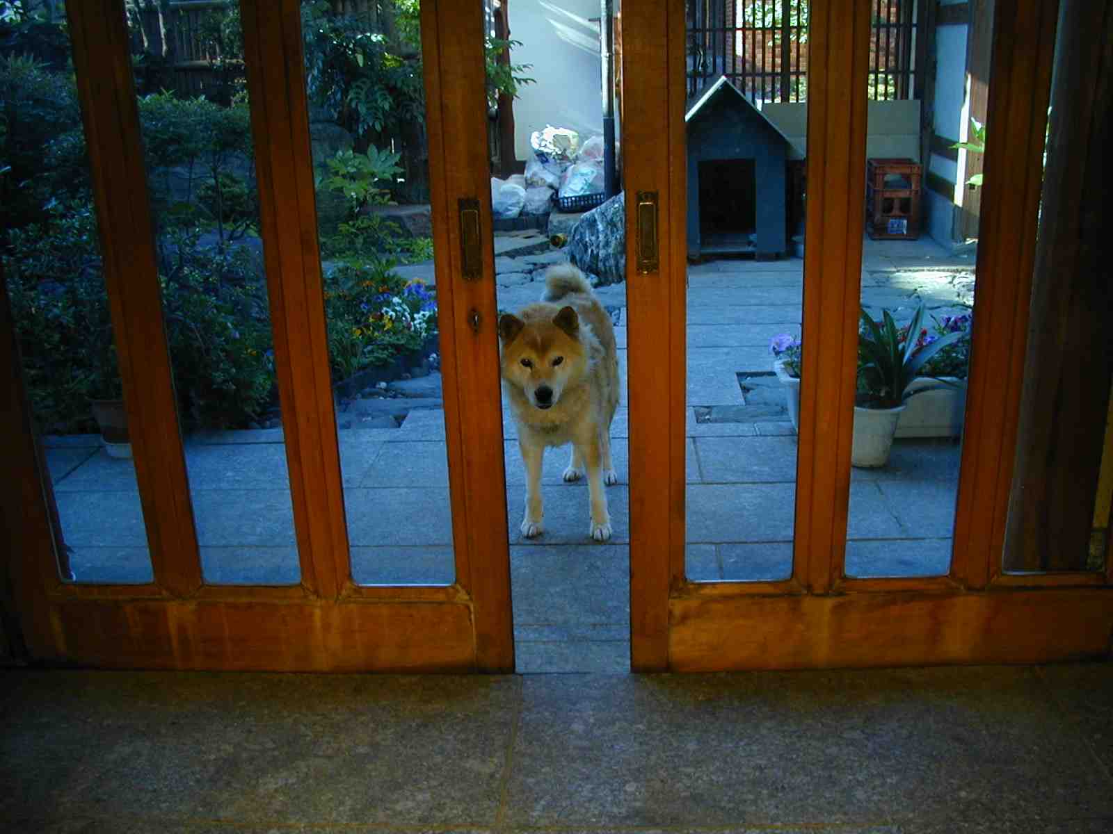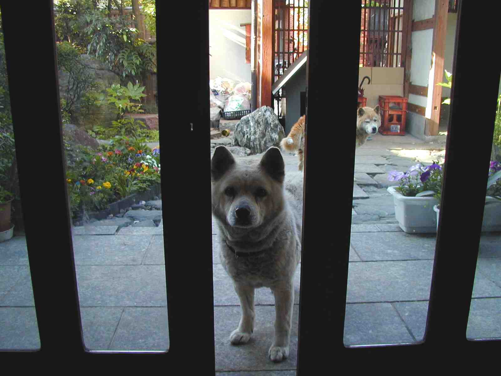 家は塀に囲まれ、門に格子戸があるので、庭と玄関に放し飼。