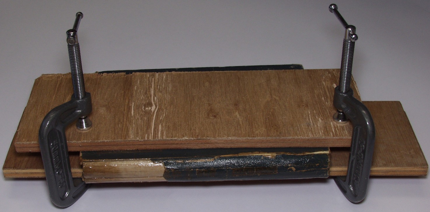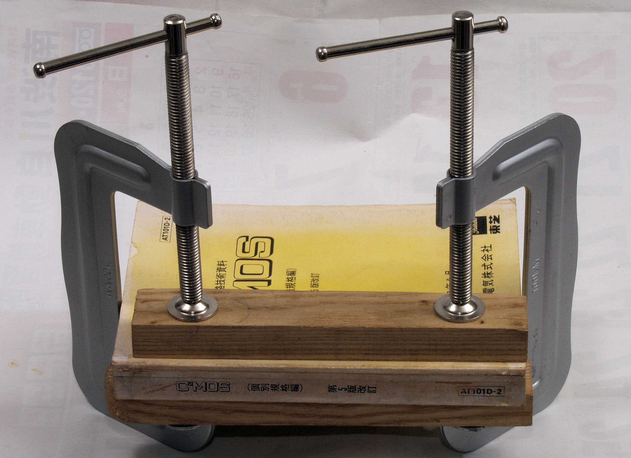 14. 酷いのは、下の様な「シャコ万力」で押さえると楽に出来ます。 無い場合重しでもOKです。