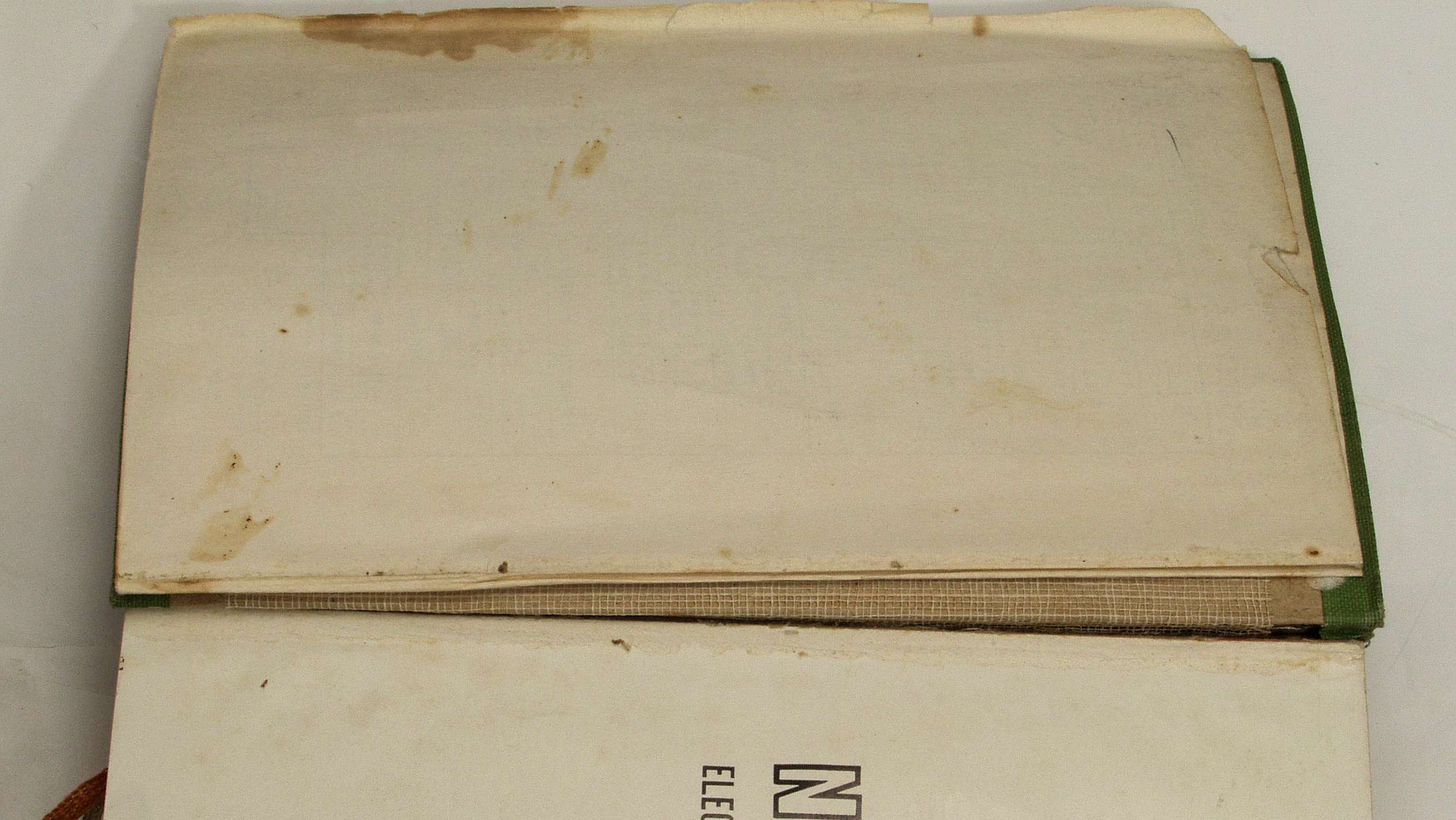 42. 修理後、表紙破れた物。 ペーパーナイフ等を使い、良く合わせる。 合わせ目に「ビニール糊」を塗る。