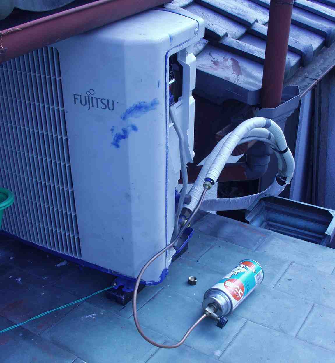 | 34.エアー・パージ。 卓上コンロ用のブタン・ガスで十分行い、フロンガスの流出を出来るだけ無くす |