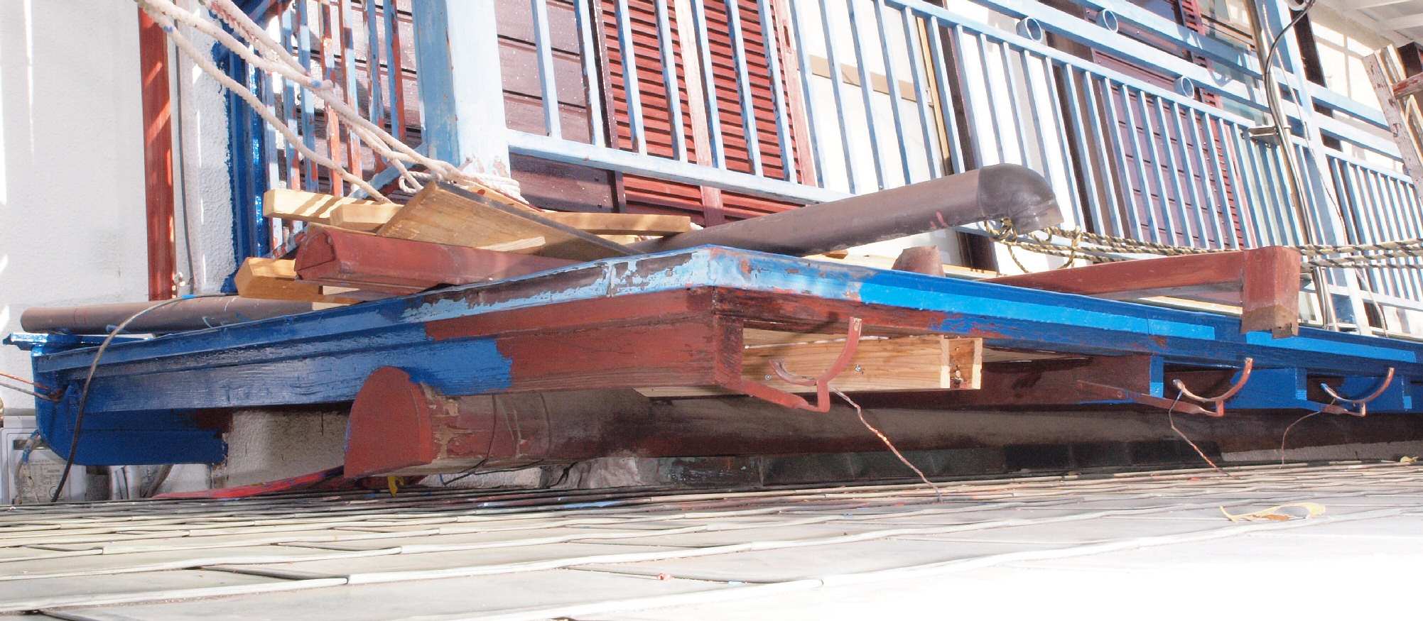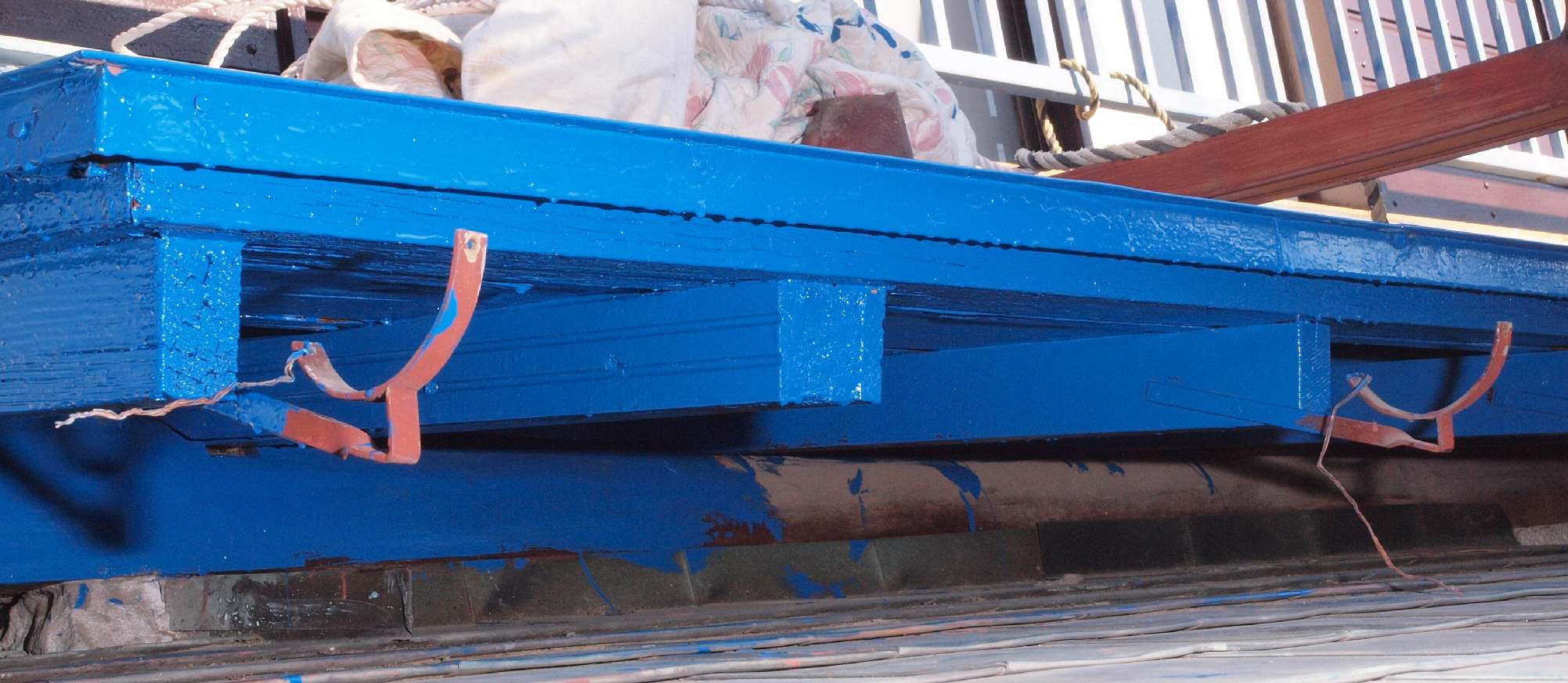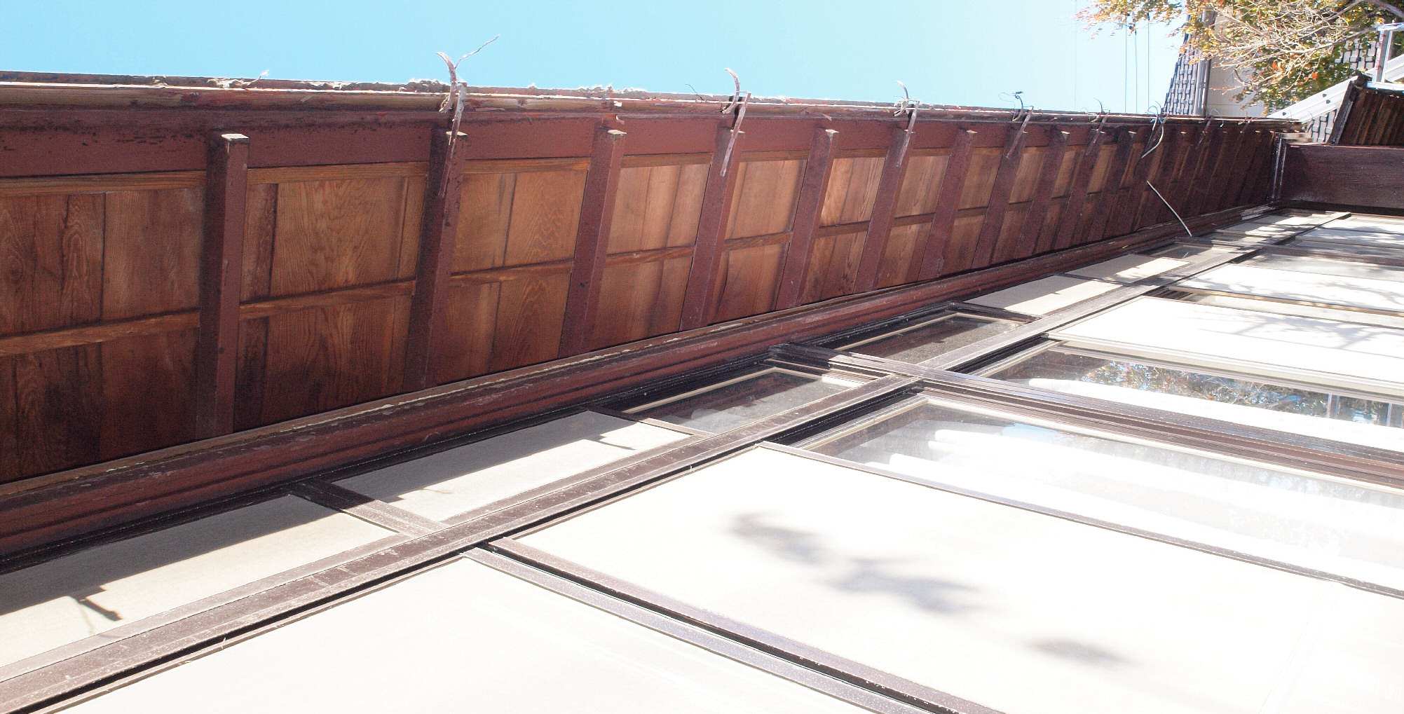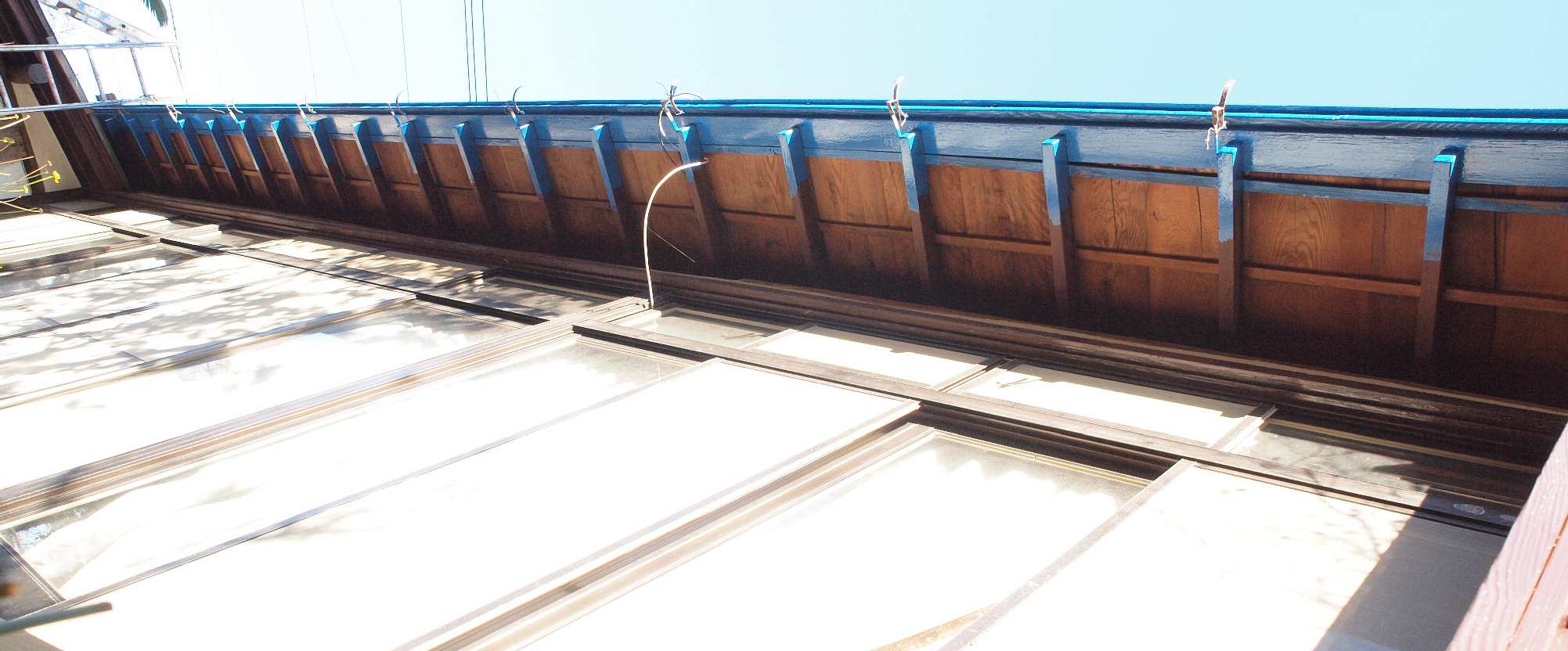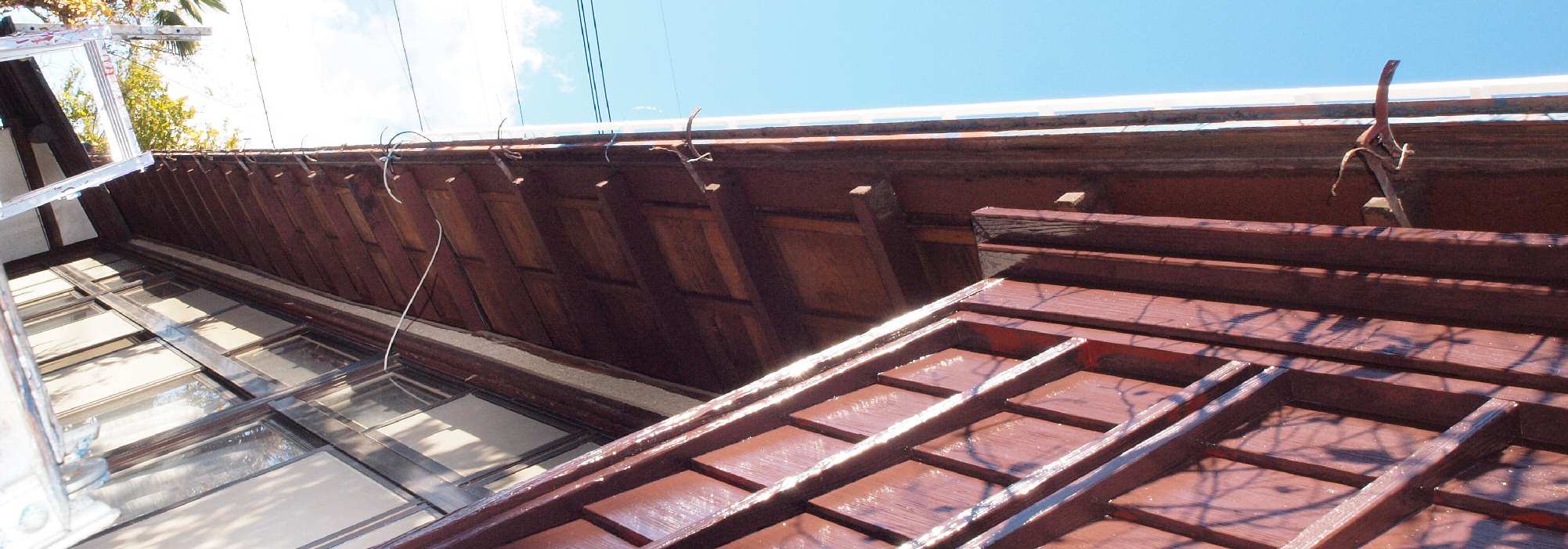 | 41. 修理(清掃後)中 1F南側軒天中央部 下から、拡大。 廣小舞にペイントが無? |