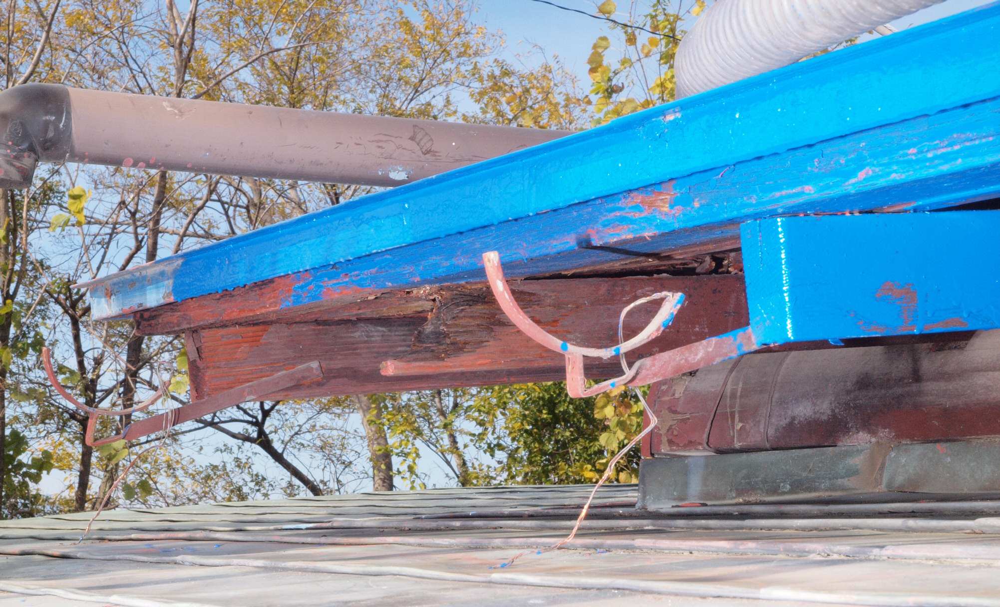| 51. 修理中 1F南側軒天西端、 樋からの跳ね返りで腐った垂木。 |