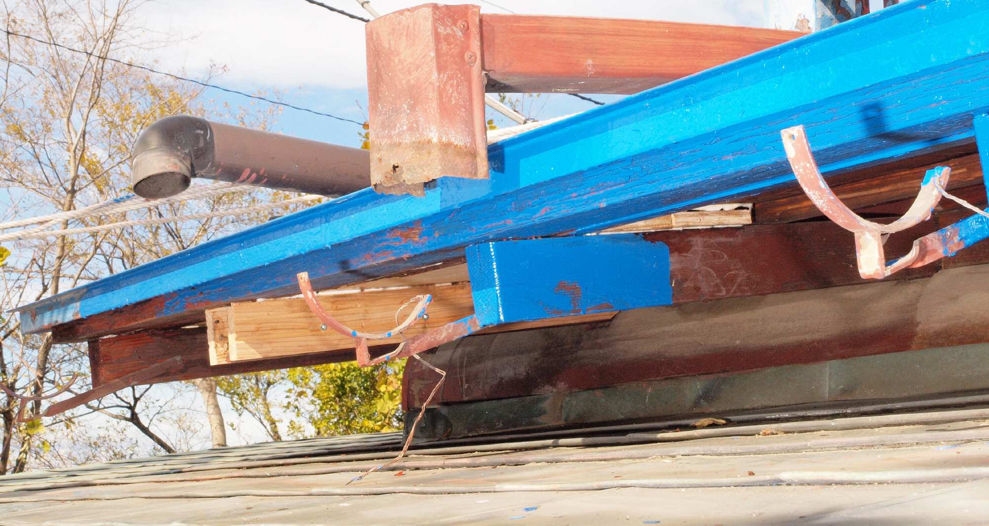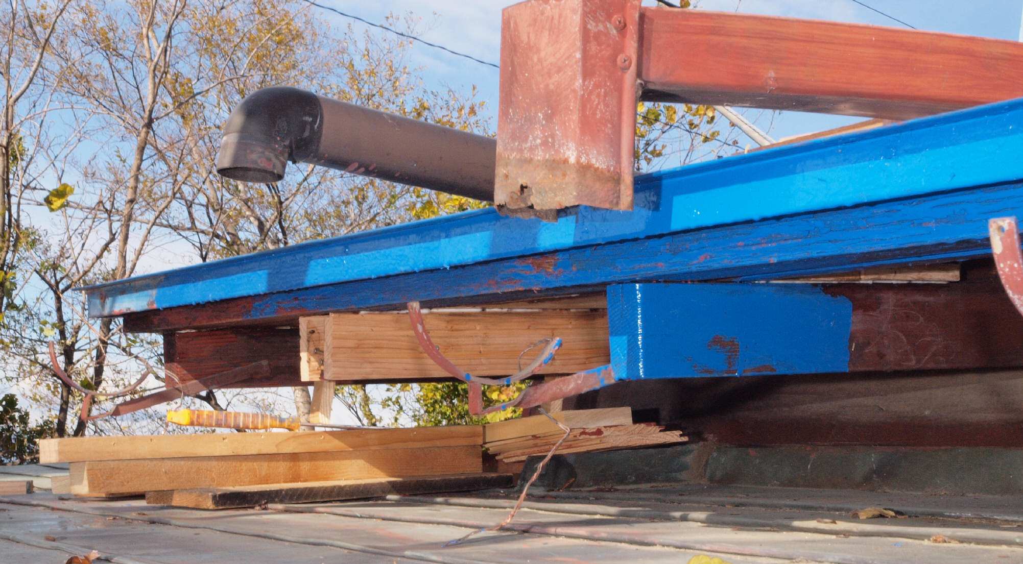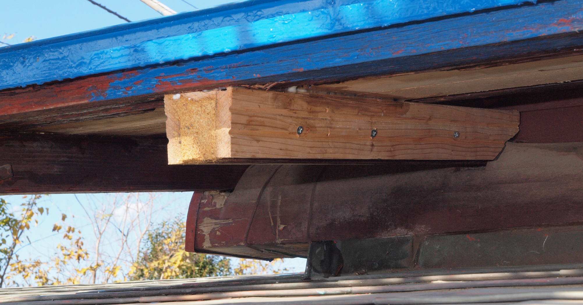 52. 修理中 1F南側軒天西端、 腐った垂木を板で軒桁まで両側から補強。