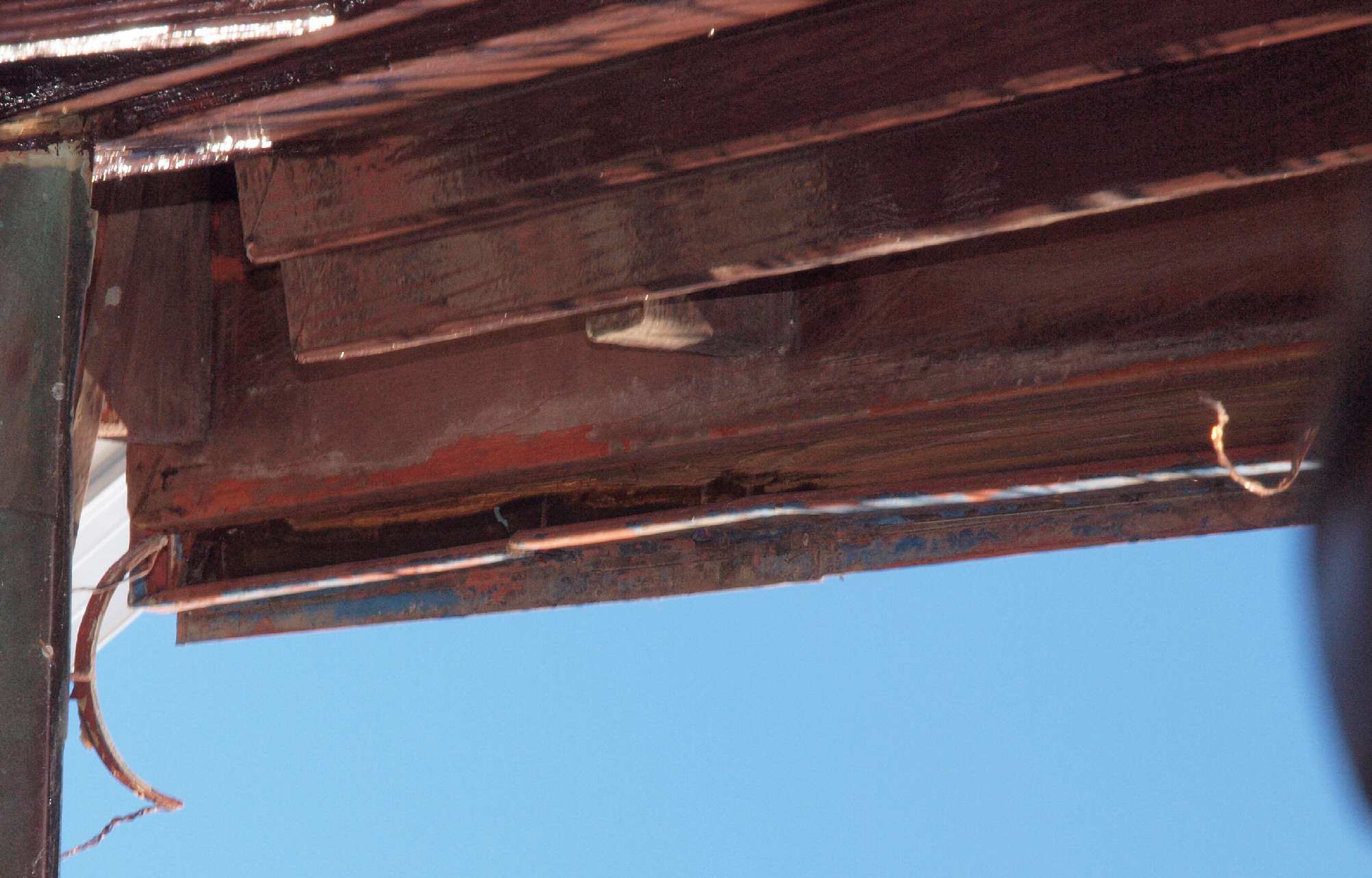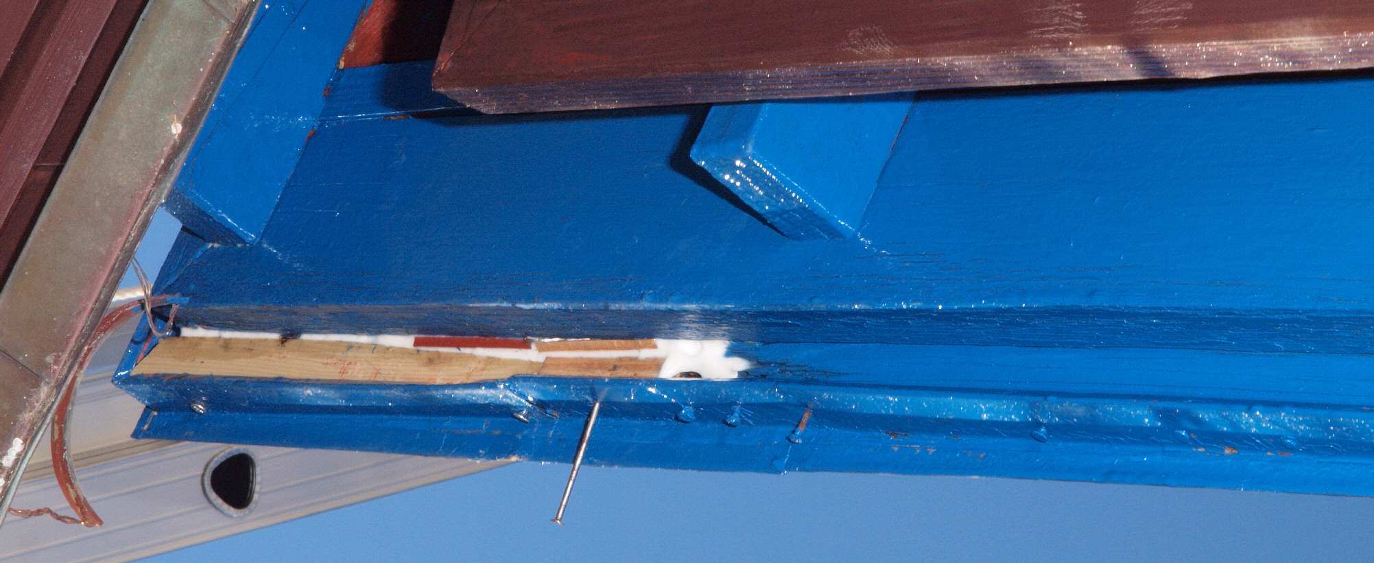 | 62. 修理中 1F南側軒天東端、 樋からの跳ね返りで腐った広小舞。 木り端で埋め木ネジとボンドで接着。 |