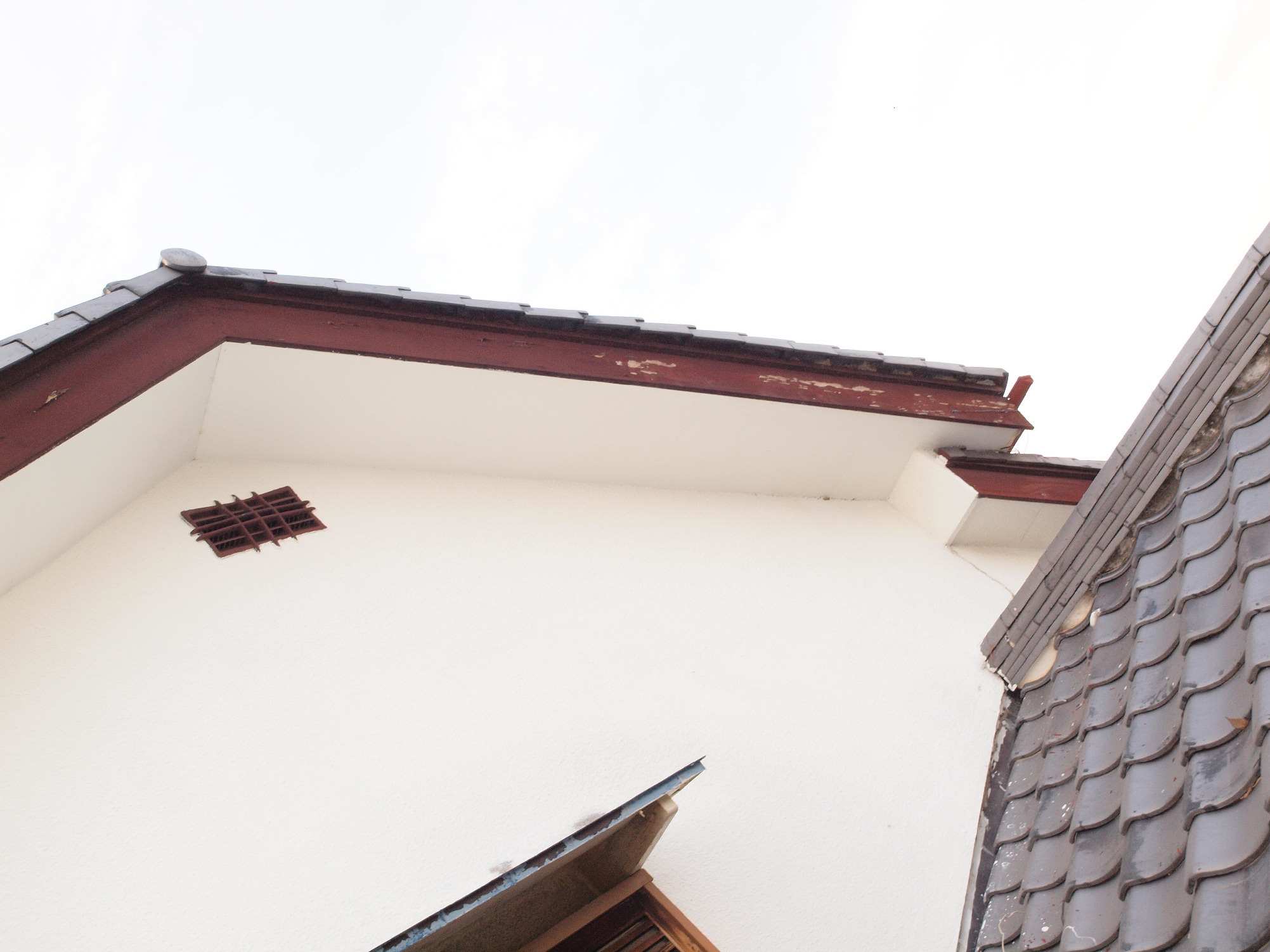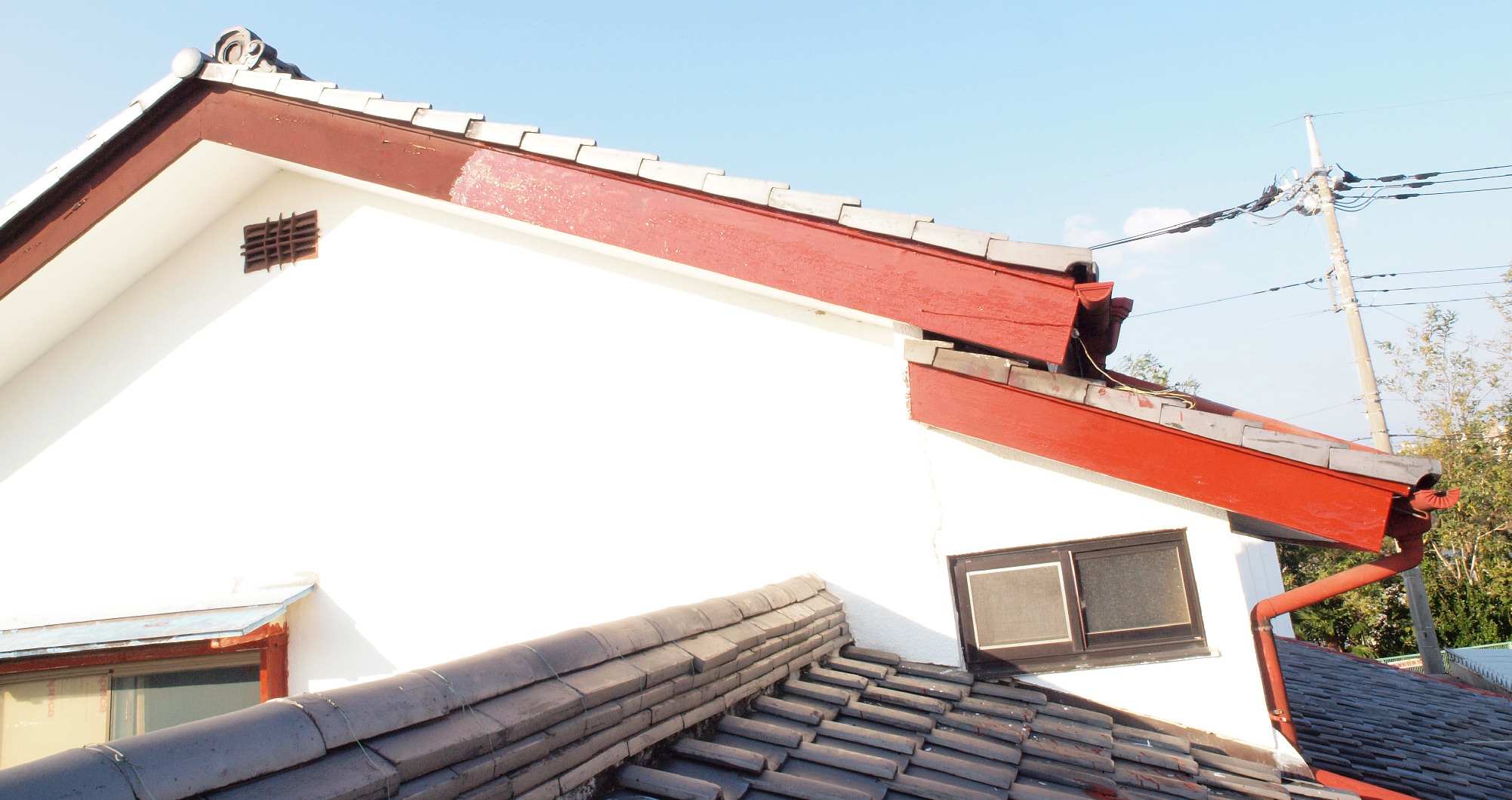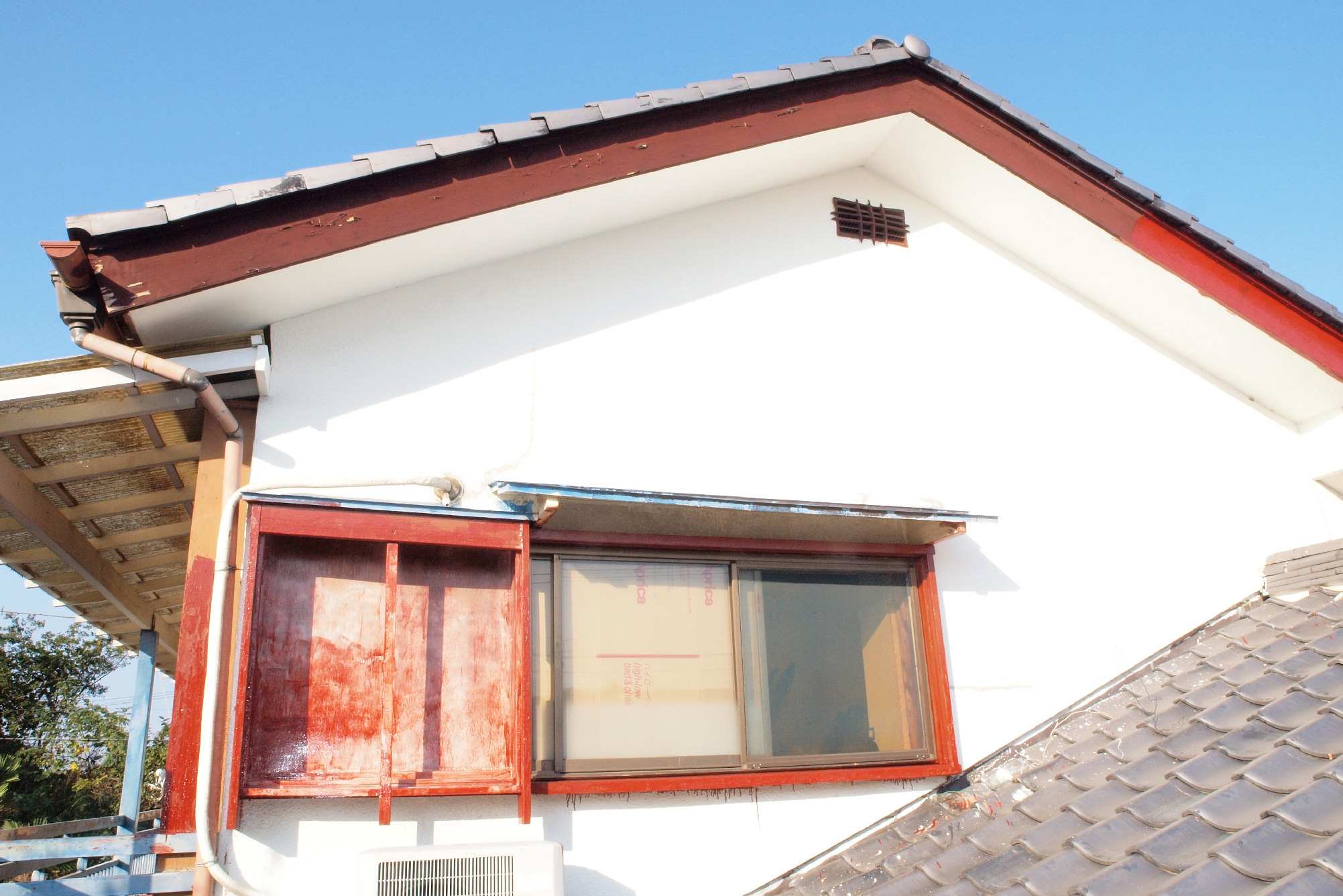 | 4. 平成29年修理中 軒天塗装。 破風下端も塗装する。 |