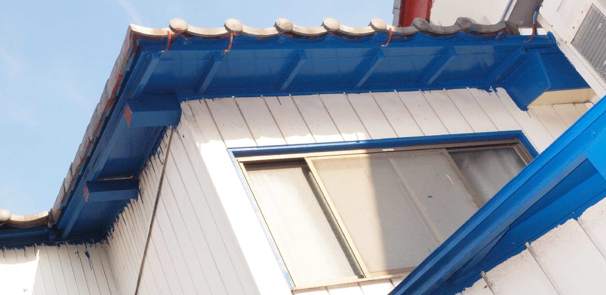 | 85. 平成25年塗装中 1階南側軒天。 広小舞、水切り鉄板を塗装。 |