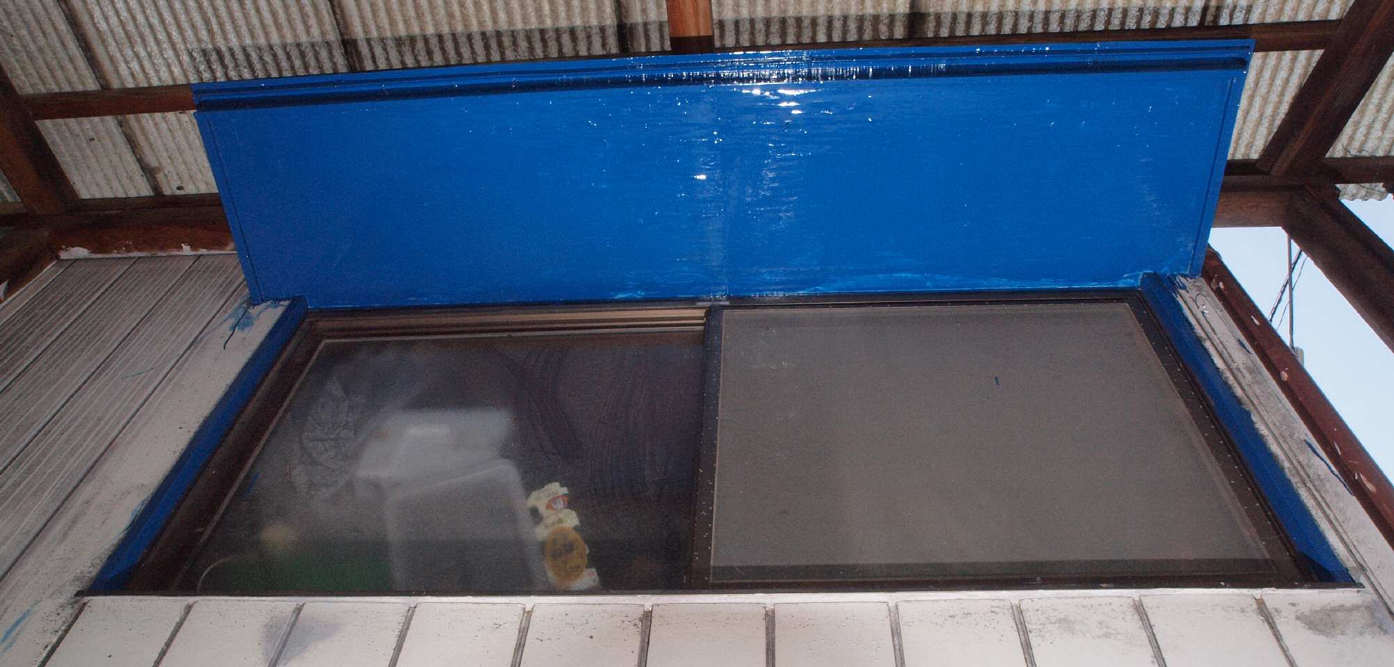 | 83. 平成25年修理中 1階南側軒天。4mmベニヤをボンドとビスで固定する。 |