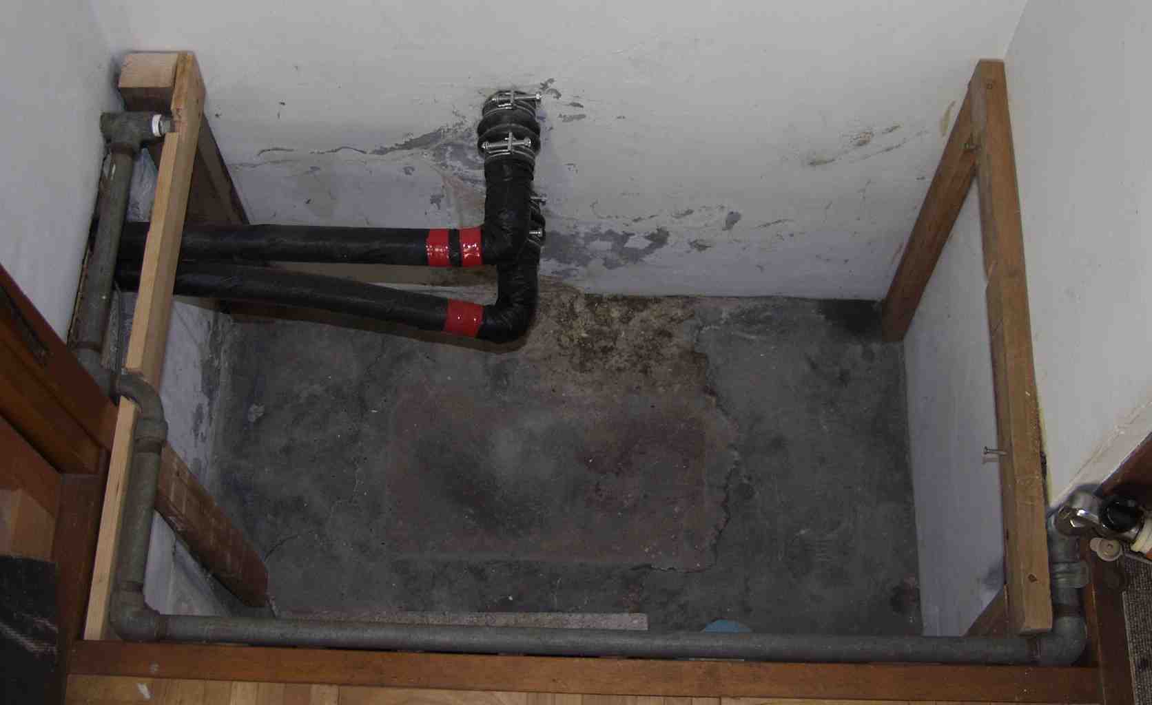 | 82.床張り工事。 ガス栓をとり、「メクラ」にする。床板を支える貫を造る。 下から十分支える事。 |