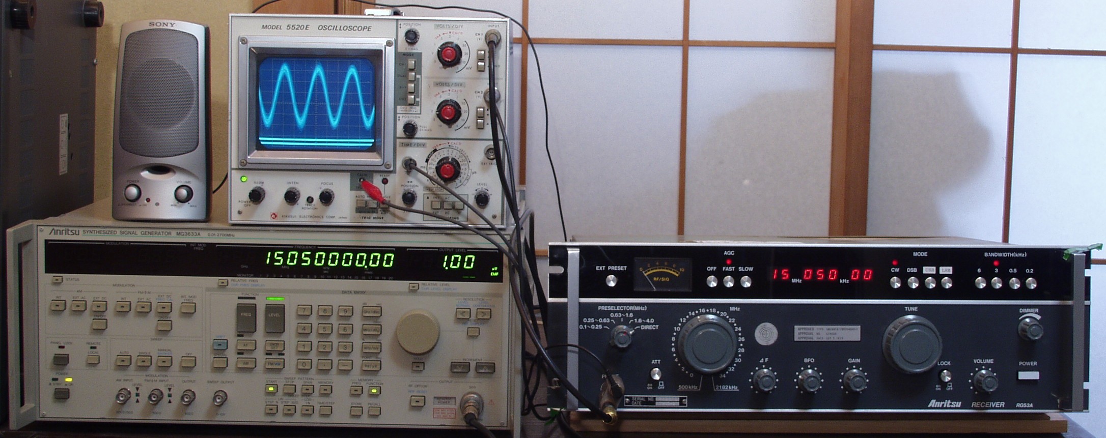 | F. 上位測定機器での調整・測定 KEN WOOD TS−940の測定は此方に有りますので比較して下さい F−1. 15MHZ感度測定 SSGより15.05MHZの1μVの信号をCWで受信 BFOを1KHZに調整して、SP出力を測定 |