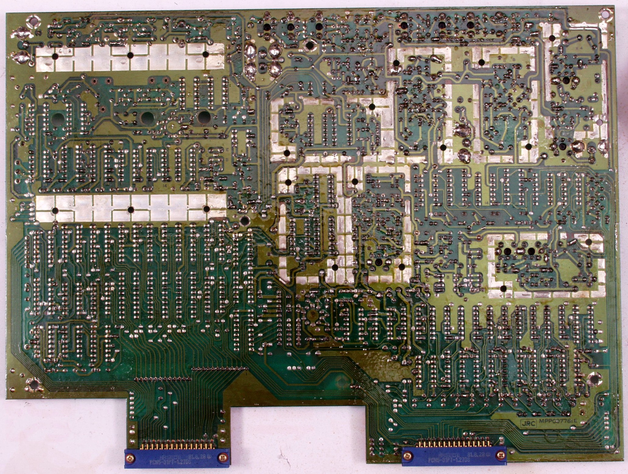 | C−6E. 修理中 シンセサイザー基板裏、シールドを外した所 |