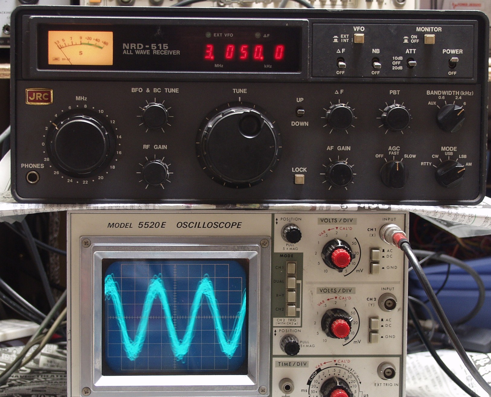 E−1. 測定・調整 上のSGより400HZAM50%変調の信号を受信し、ライン出力をオシロで観測、信号強度=2μV |