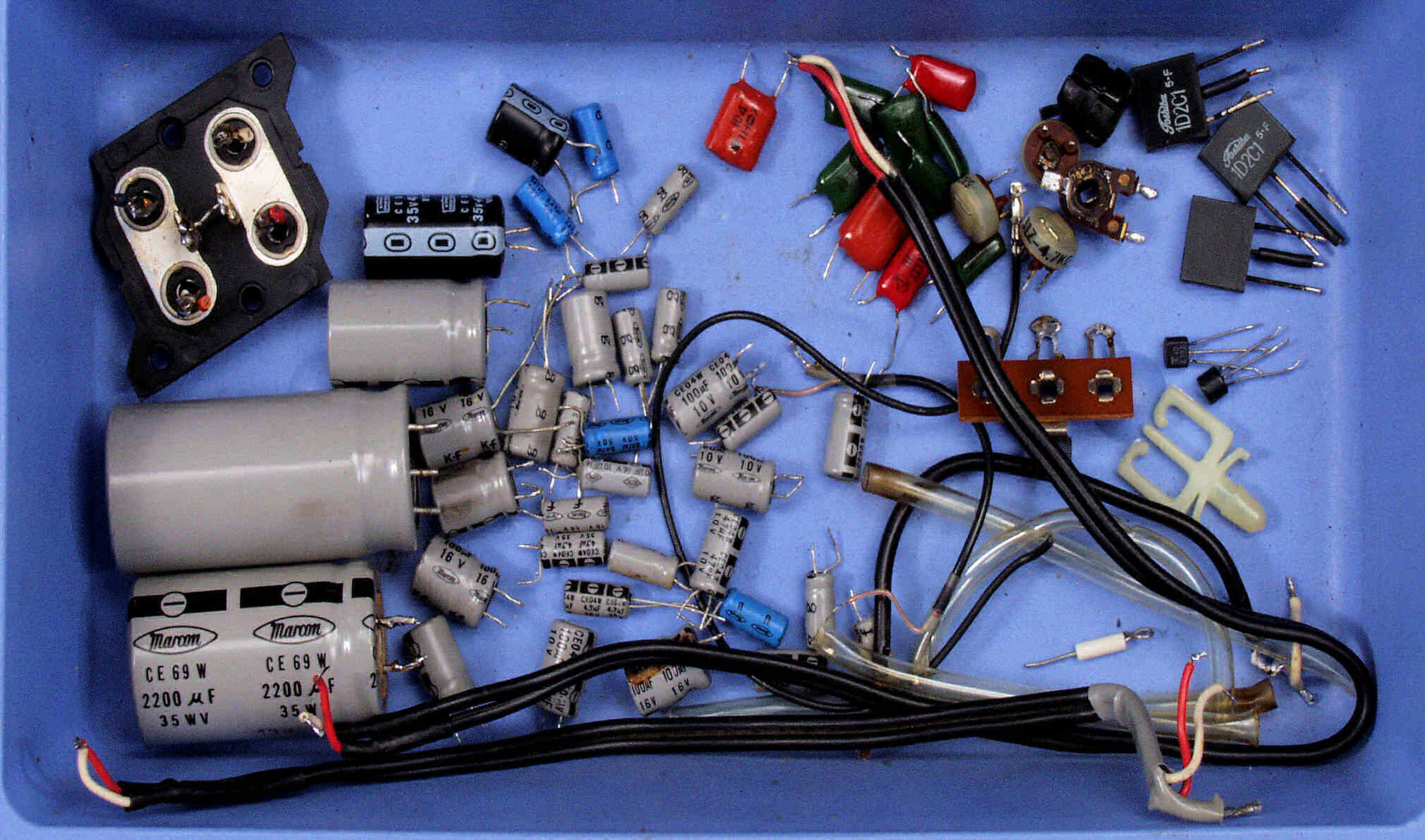 電解コンデンサー16個、フイルムコンデンサー9個、FET(電解トランジスター)2個、半固定VR3個交換