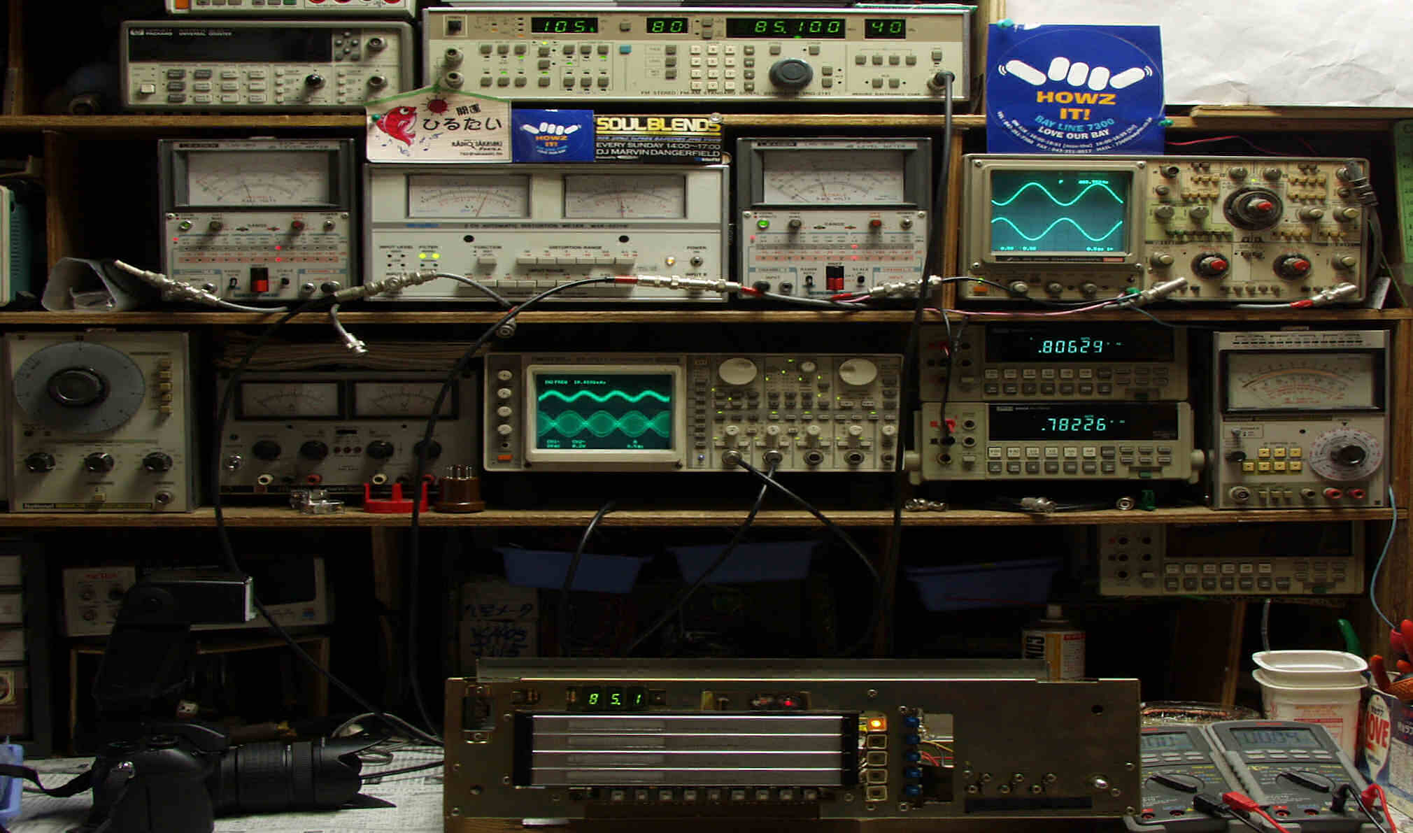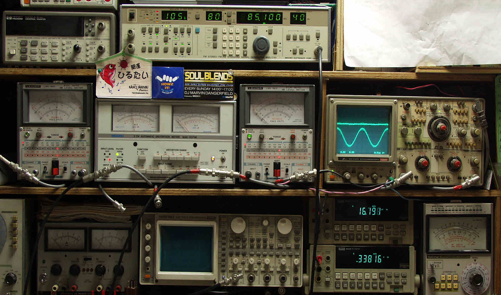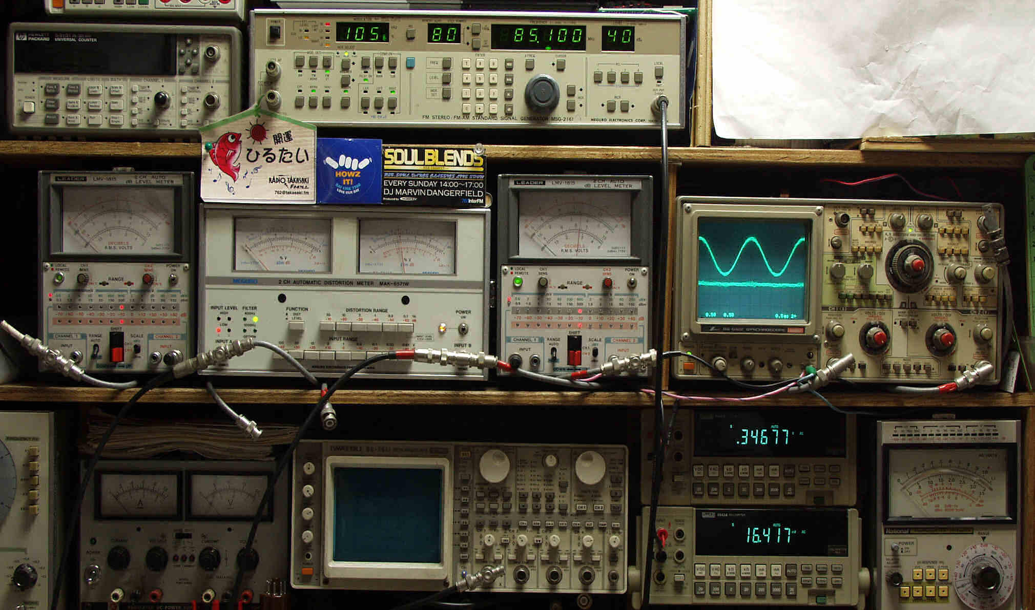 中段中左 歪み率計=出力の歪み率測定 左メータ=L出力、右メータ=R出力