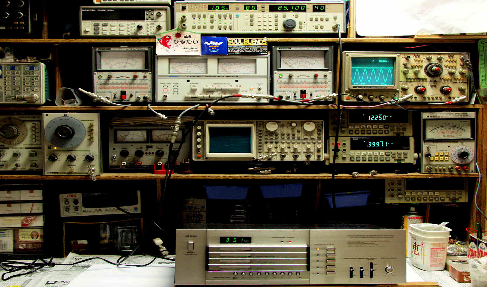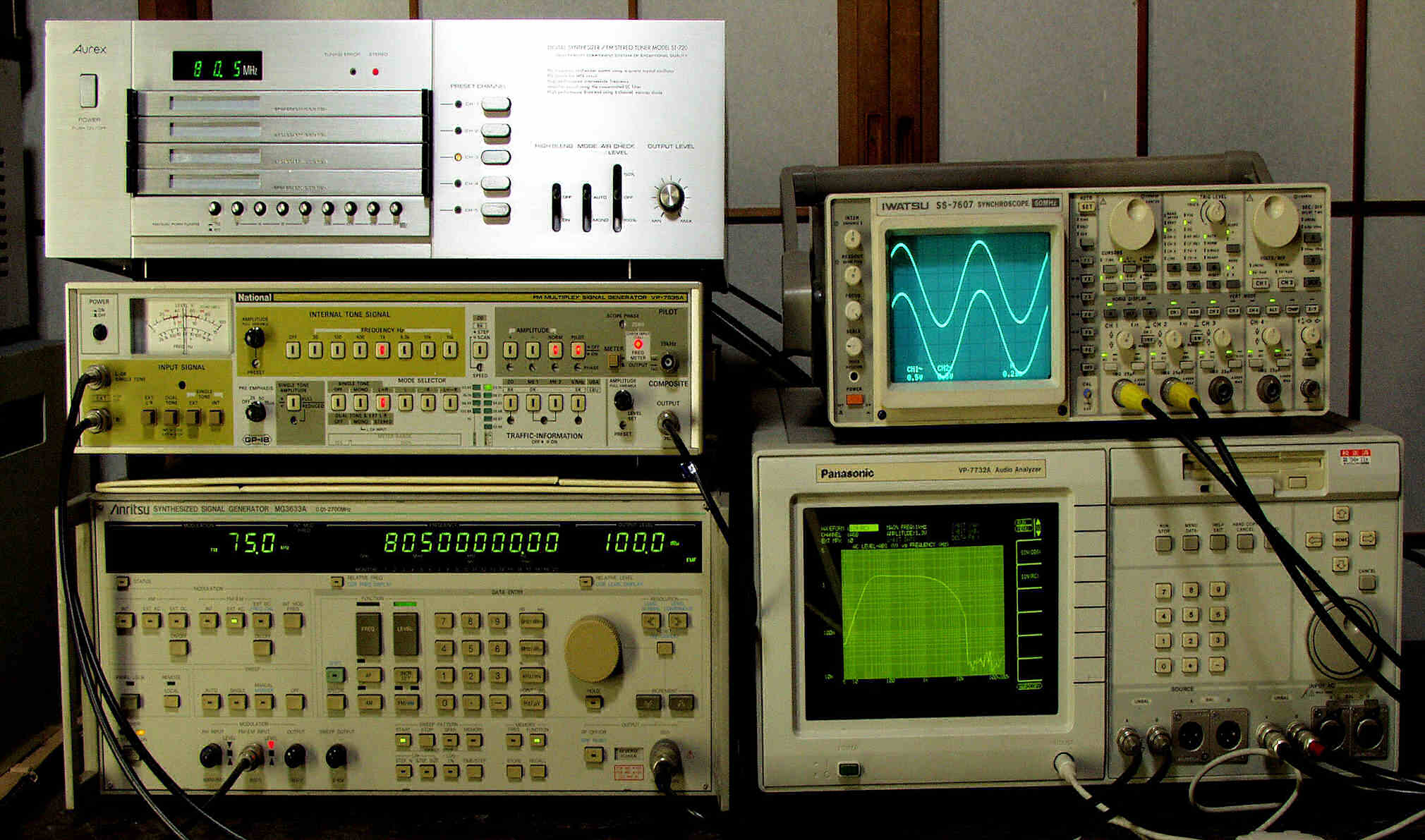 最上段のFMステレオ信号発信器より、85.1MHZで、400HZ(1KHZ)の変調信号を、40dBで出す。これを受信し出力を測定する