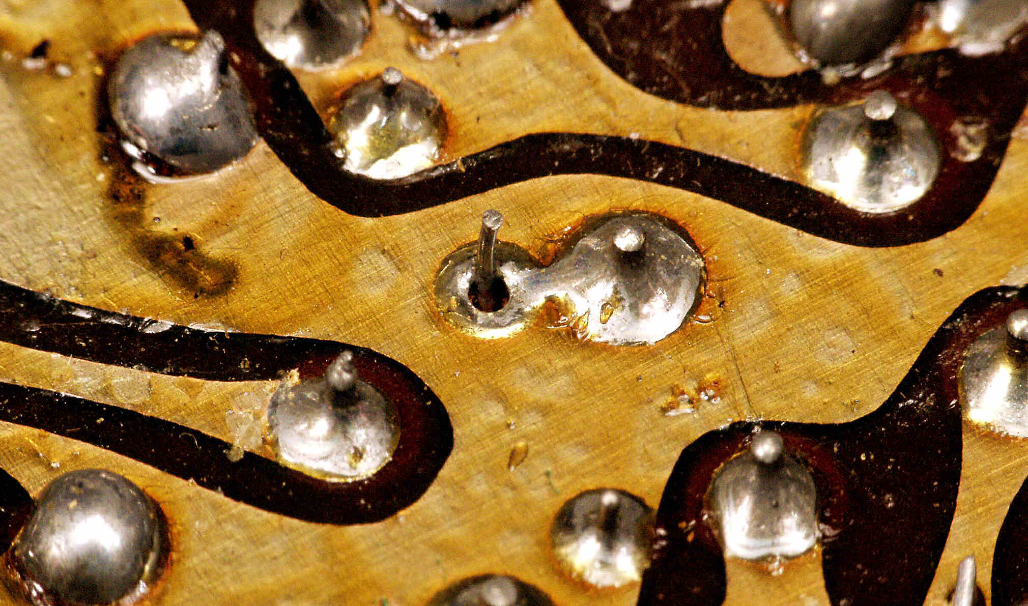 CAE. 完成ピンボードメモリー基板裏。余分なフラックスを落として、コート液を塗る。