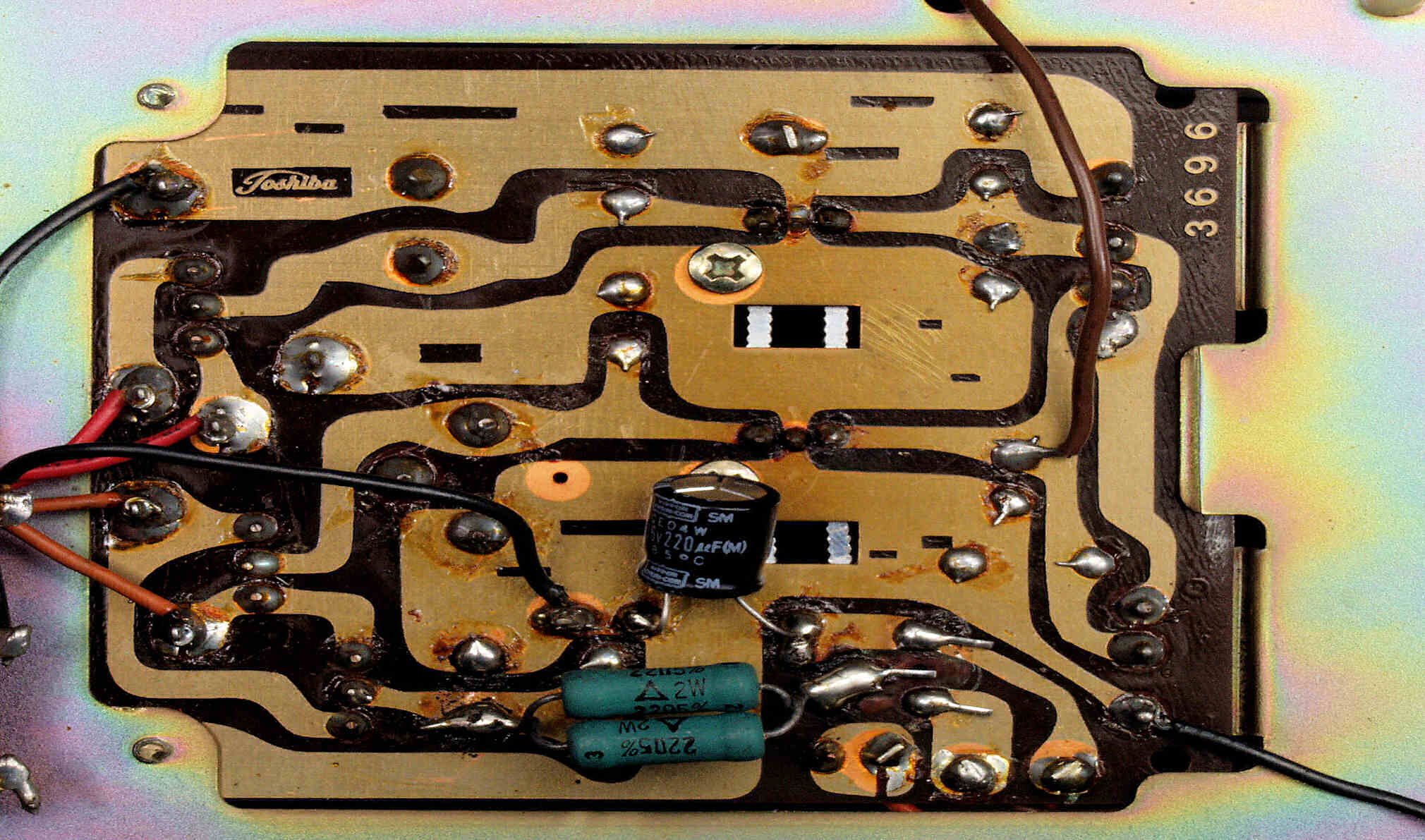 C1D. 修理(半田補正)後 電源基板裏、電解コンデンサーは表に移動。
