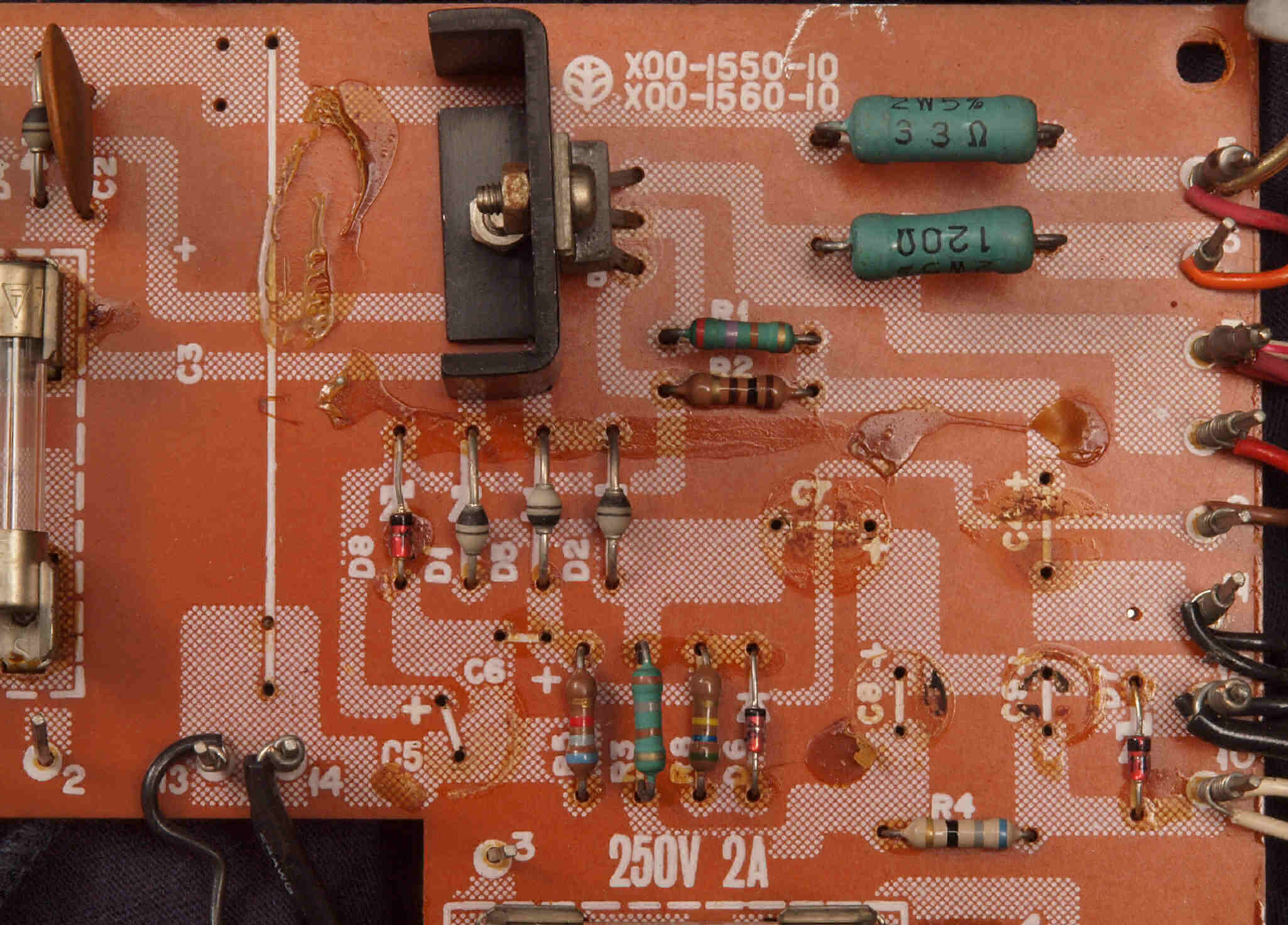 C63. 修理中 電源基板。  トルエン溶媒の接着剤を取り去り、コートを塗布後。