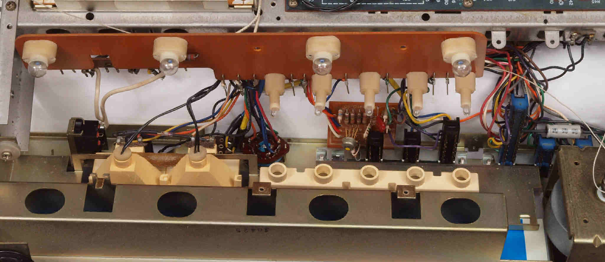 表示LED、 左端=変調度、 中左=メモリNo、 中右=出力周波数、 右端=出力レベル。