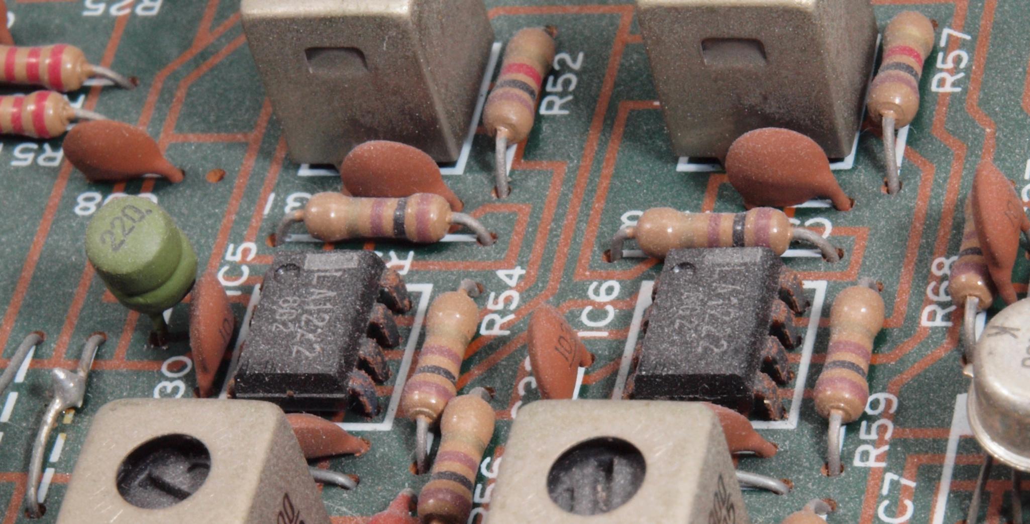 A62. 点検中 MPX基板の足黒IC−2、左上は磨いてある。磨くより交換の方が安心確実。