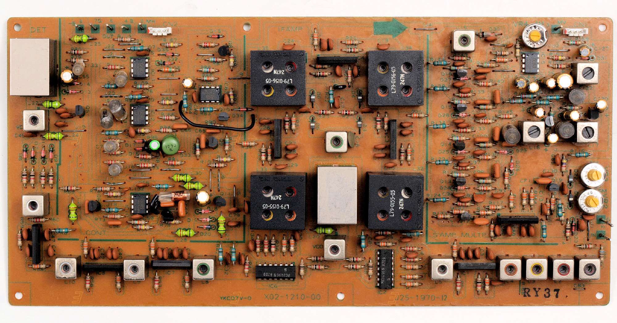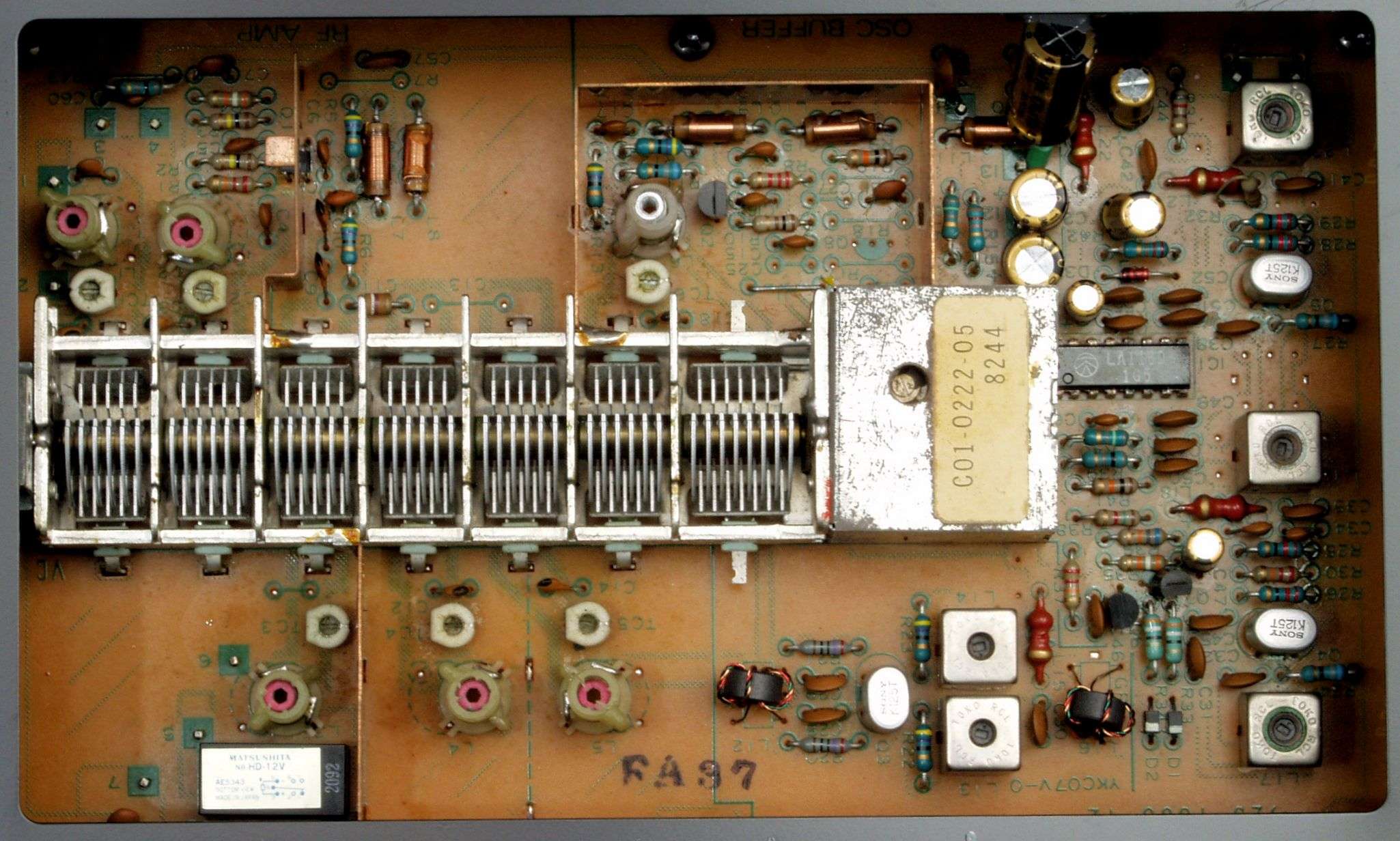 | C31. 修理前 RF−MIX基板、「周波数直線高精度7連バリコン」を採用。 左2番目が局発に1段同調バッファー。 左端がフロントエンドIF・AGC 、オールプッシュプルのフロントエンドIF増幅。 |
