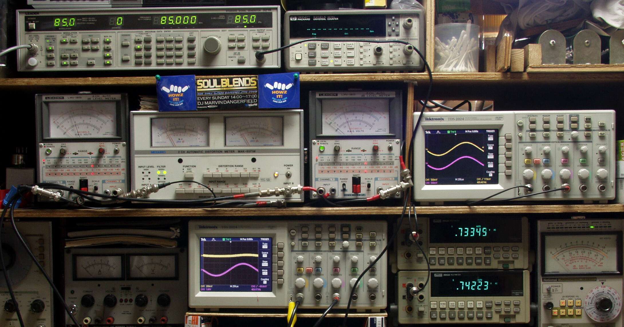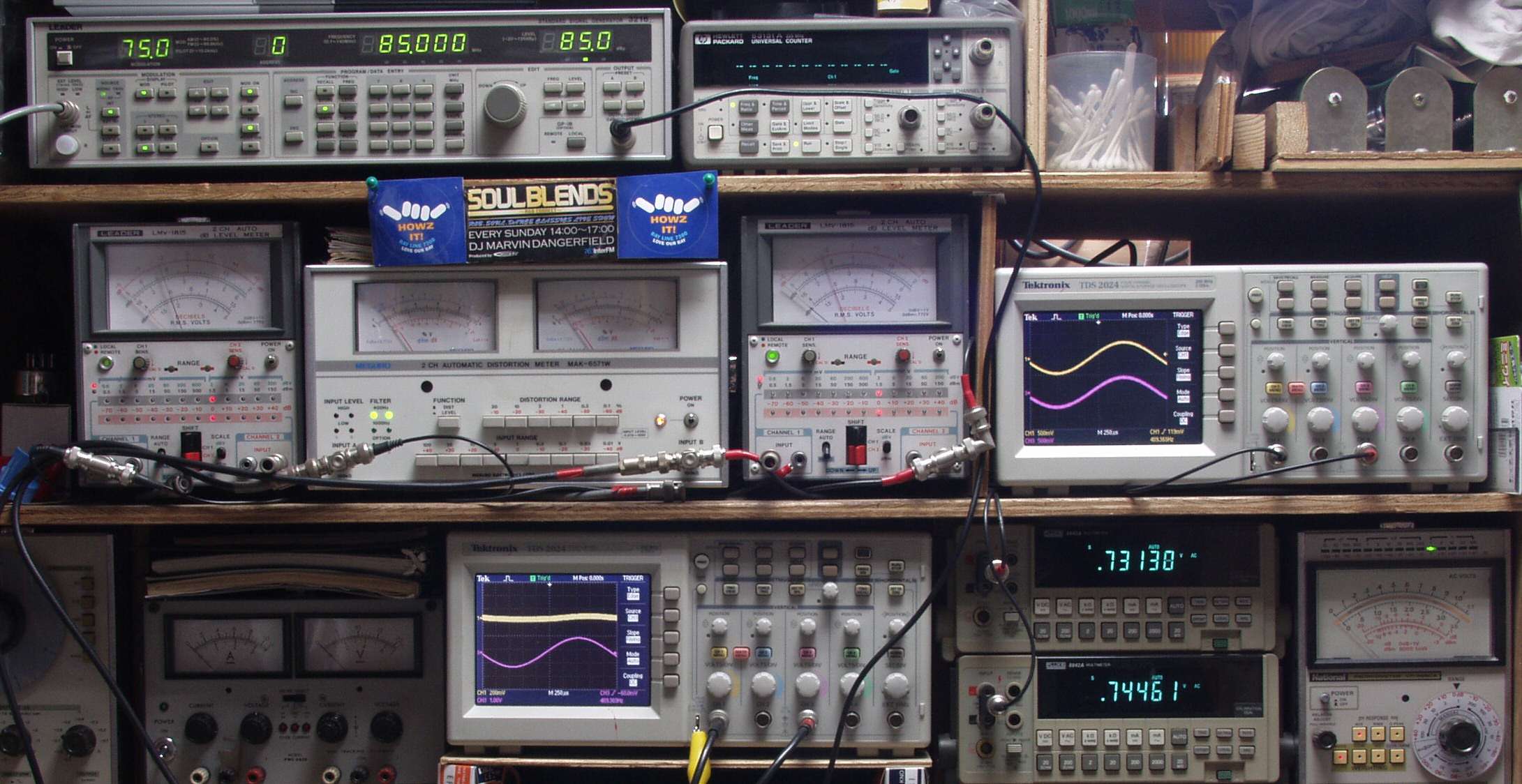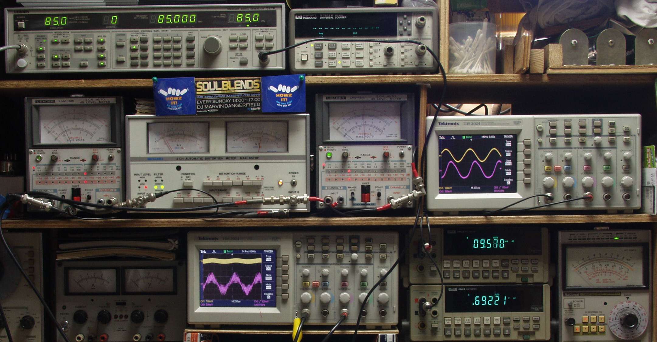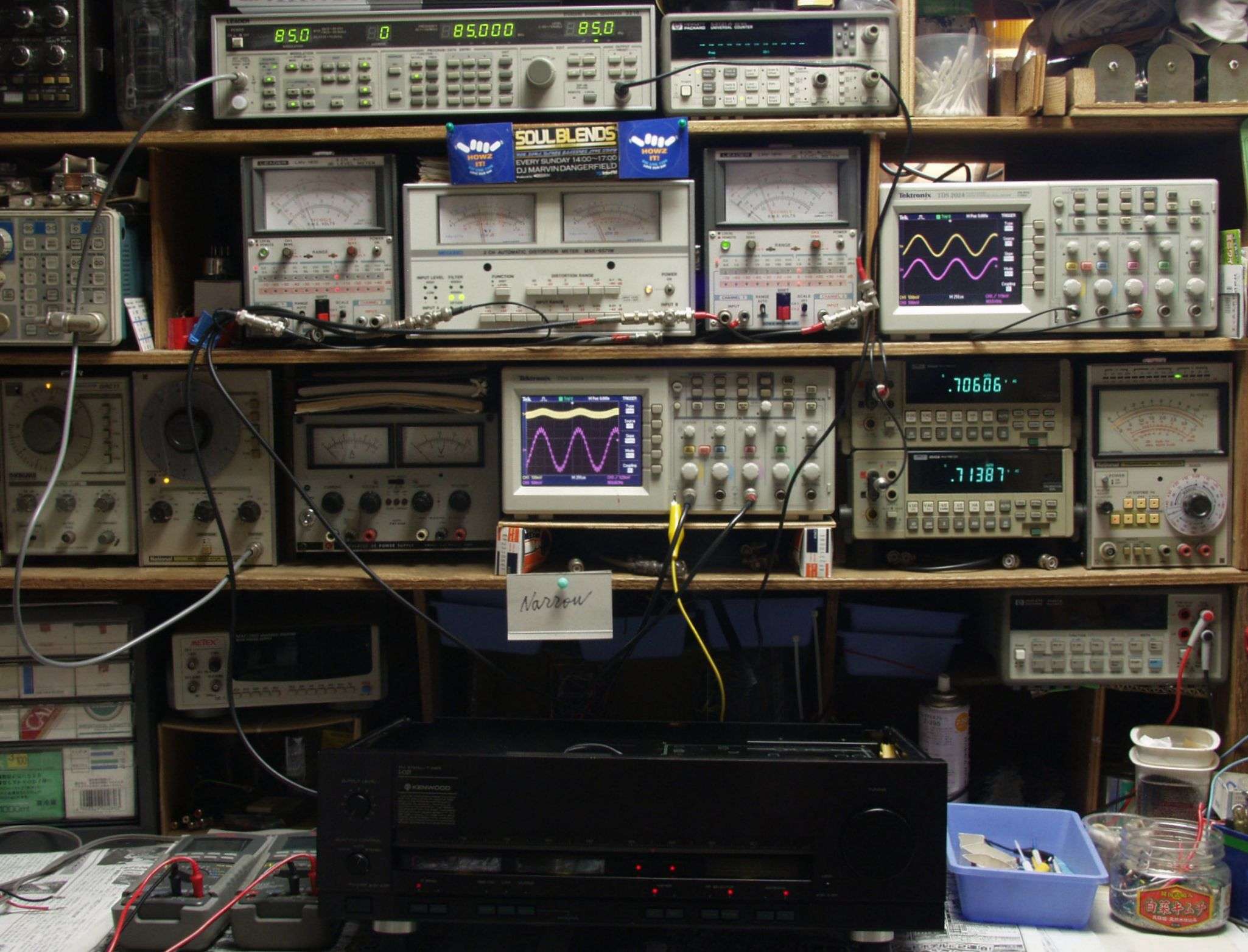 | E. 調整・測定 FM受信感度、RL分離測定調整 <見方> 上のFMステレオ信号発信器より 85MHZで 400HZ & 1KHZの 変調信号を 85dBで出す これを受信し出力を測定する。 中左端電圧計=L側出力電圧測定、黒針のみ使用。 中中左歪み率計=出力の歪み率測定 左メータ=L出力、右メータ=R出力。 中中右=R側出力電圧測定、赤針のみ使用。 中右端オシロ=出力波形 赤色=R出力、黄色=L出力。 下中=オシロ=H&V出力波形 上=H出力、下=V出力。 下中右上デジタル電圧計=出力電圧測定R、下中右下デジタル電圧計=出力電圧測定L。 |