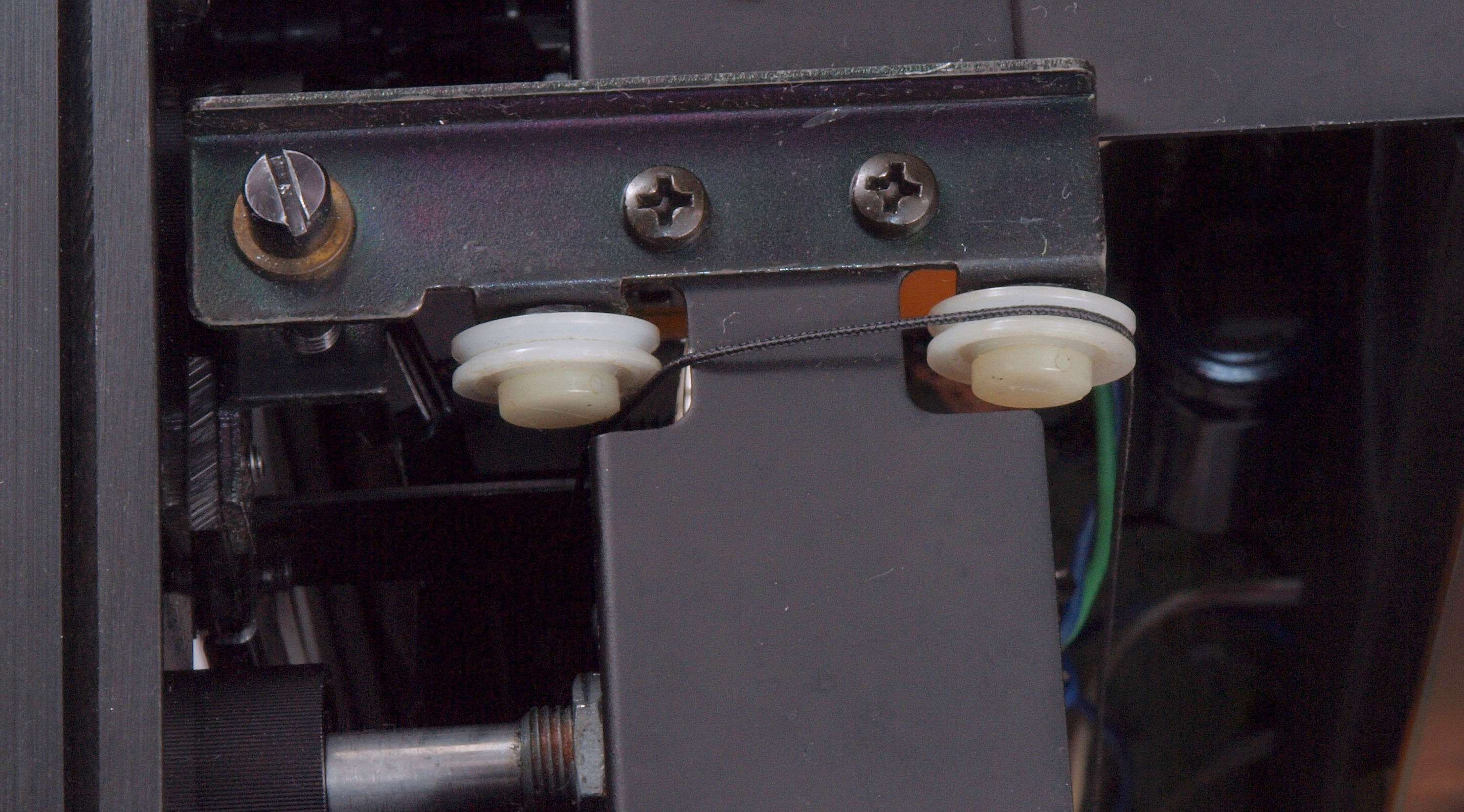 | A44. 点検中 駆動の糸が、プーリから外れている! 右のプーリの軸も曲がっている! |