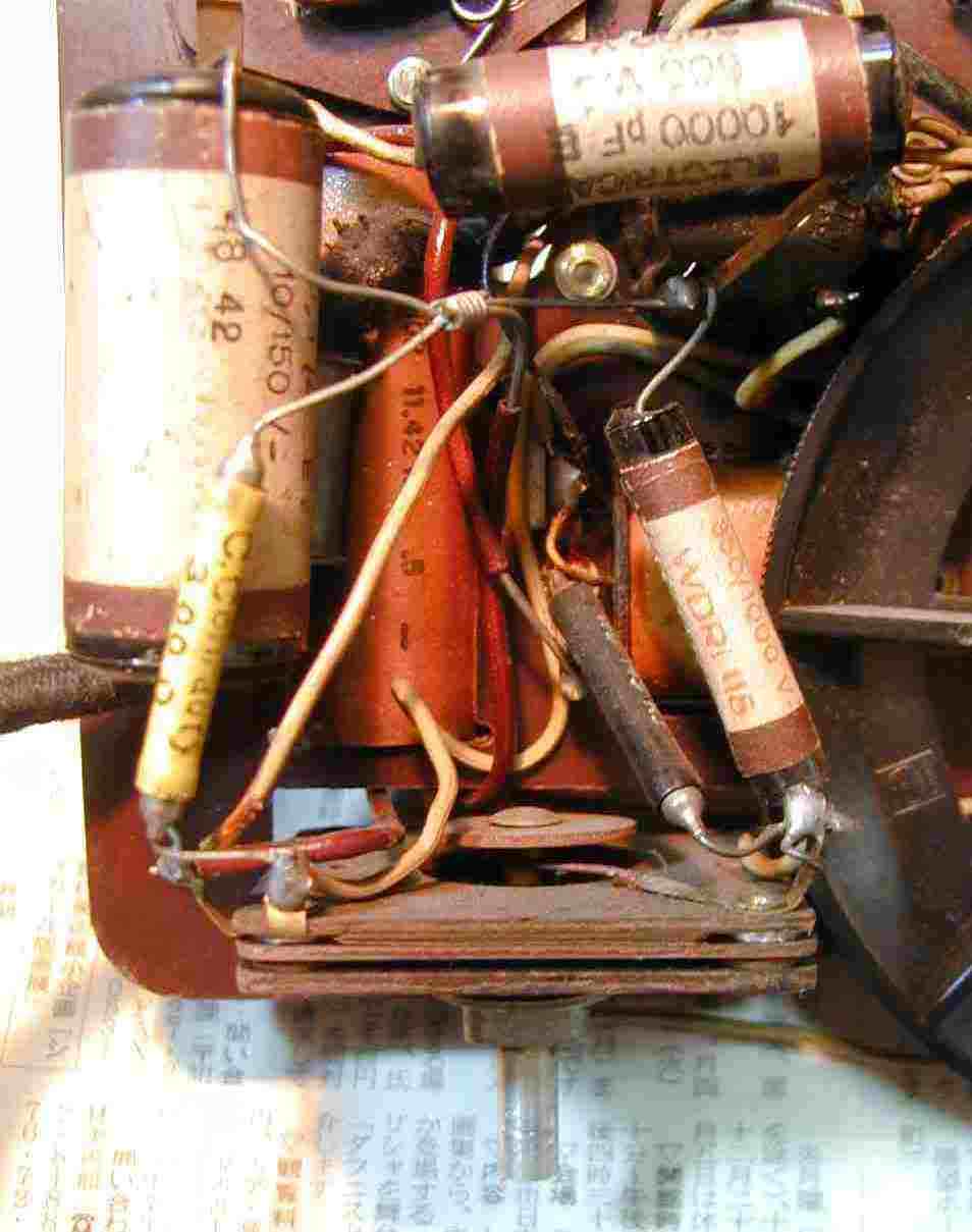 7.左端が同調コイル、真ん中の大きいのが平滑抵抗、右端が平滑用コンデンサ−