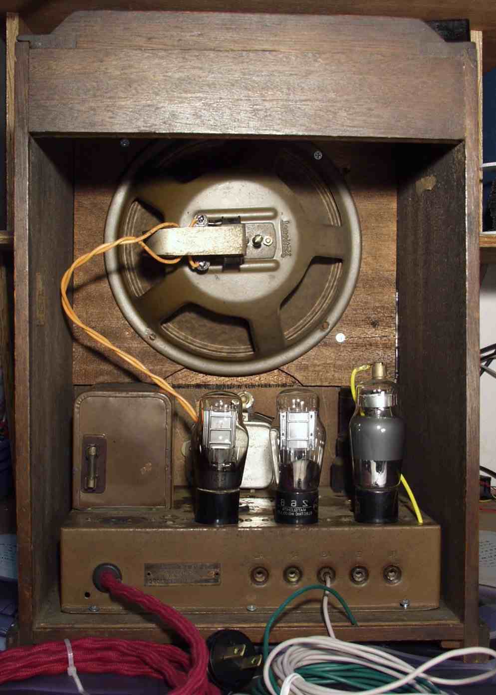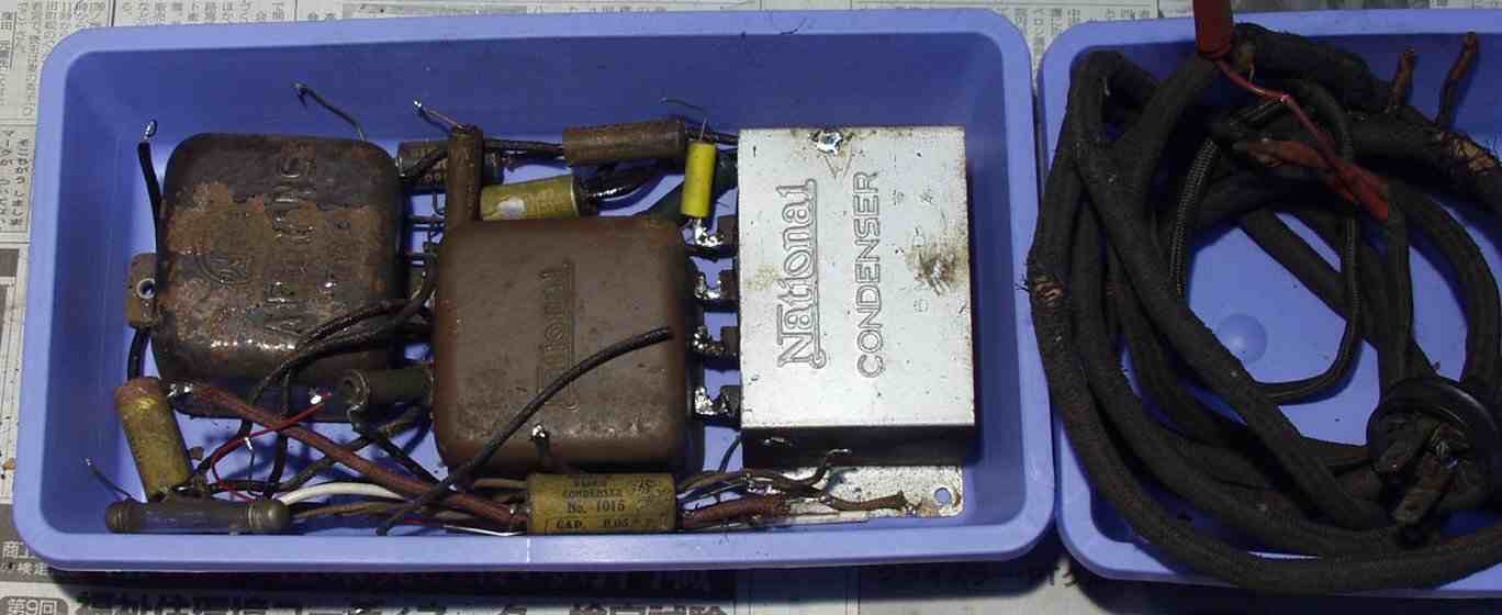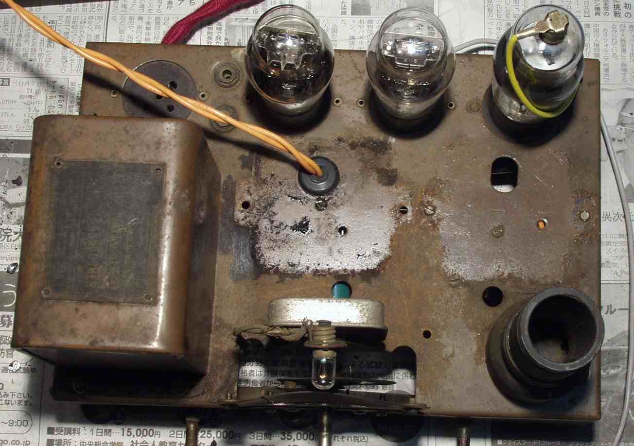 C−4.修理前 シャシ上から見る  左=電源トランス 中=チョウクコイル=切れてる 右=段間トランス=切れてる